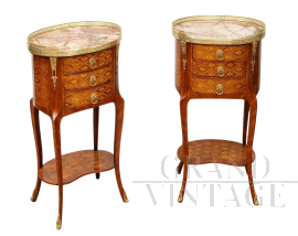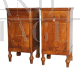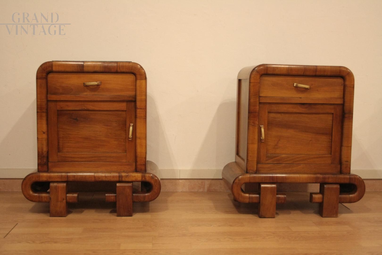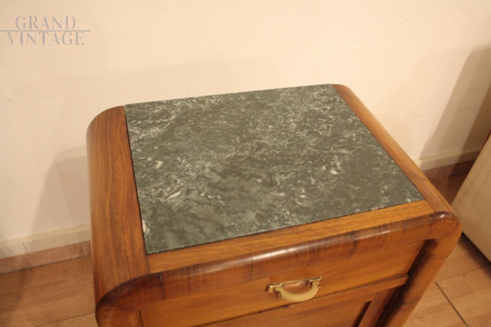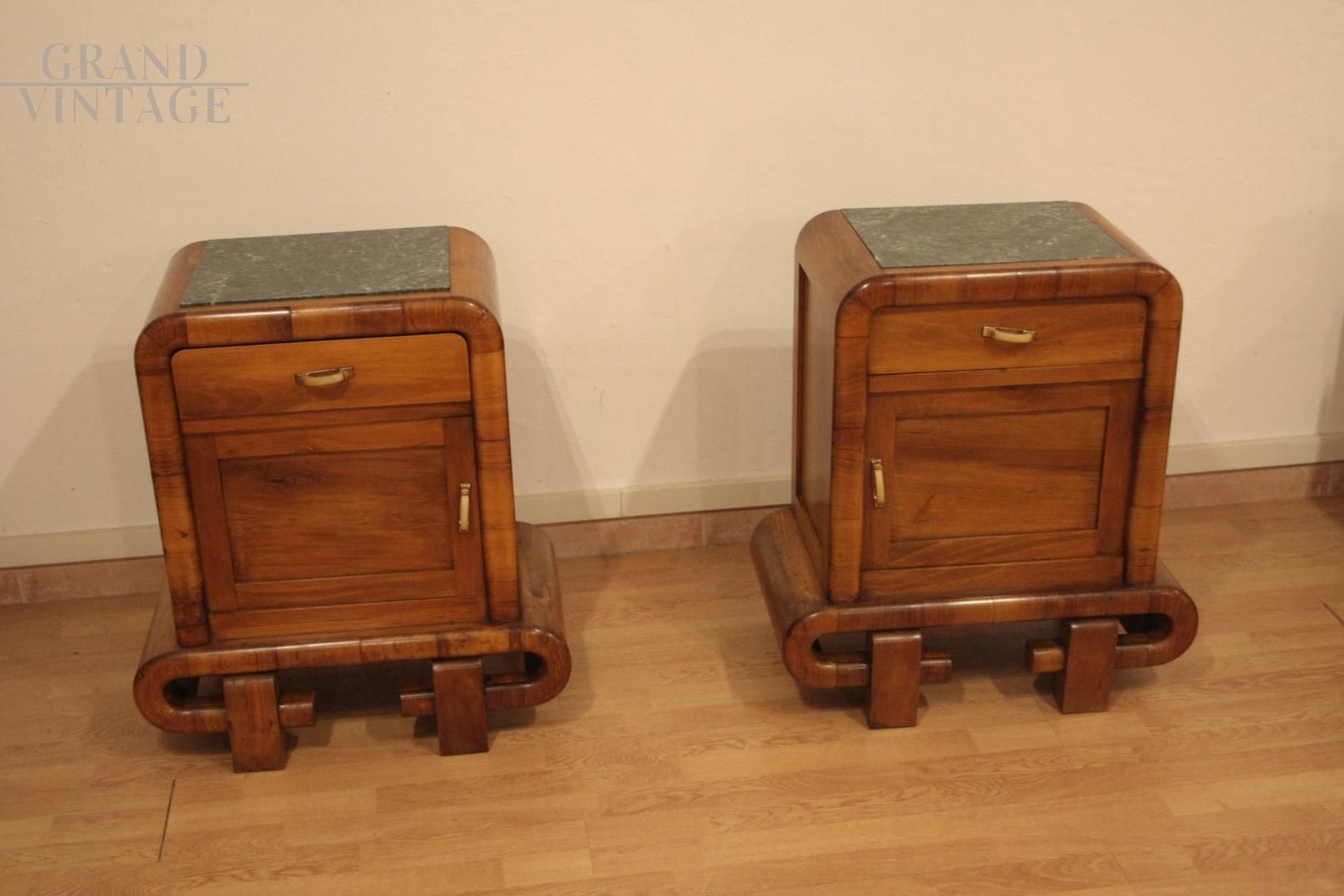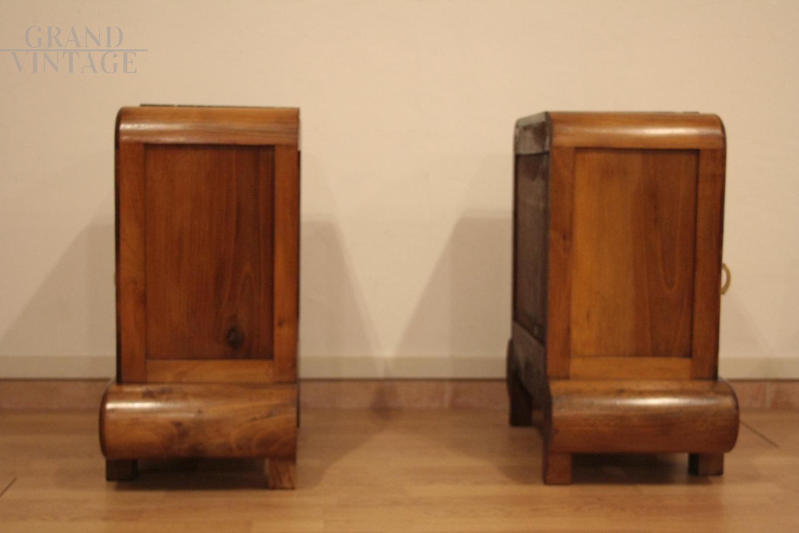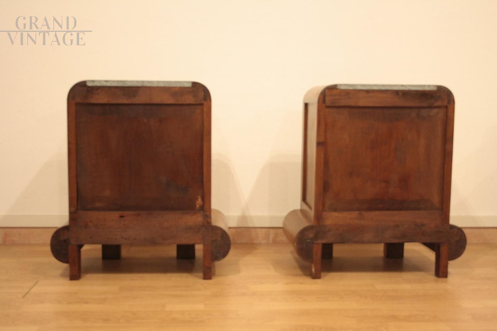 Splendida coppia di comodini in noce massello. Realizzati negli anni cinquanta del novecento in stile Art Decò, questi pezzi sono veri e propri esempi di mobilio Mid Century. La loro eleganza si distingue per la linea tipica dei mobili Decò, caratterizzata da una base molto particolare e lavorata, un elemento non frequentemente riscontrabile nella qualità dei mobili di metà secolo. Questi comodini presentano un profilo moderno che riflette il design distintivo di quell'epoca, completato da un piano in marmo superiore che è in condizioni di conservazione ottimali, così come il resto del mobile, autentico in ogni sua parte. Le maniglie, anch'esse originali, sono realizzate in ottone con dettagli in finto avorio, aggiungendo un tocco di raffinatezza e classe.