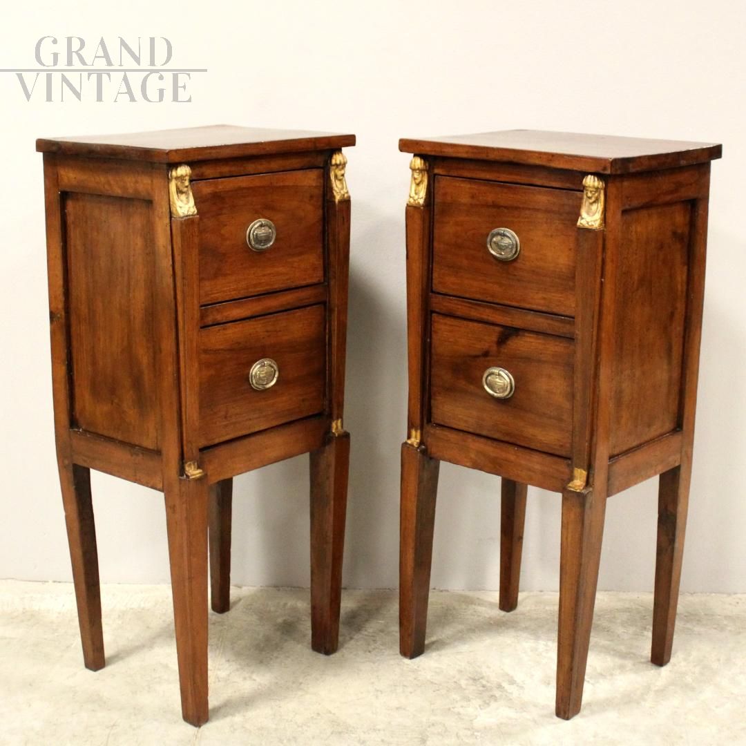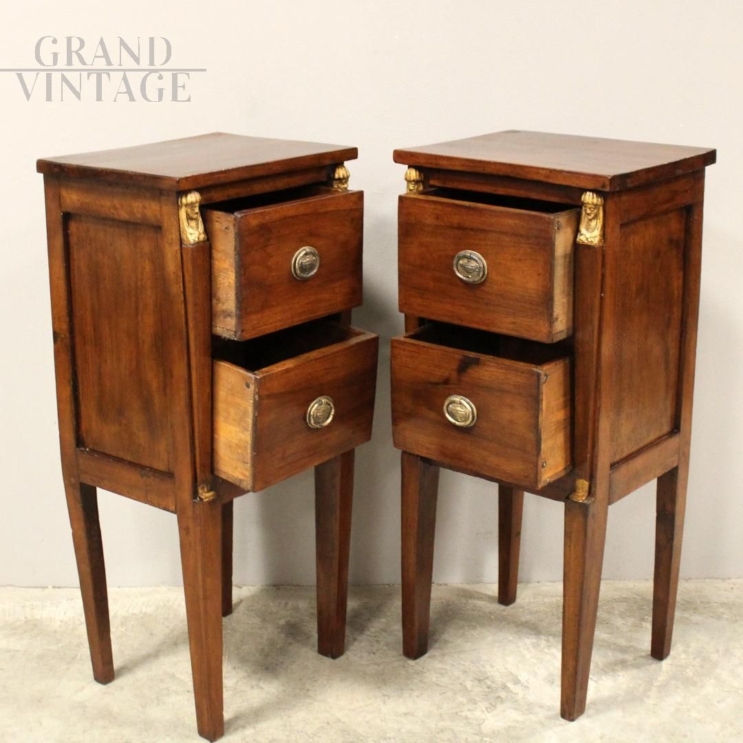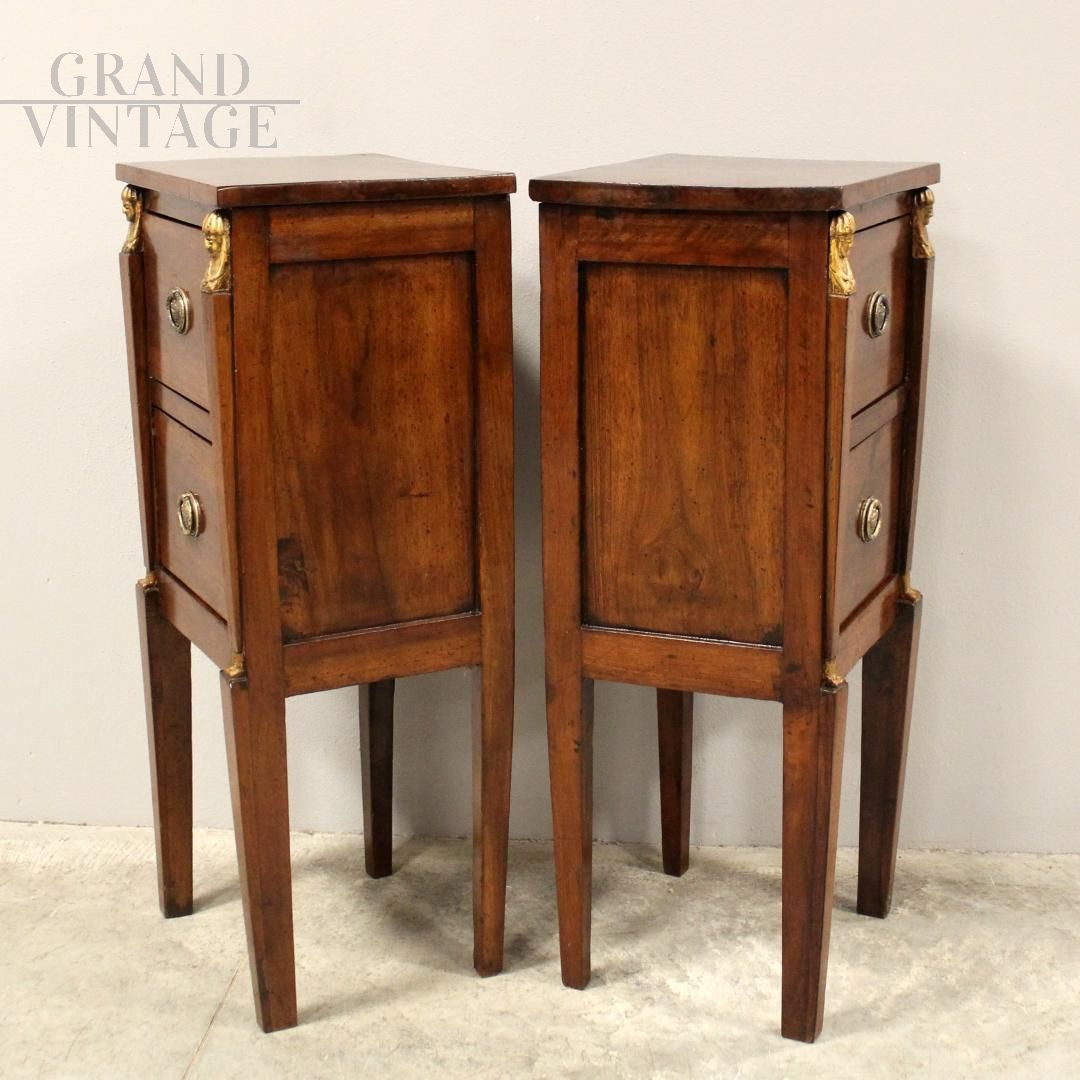 Coppia di comodini antichi di epoca Direttorio in noce massello con decorazioni in bronzo cesellate con busti in stile Retour d'Egypte, Italia 1798-1805. Restaurati.