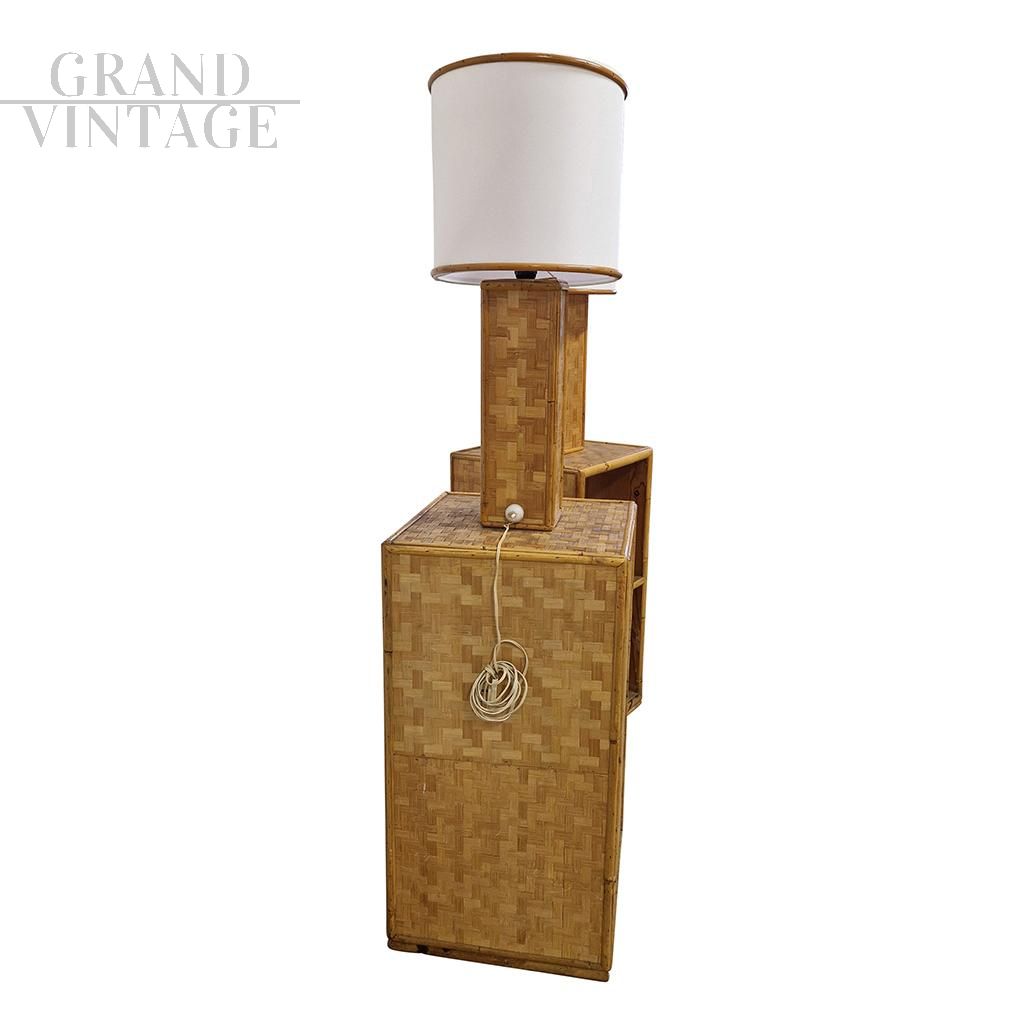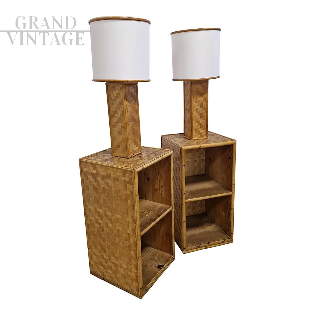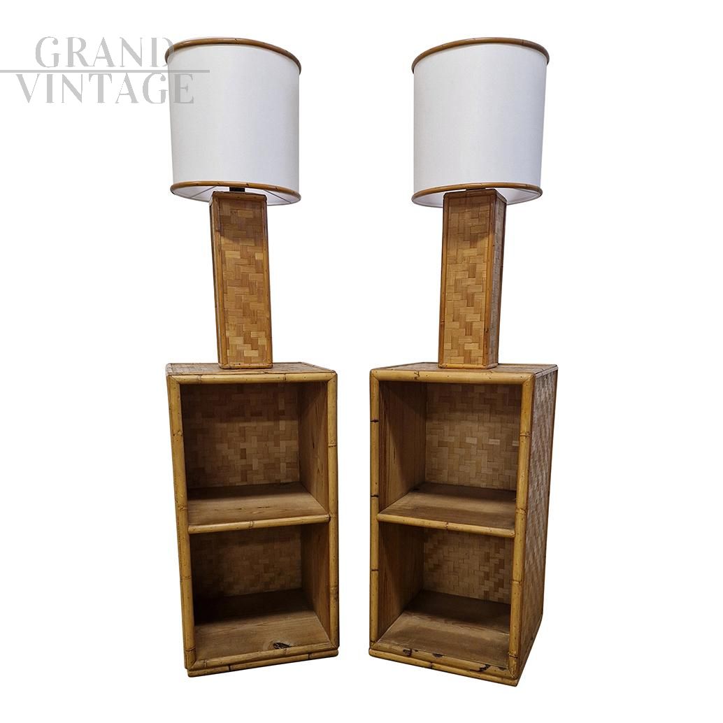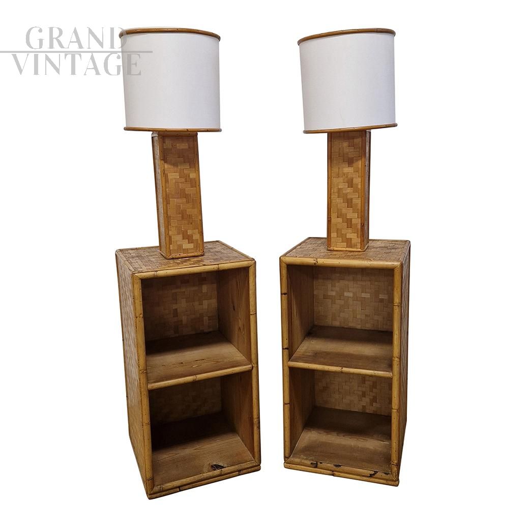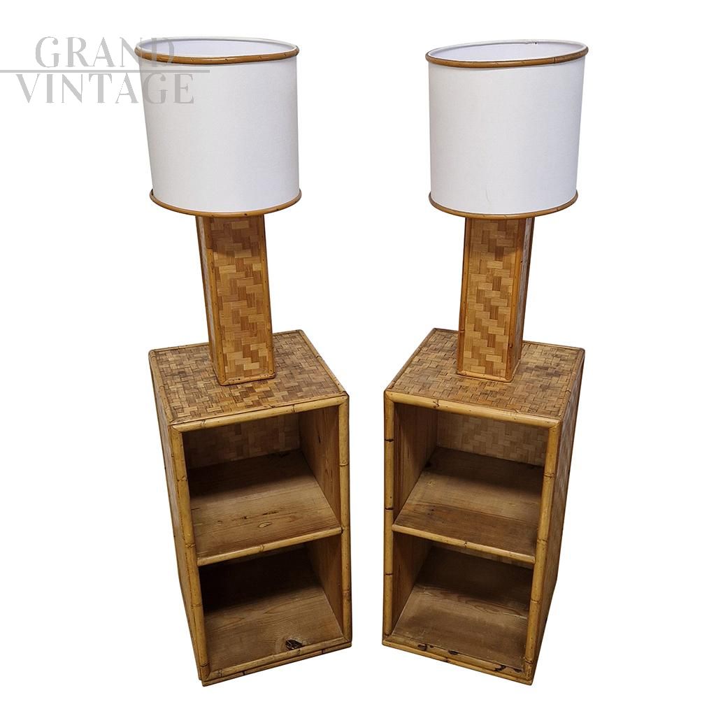 Coppia di comodini in bamboo e rattan intrecciato con ripiani a giorno e lampade abat-jour incorporate in bamboo e rattan con paralume in tessuto bianco.