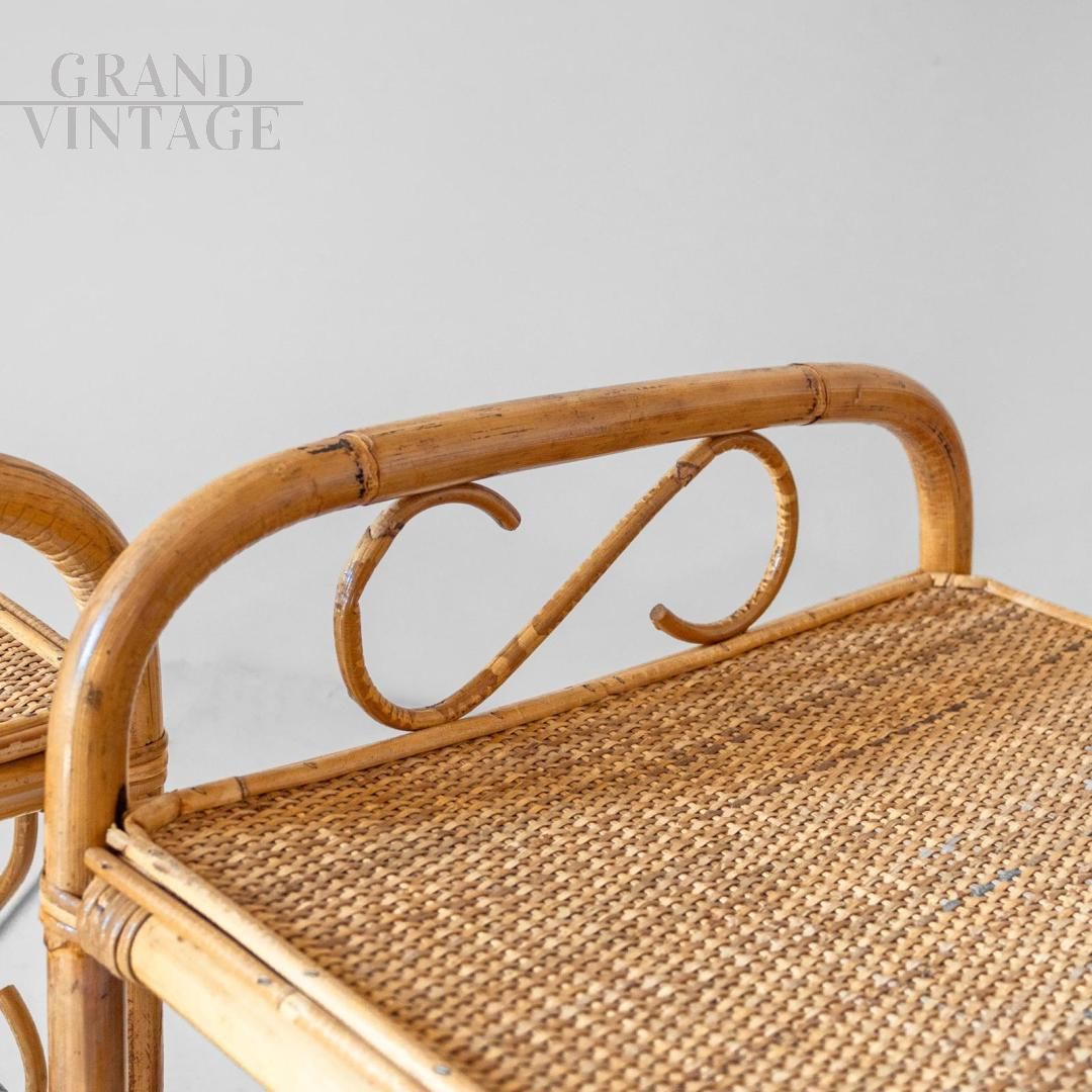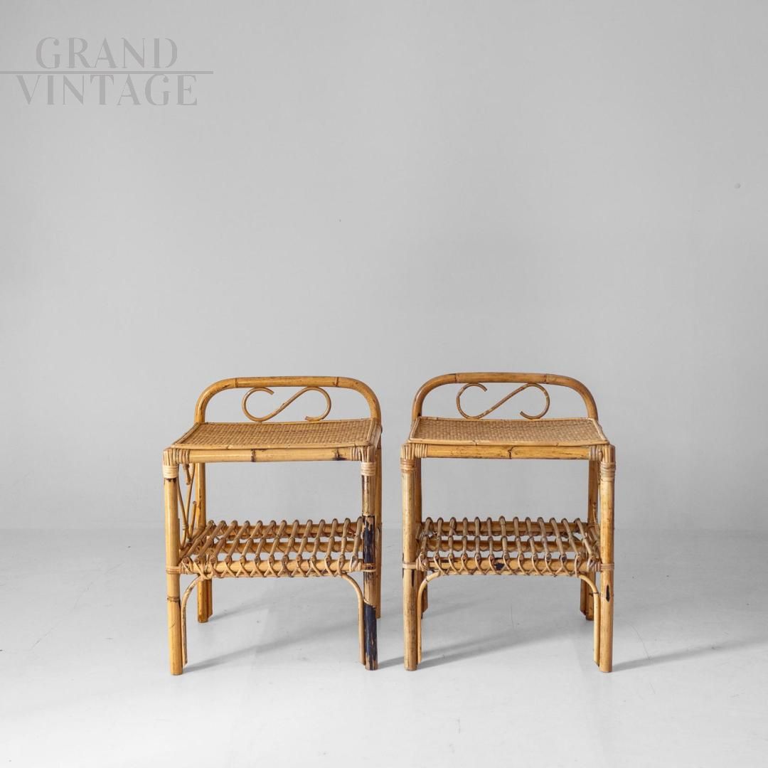 Coppia di comodini o consoles vintage in bamboo e vimini intrecciato, modernariato Mid-Century italiano anni '60, realizzati artigianalmente. Ogni pezzo presenta un piano in rattan intrecciato, una decorazione a volute in bambù con motivi a cuore e un ripiano inferiore che offre funzionalità e leggerezza. La finitura naturale esalta i toni caldi del bambù, creando un'estetica senza tempo che si adatta sia ad interni vintage che contemporanei. La coppia si presenta in buone condizioni generali, con solo lievi segni del tempo e di usura, ma strutturalmente solida e perfettamente funzionante.
