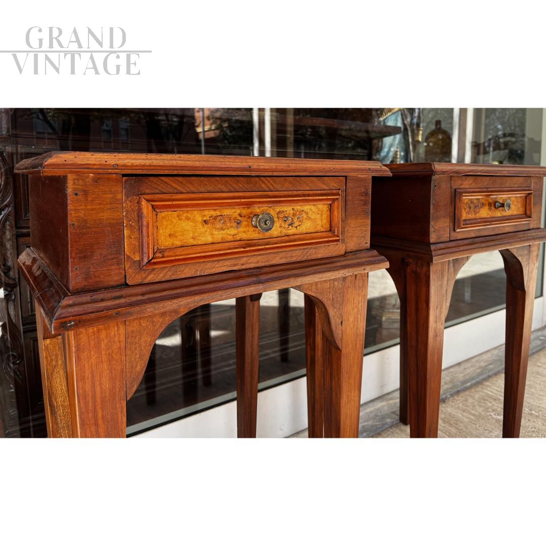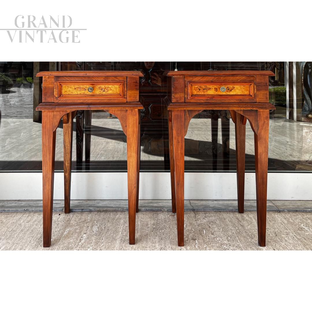 Coppia di comodini alti antichi di inizio '800 in legno di noce con cassettino in radica internamente rivestito, restaurati, utilizzabili anche come piedistalli.
