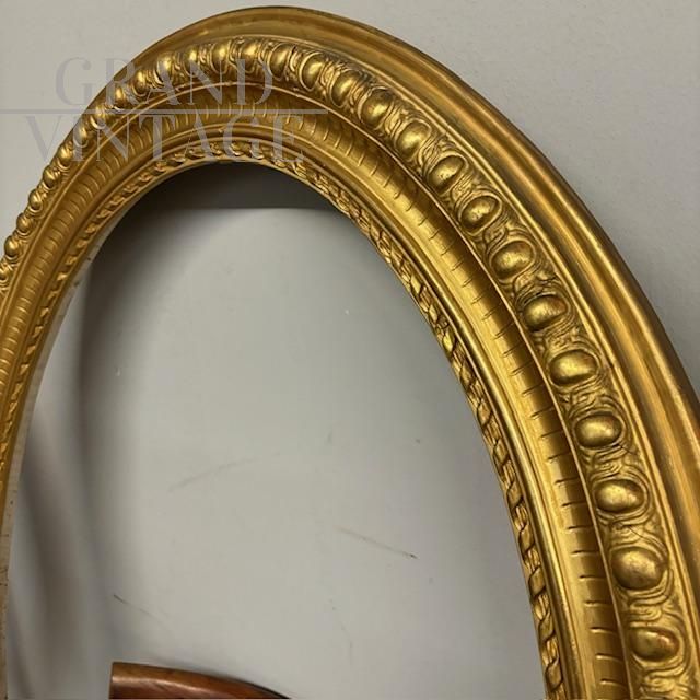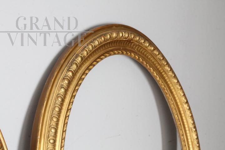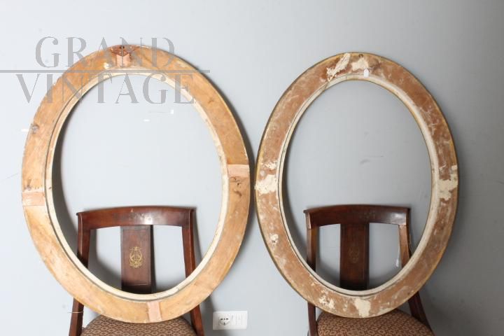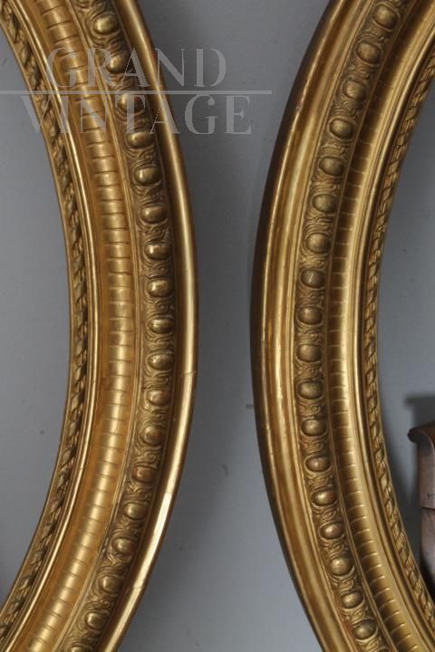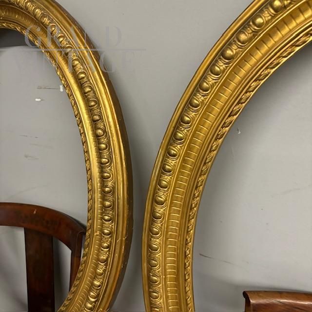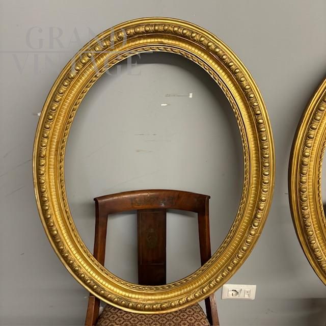 Coppia di cornici ovali antiche risalenti al 1840, dorate in foglia oro e arricchite da una splendida lavorazione a sbaccellata a vari livelli. In perfetto stato!
