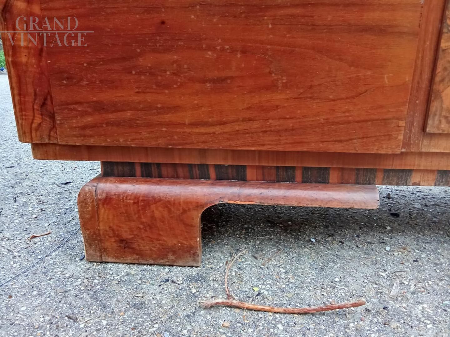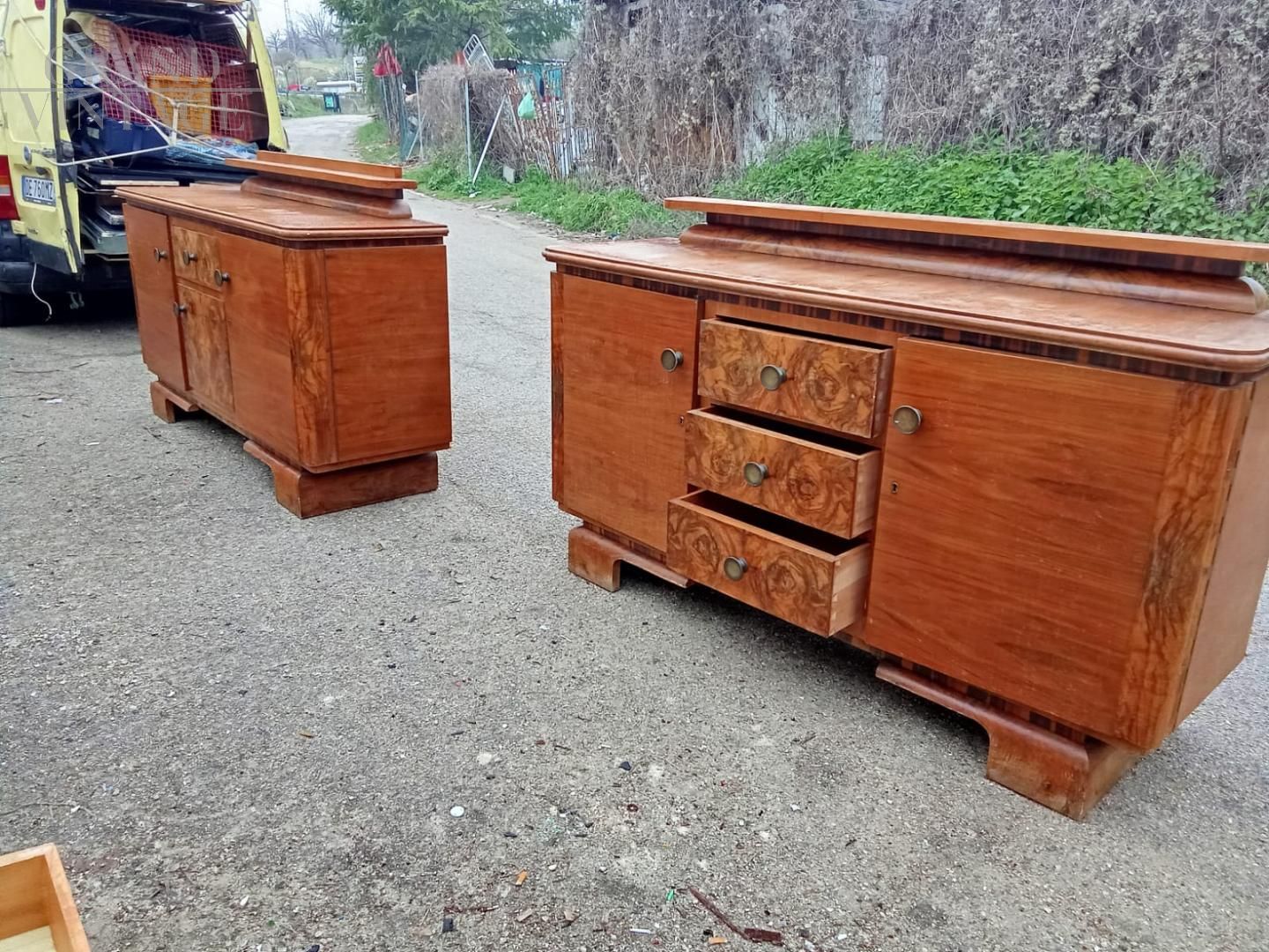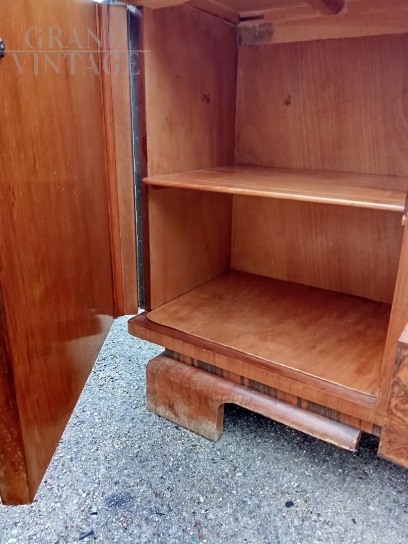 Meravigliosa e rarissima coppia di credenze Art Déco italiane degli anni '20 - '30, dal design di alta qualità, fatte completamente in legno massello, radica e piuma di noce. Sono composte da due sportelli laterali e cassetti centrali come da foto. Hanno laterali concavi in piuma di noce con filetto in radica più scura alla base e alla alzatina. Le maniglie in ottone sono originali così come le cerniere interne. Hanno bisogno soltanto di piccoli interventi di restauro e di lucidatura finale.