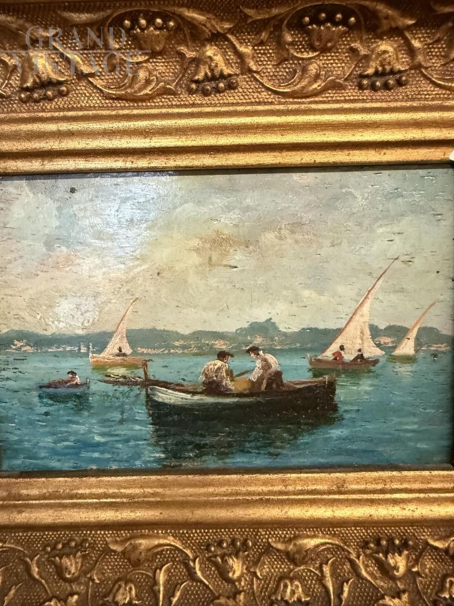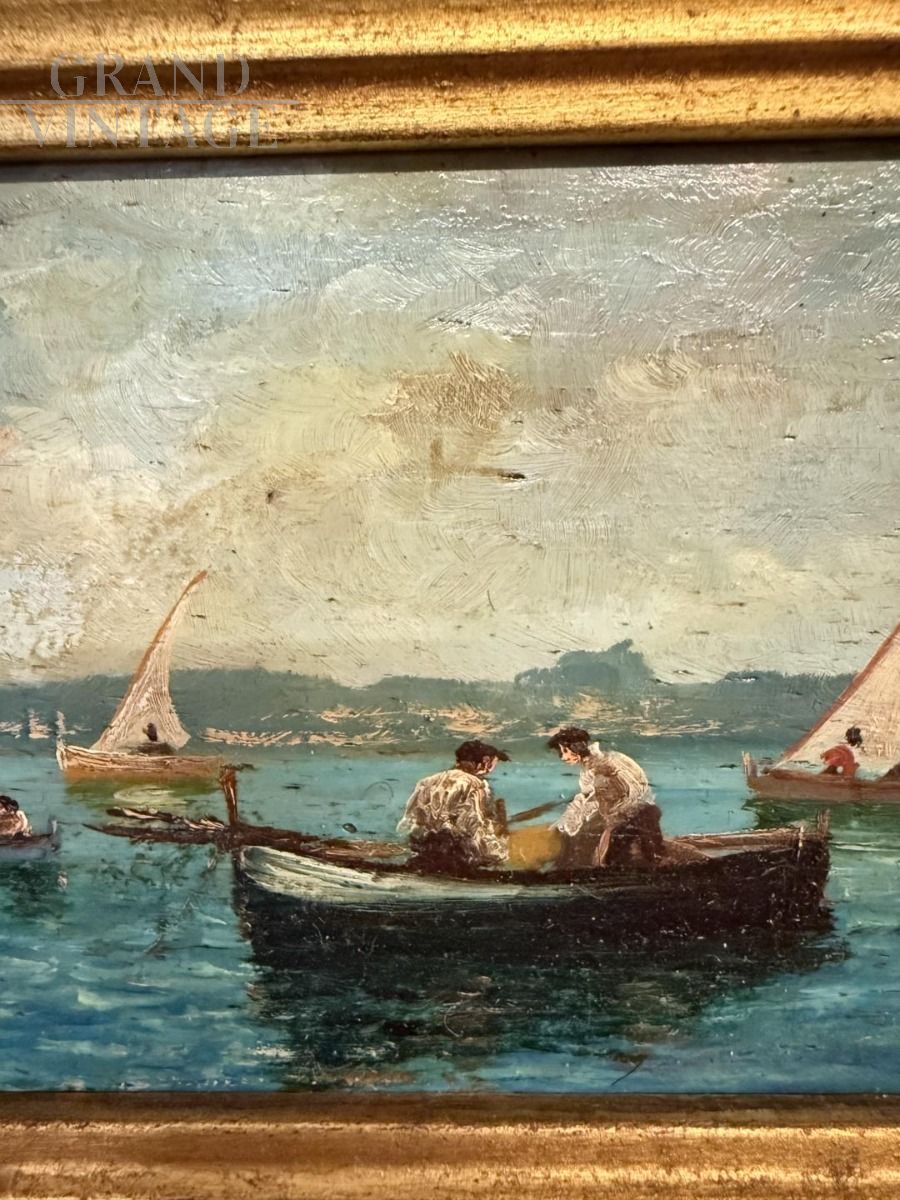 Coppia di dipinti antichi di scuola napoletana di fine '800, olio su tavola, raffiguranti paesaggi marini con barche e pescatori, completi di cornici antiche dorate.