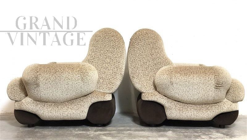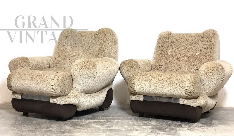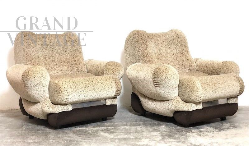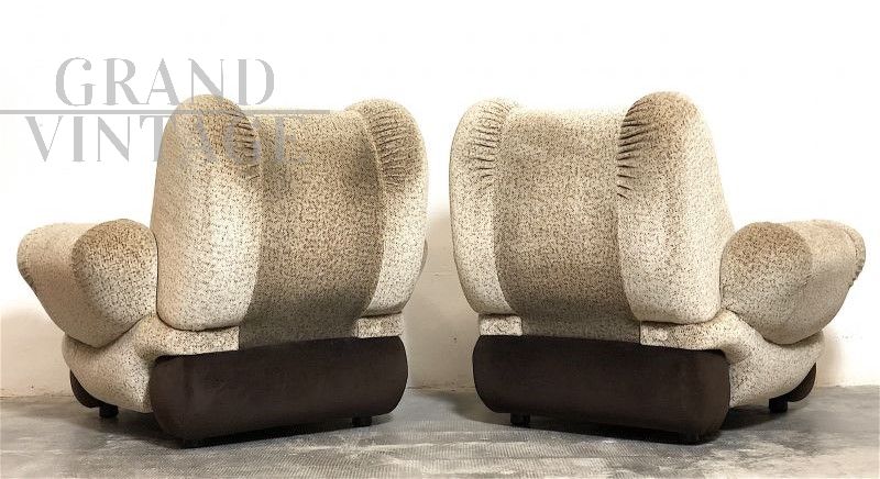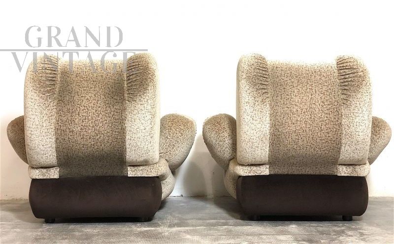 Coppia di grandi poltrone di space age, modernariato italiano anni '70, comodissime e avvolgenti. Le poltrone sono di manifattura Italiana, con struttura in legno, rivestimento in tessuto micro fantasia di colore Beige - Marrone, gli interni sono in materiale espanso. In perfette condizioni, completamente sanificate. Il design e la linea strutturale sono decisamente futuristici per i canoni degli anni '70, tale periodo è nominato Space Age.