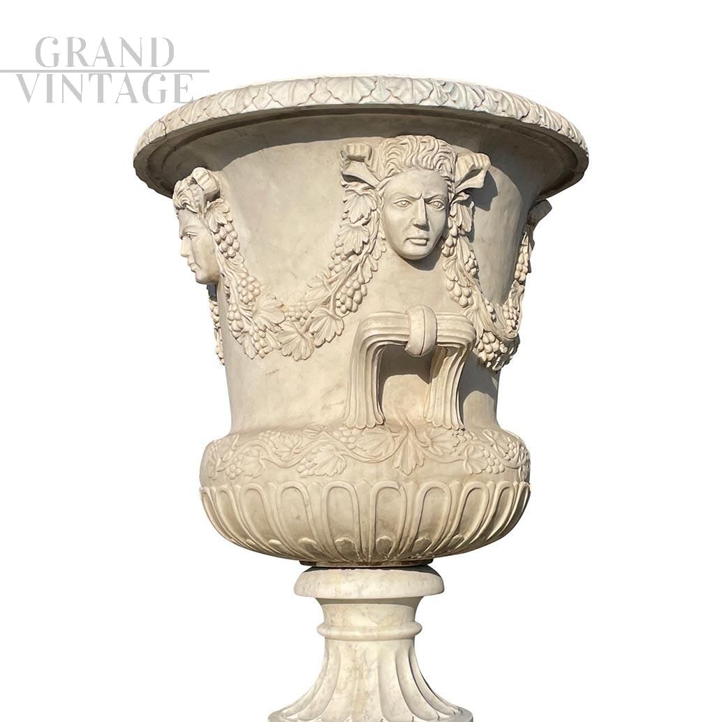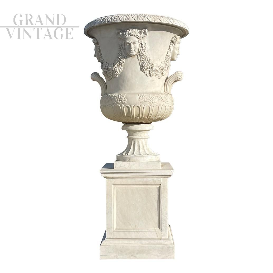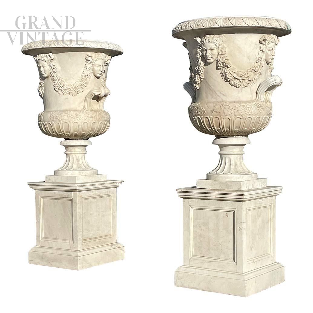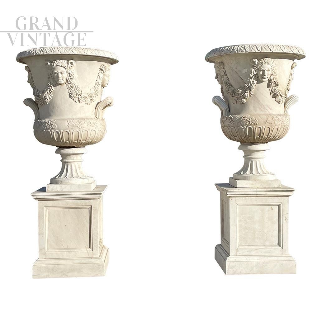 Coppia di grandi vasi da giardino in marmo bianco in stile antico, realizzati nel XX secolo.
