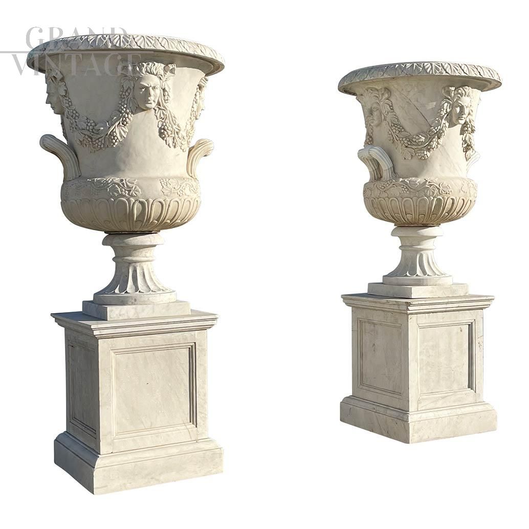 Coppia di grandi vasi da giardino in marmo bianco in stile antico