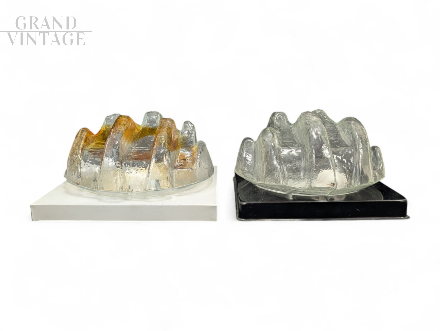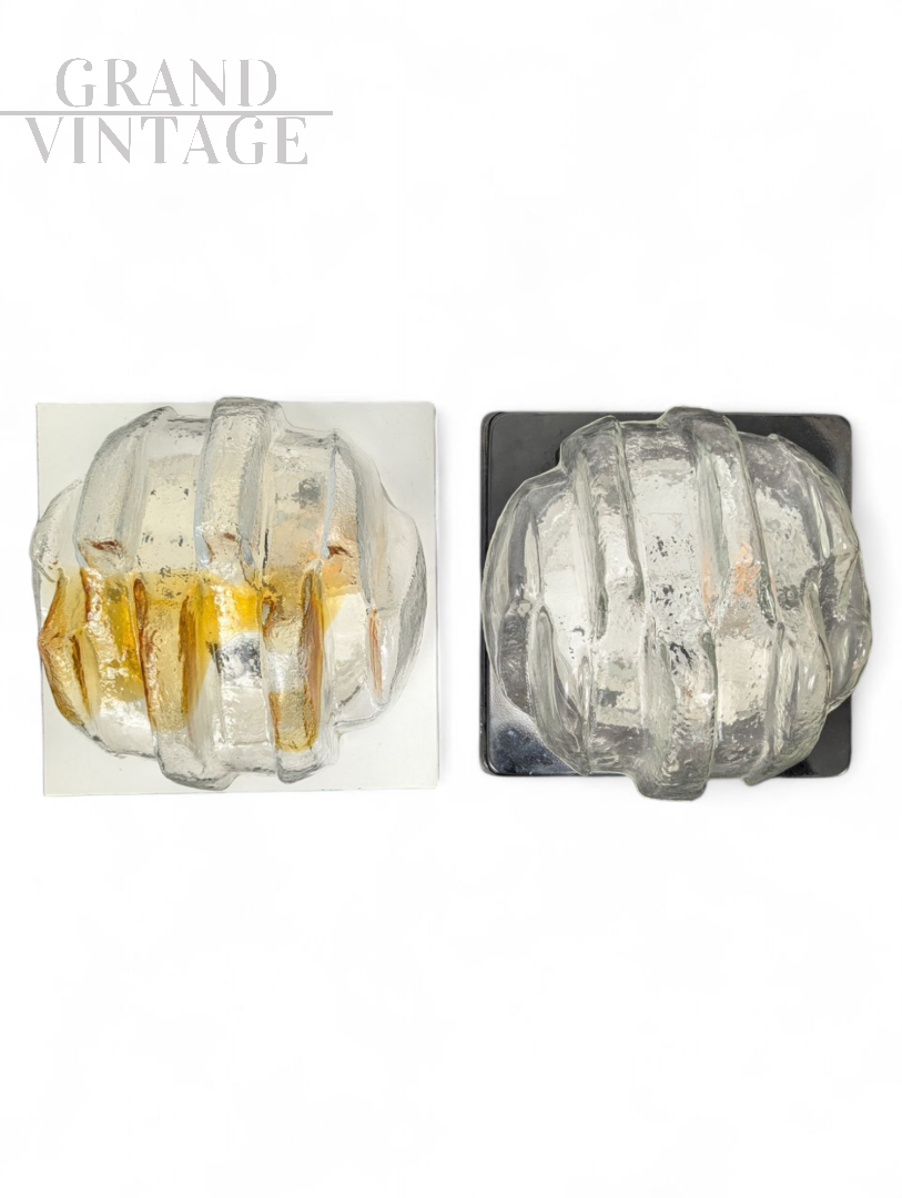 Coppia di applique in vetro soffiato di Murano nei colori trasparente e ambra su pannello in ferro laccato bianco e nero, realizzate negli anni '70. Conservate e in perfette condizioni.