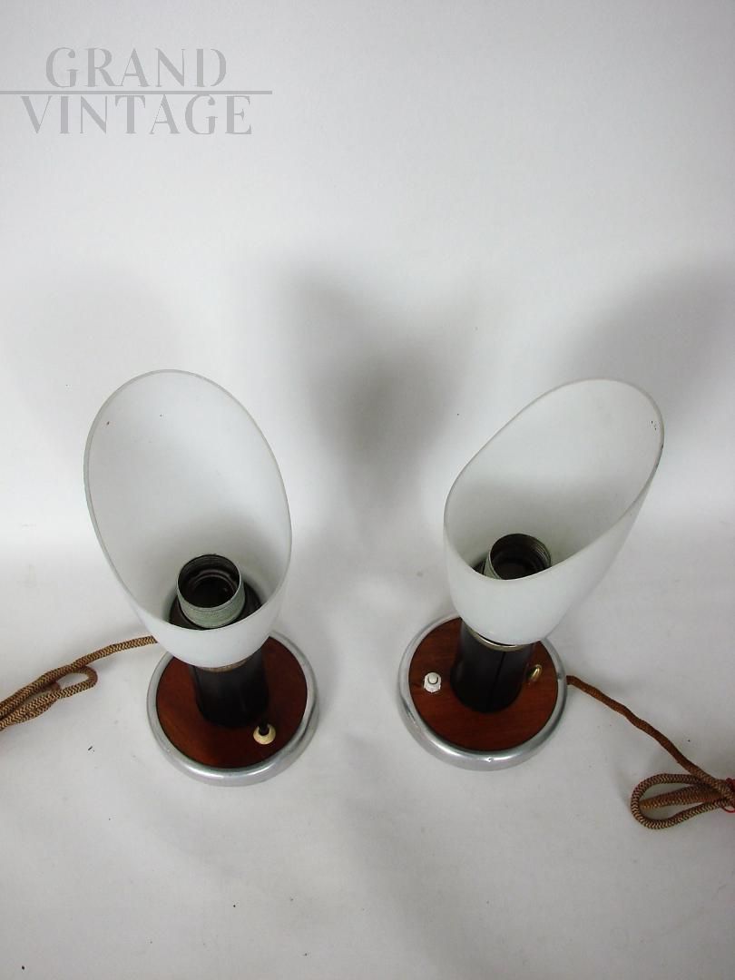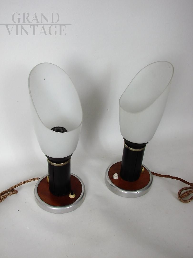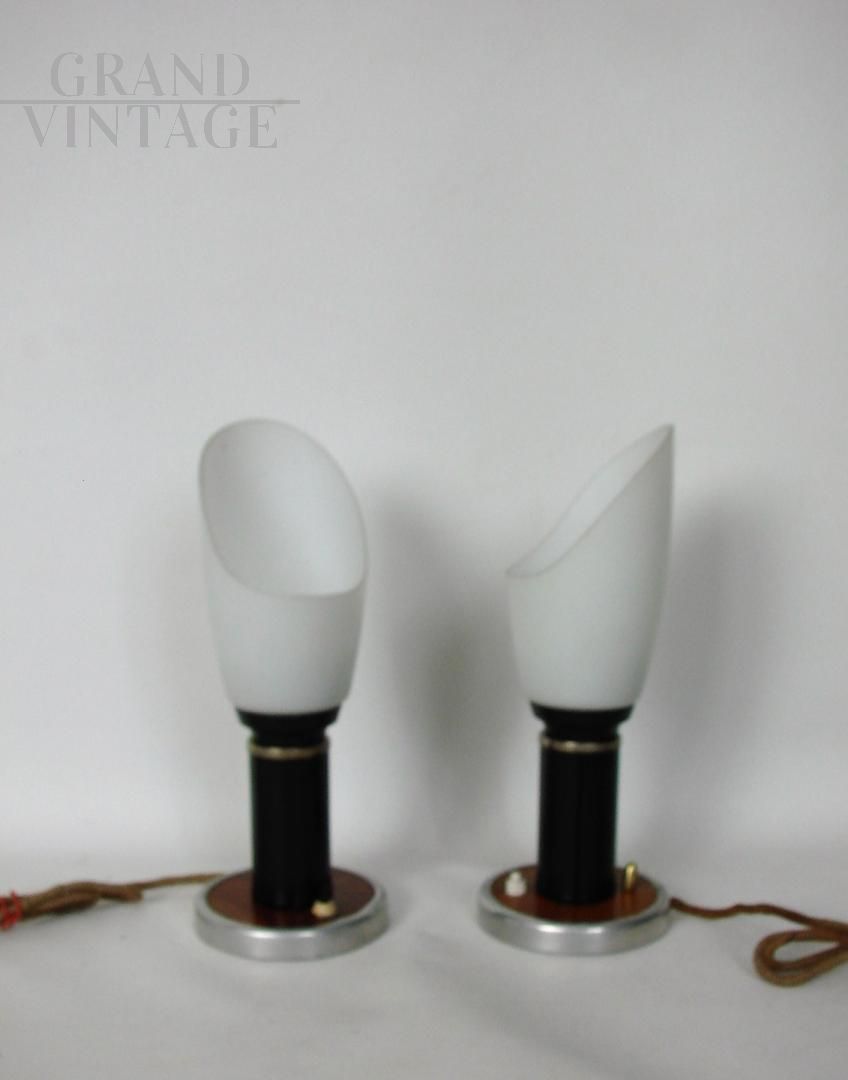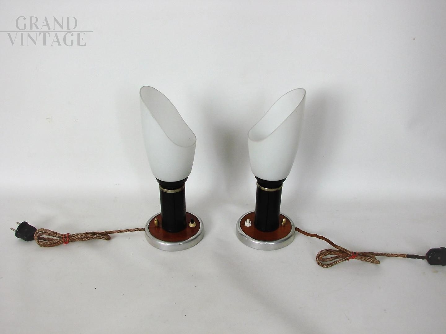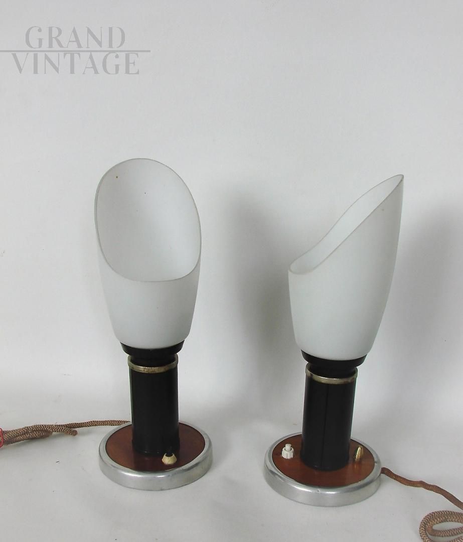 Coppia di lampade da tavolo modernariato mid-century anni '50 con struttura in ottone e paralumi in vetro bianco. Le lampade richiedono una lampadina E27.