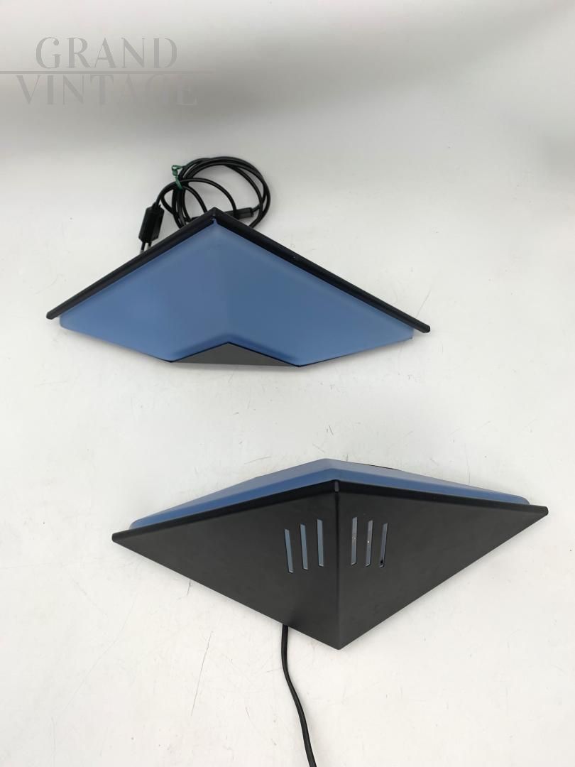 Coppia di lampade da tavolo piramidali con design geometrico. La struttura ha una forma che ricorda una freccia rivolta verso l'alto o un tetto a punta, con un incavo centrale verso il basso; Vetro ble sabbiato, che diffonde la luce in modo morbido e uniforme. La sabbiatura del vetro e la forma scultorea la rendono più di una semplice fonte di luce: è una vera e propria opera d’arte luminosa. Montatura in metallo. Ogni lampada Ha un portalampada e 14 ; impianto elettrico originale e funzionante.