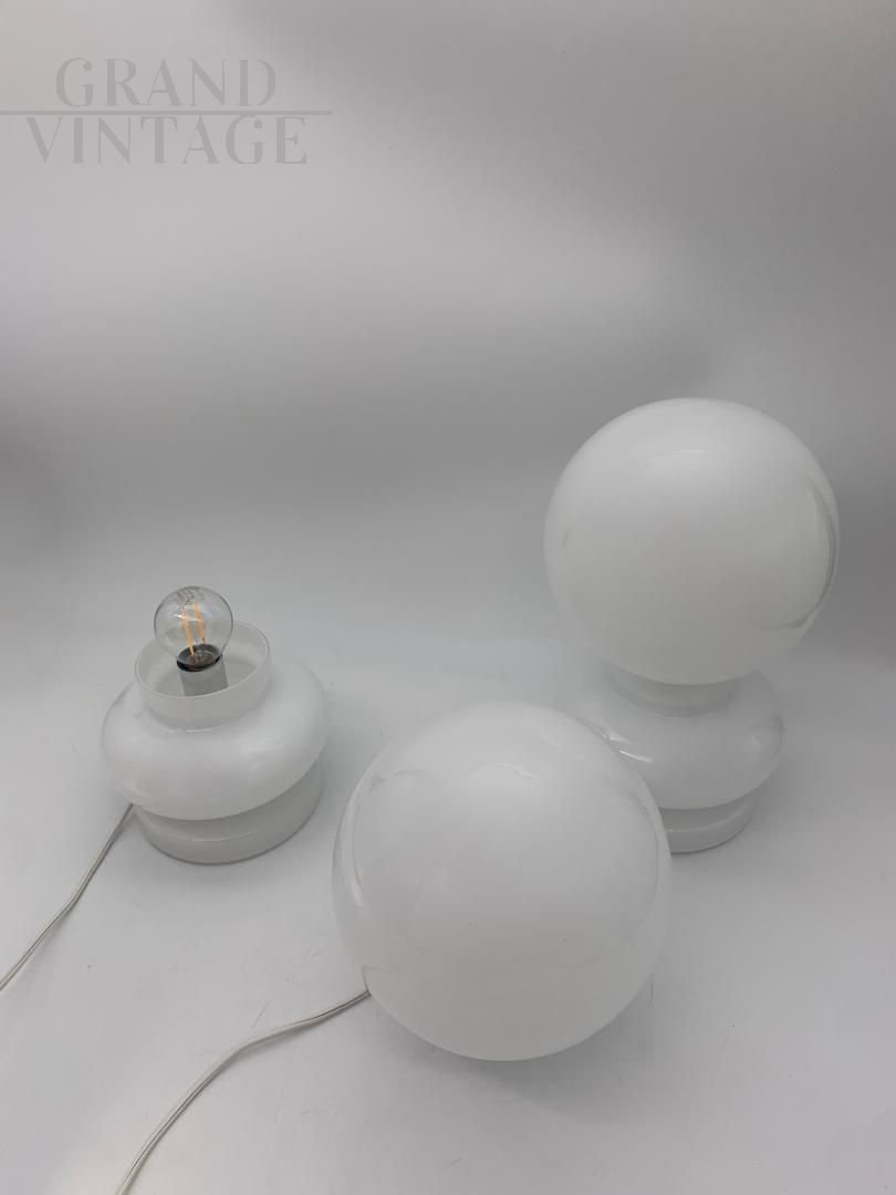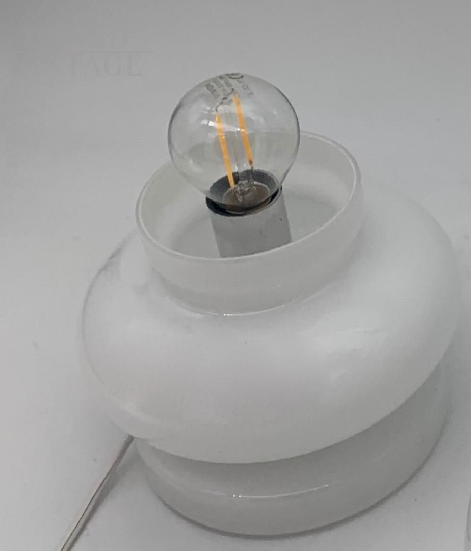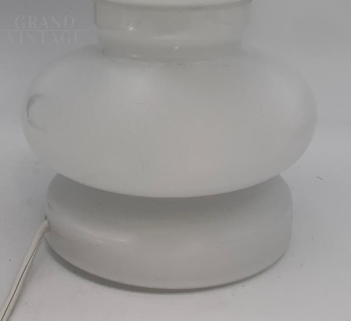 Fantastica e rara coppia di lampade da tavolo in vetro di Murano incamiciato bianco, originali made in Italy anni '70, in buone condizioni, con pochi segno del tempo. Vetri non crepati, incamiciati di bianco internamente. Impianto elettrico originale e funzionante. Ciascuna lampada ha un attacco per lampadina E14, che può supportare anche lampadine al led. Ciascuna lampada si divide in due elementi, come da foto. Si tratta di fondi di magazzino, perciò non sono mai state utilizzate.