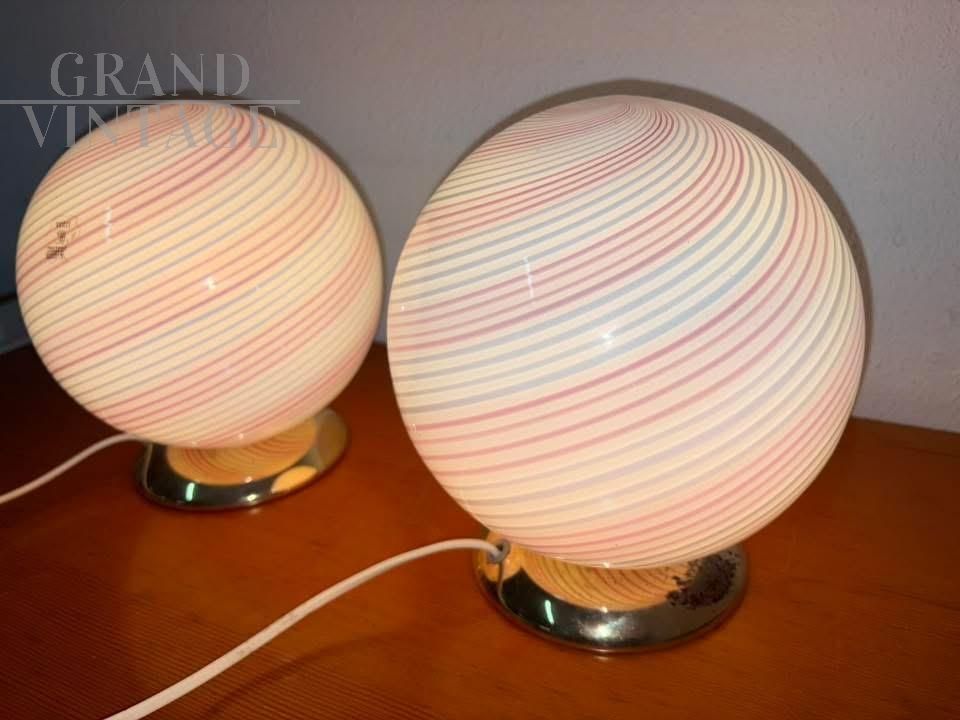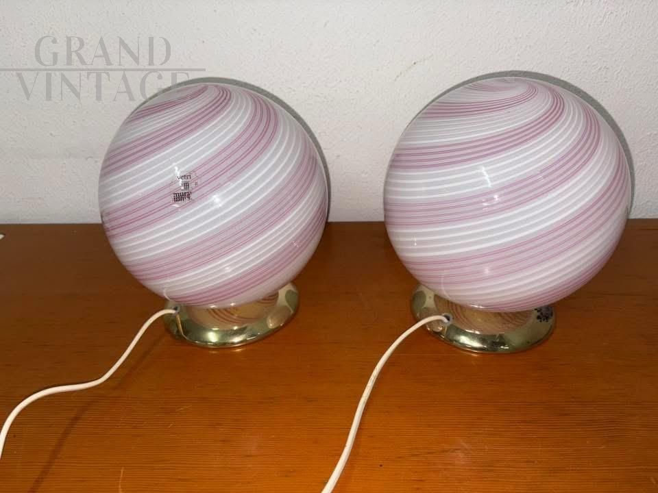 Coppia di lampade a sfera Swirl in vetro di Murano artistico con vortice di colore rosa e bianco, la base è in ottone dorato, complete di bollino.