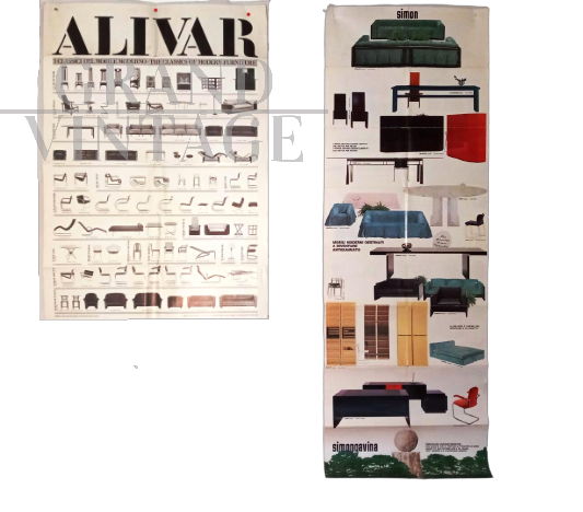 Coppia di manifesti anni '90 con i migliori pezzi di design di Simon Gavina e Alivar. Il manifesto Simon Gavina è bifacciale e ha dimensioni 153 x 53 cm, il manifesto Alivar è monofacciale e ha dimensioni 100 x 70 cm, entrambi sono in buono stato di conservazione.
