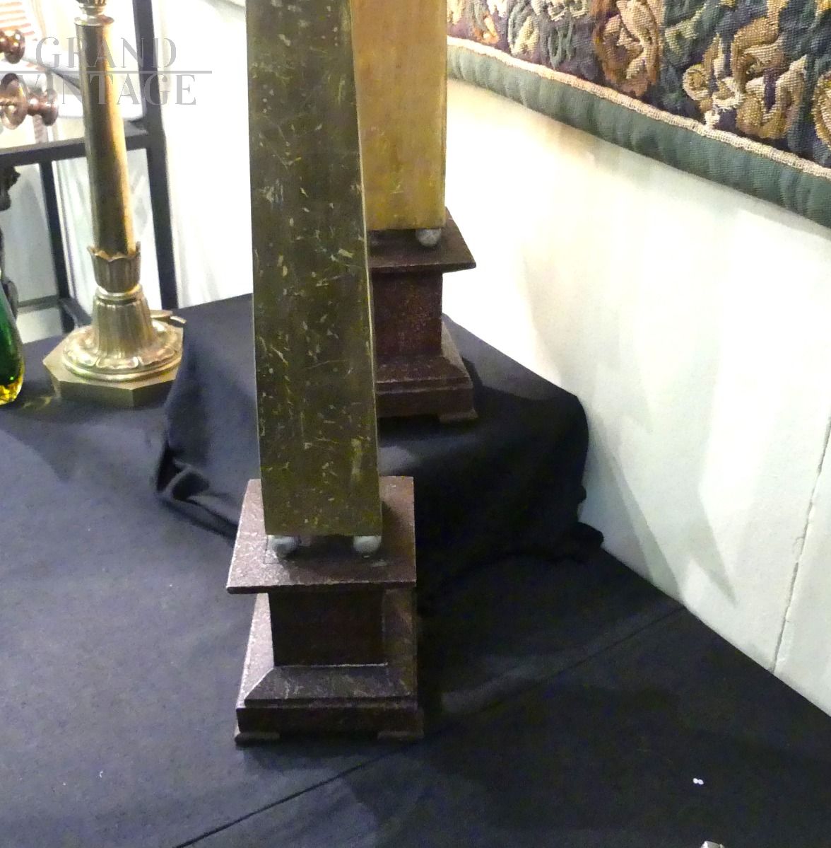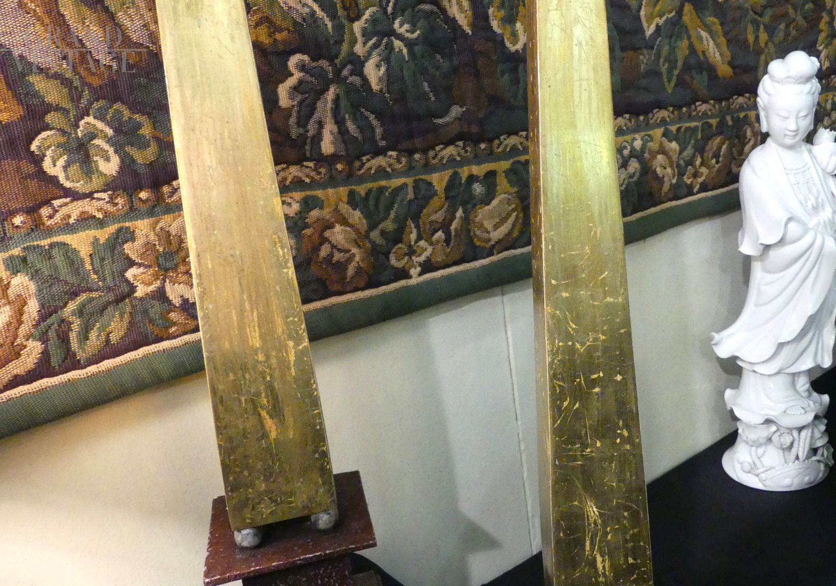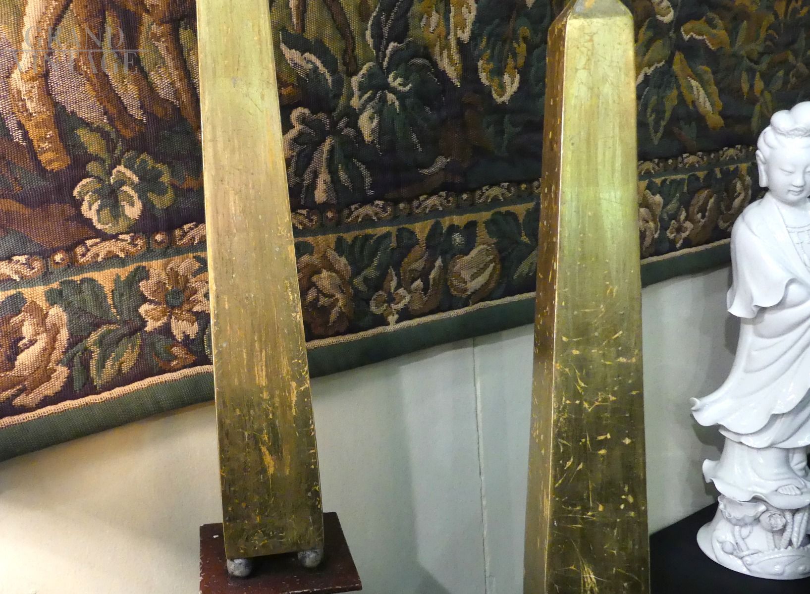 Coppia di obelischi in legno dorato con base in legno effetto porfido rosso, di produzione recente.