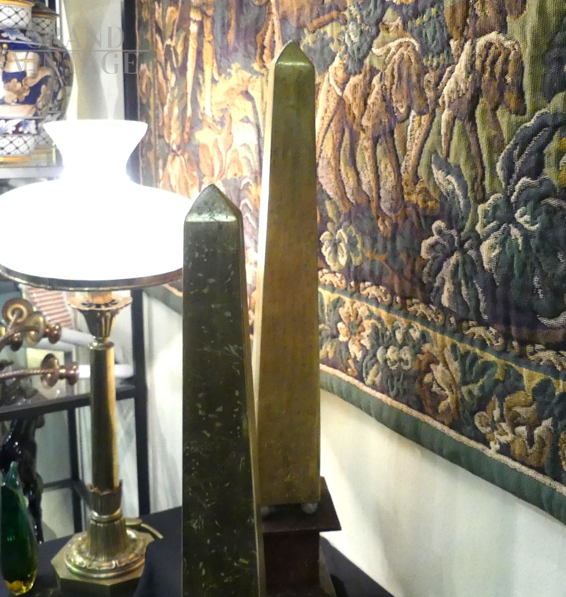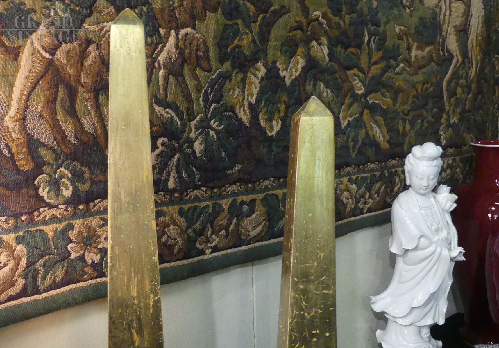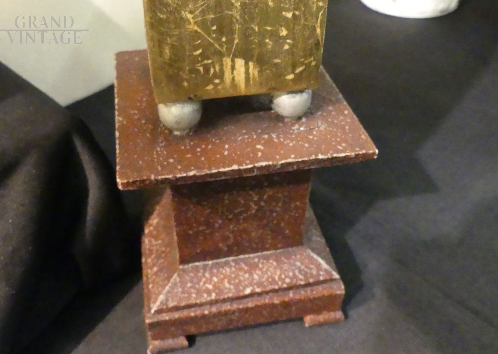 Coppia di obelischi in legno dorato con base in legno effetto porfido rosso, di produzione recente.