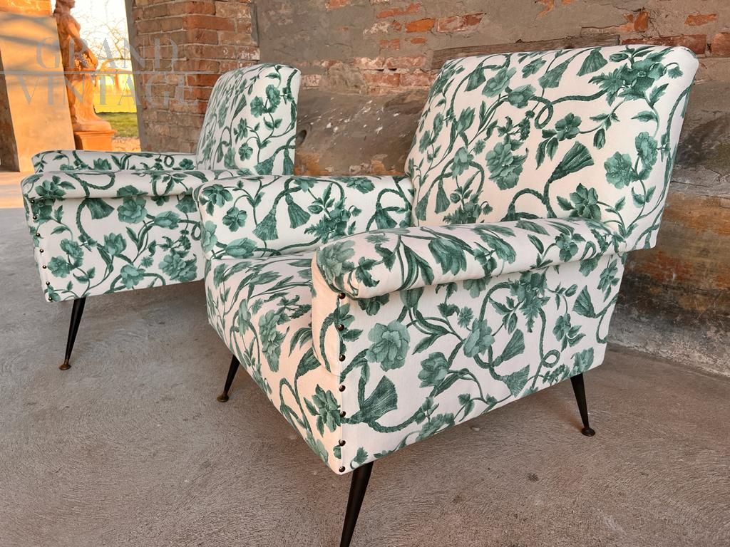 Coppia di poltroncine di Gigi Radice per Minotti anni '60, rivestite a nuovo in un bellissimo vellutino bianco con motivi floreali in verde, con struttura originale, gambe in metallo e piedini in ottone. In ottime condizioni.