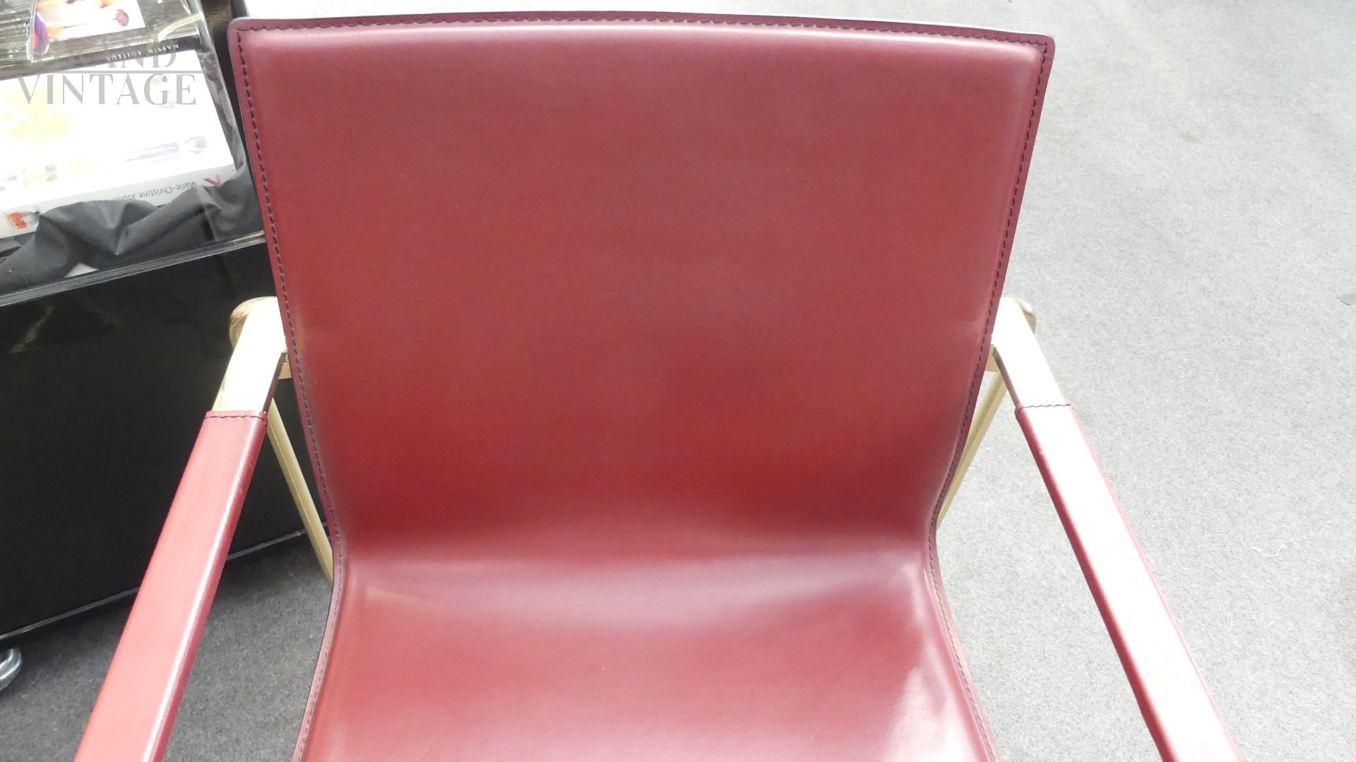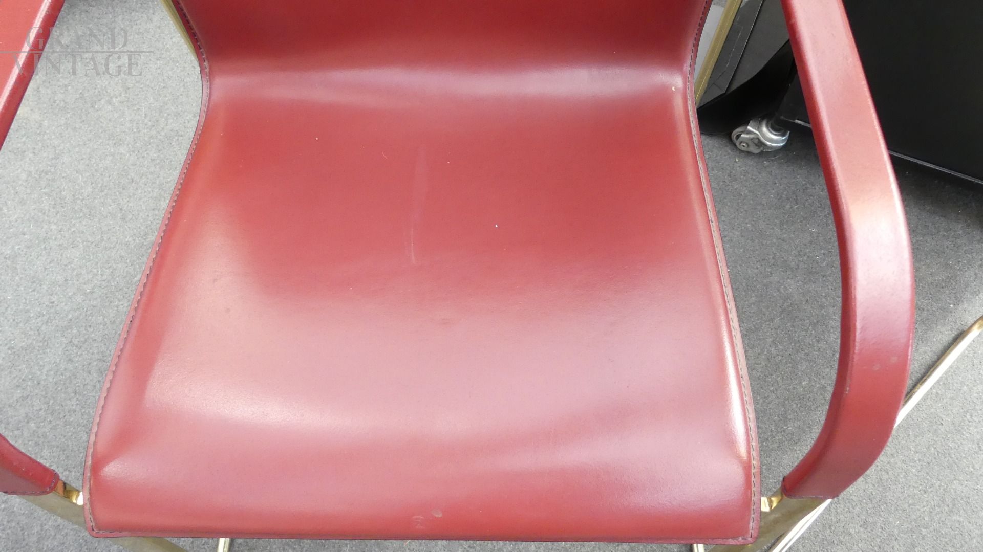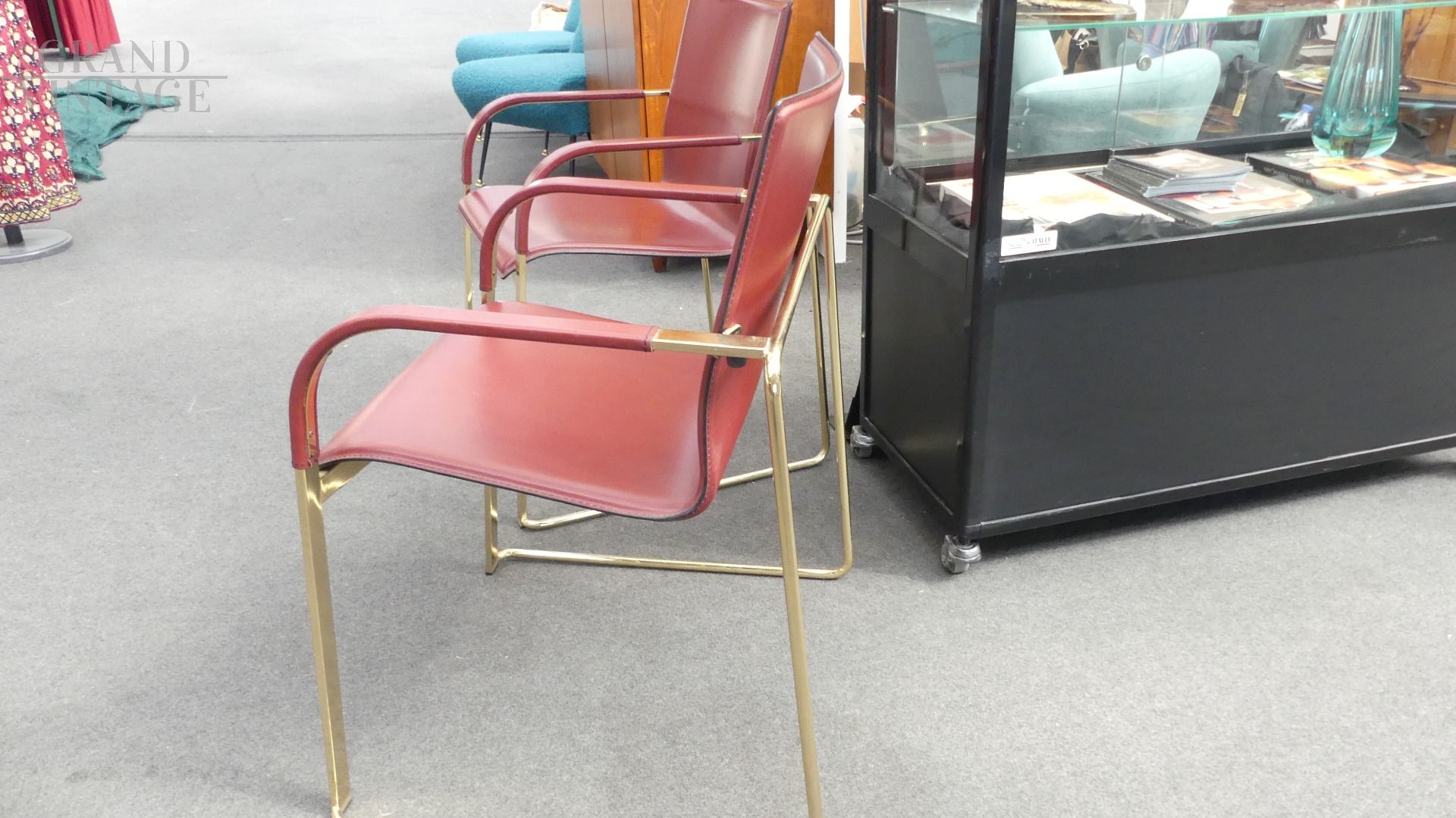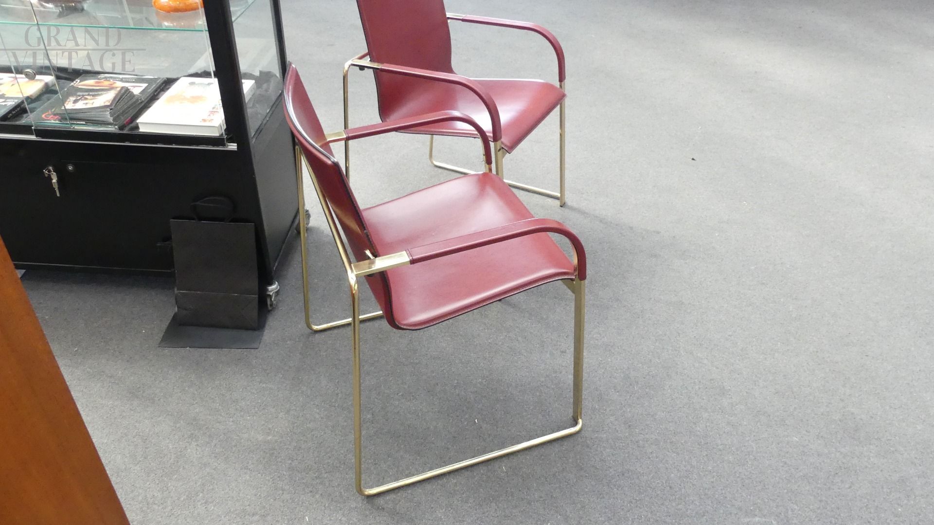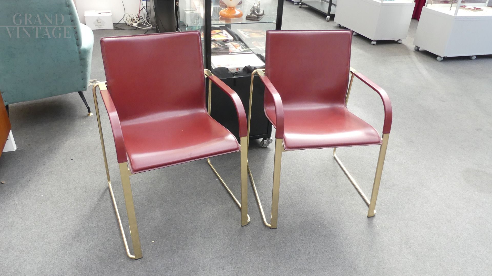 Poltroncine modernariato italiane degli anni '70 prodotte in ottone e cuoio bordeaux. Disponibili 2 coppie, il prezzo si riferisce alla singola coppia.