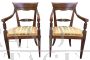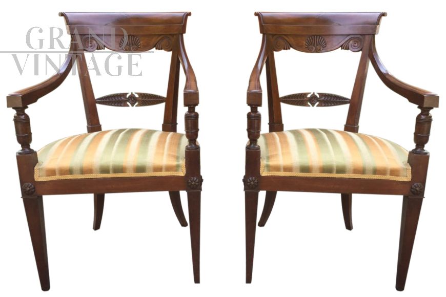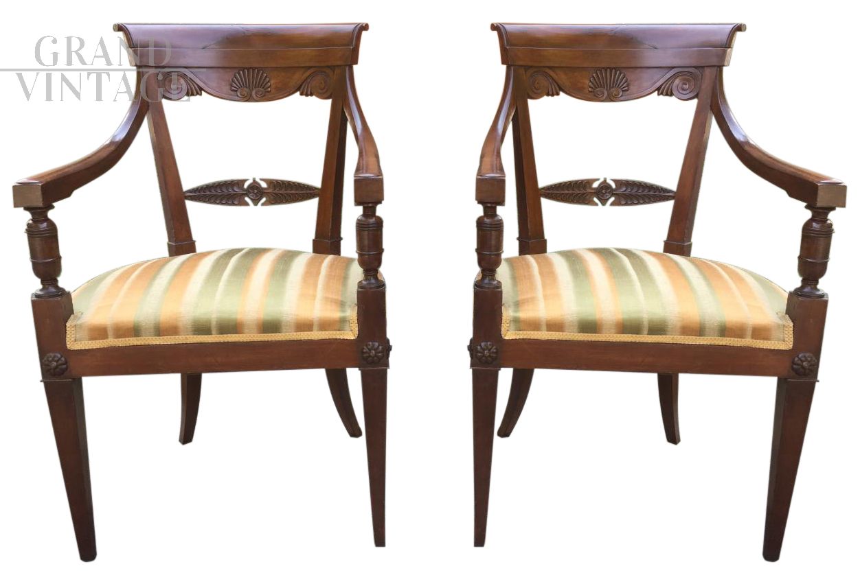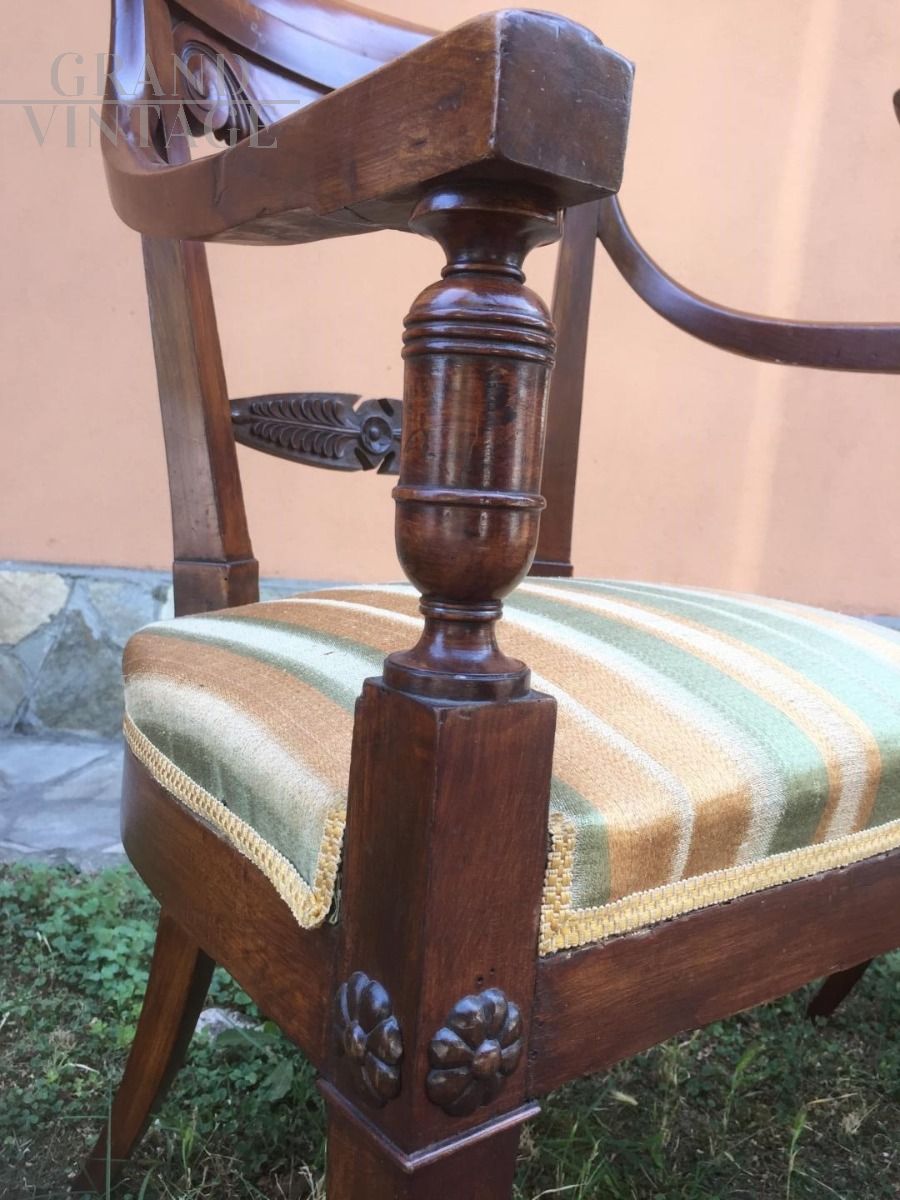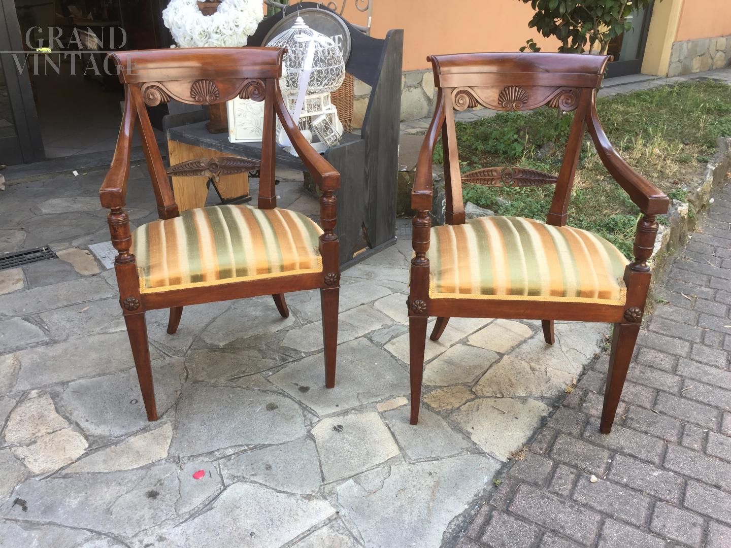 Bella coppia di poltrone in legno di noce degli inizi del 1800. Struttura solida e robusta, linea elegante e ben proporzionata. Segni di restauri eseguiti nel '900, buona patina.