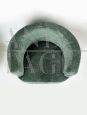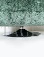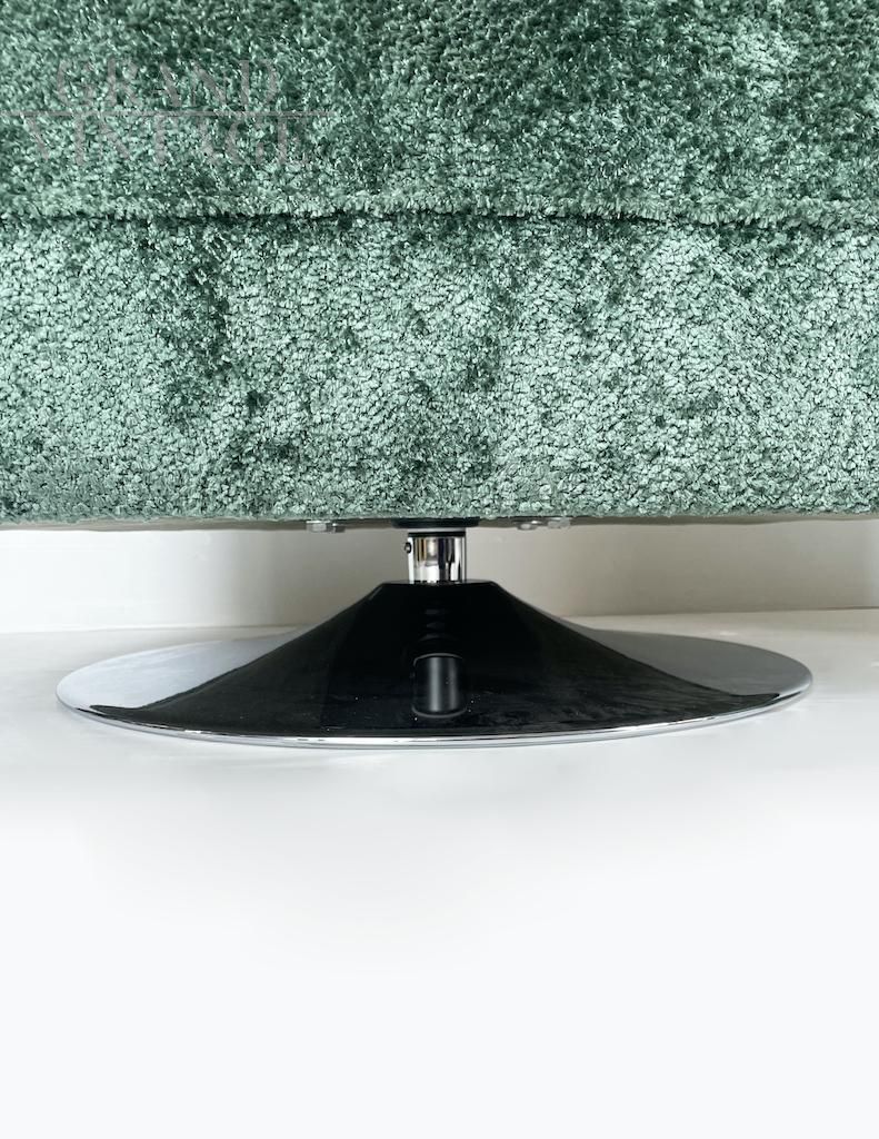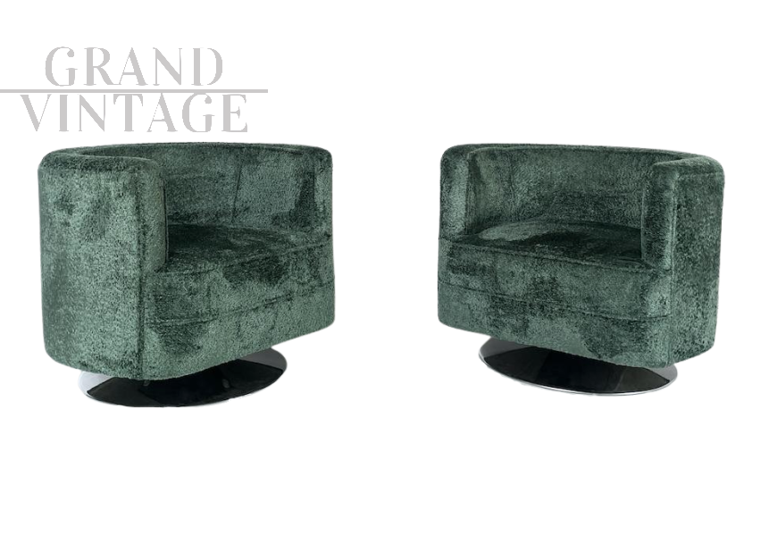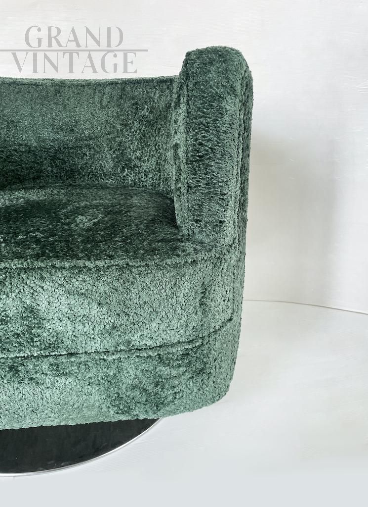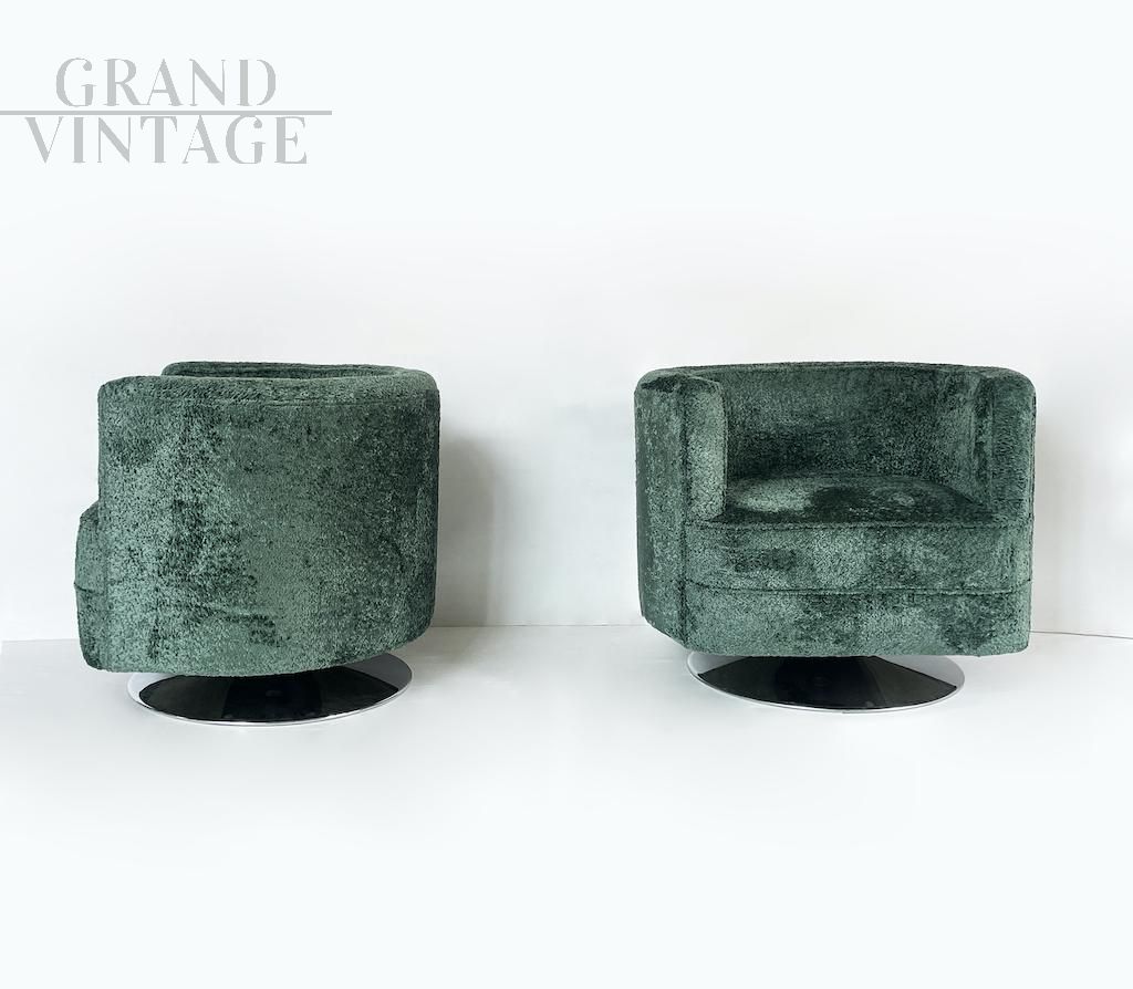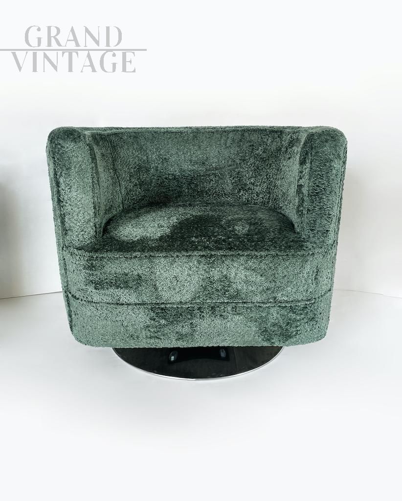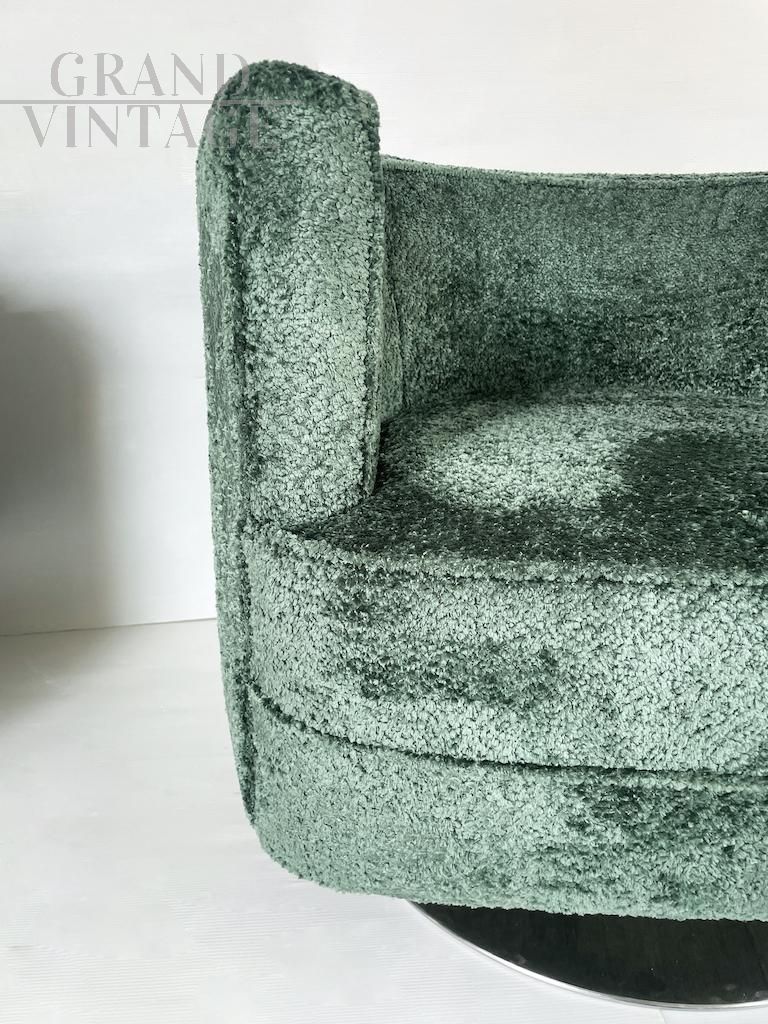 Particolari poltrone girevoli dalla comoda seduta e dalla forma tonda. Le poltrone sono interamente ricoperte da morbido tessuto bouclé verde e presentano una base circolare in acciaio. Italia anni '90.
