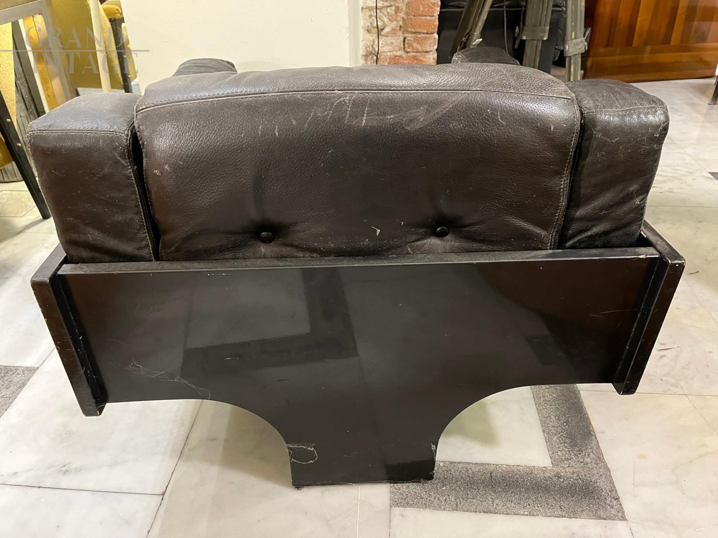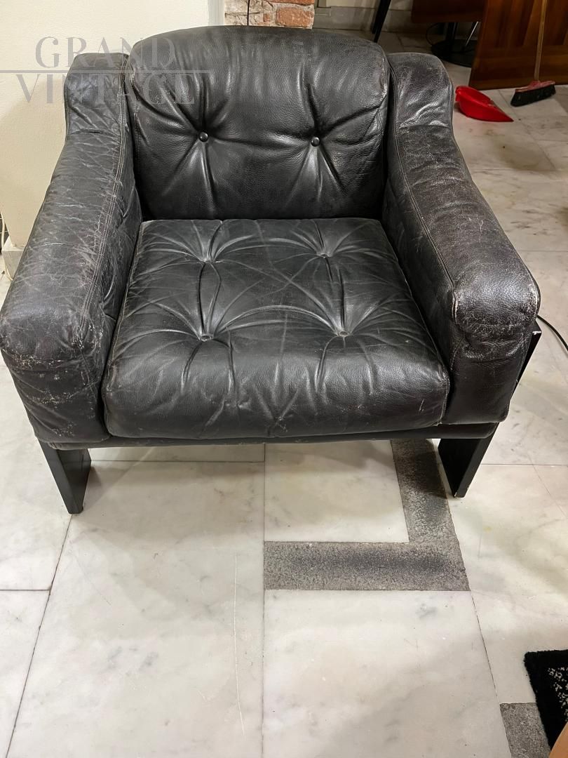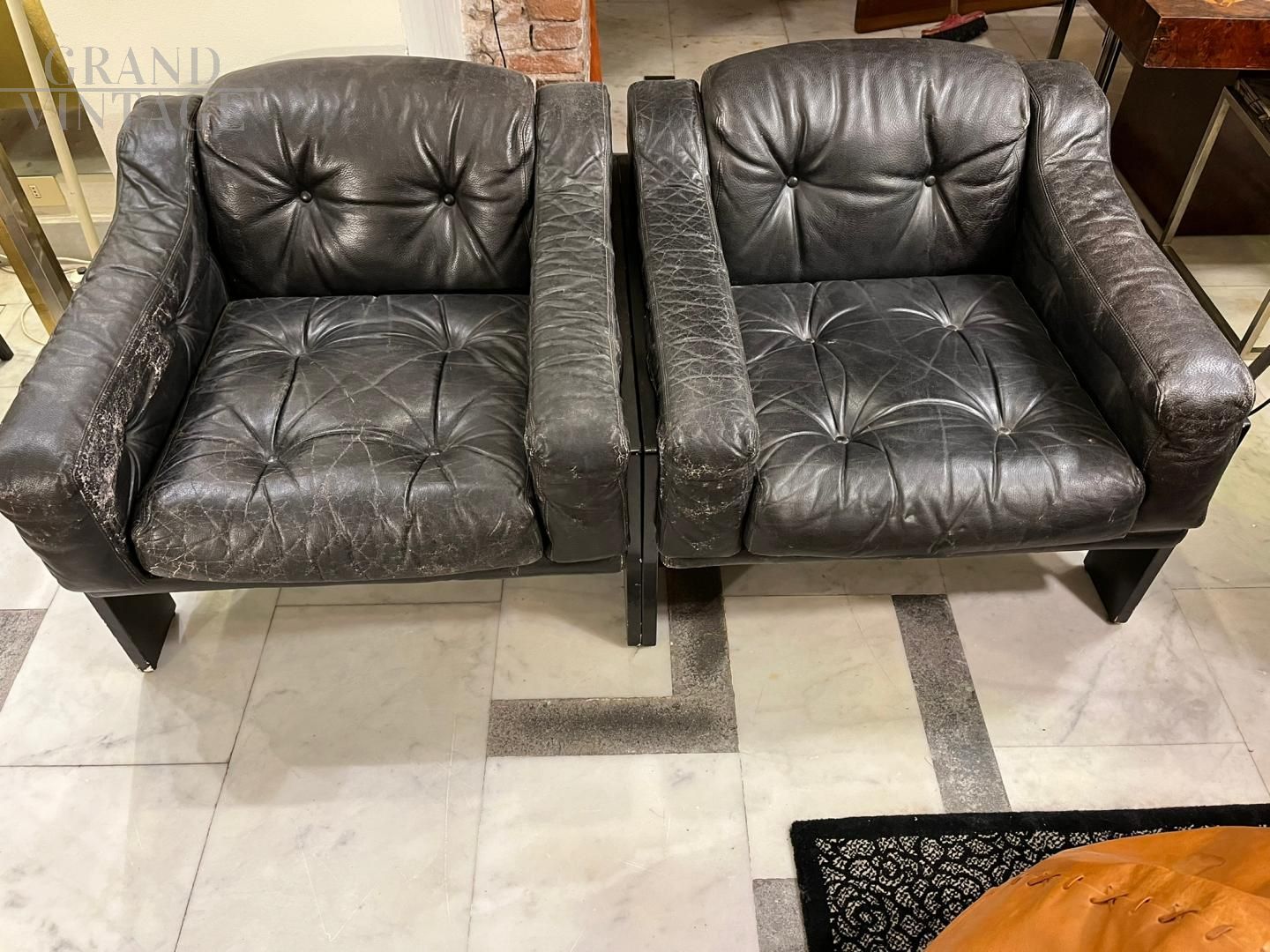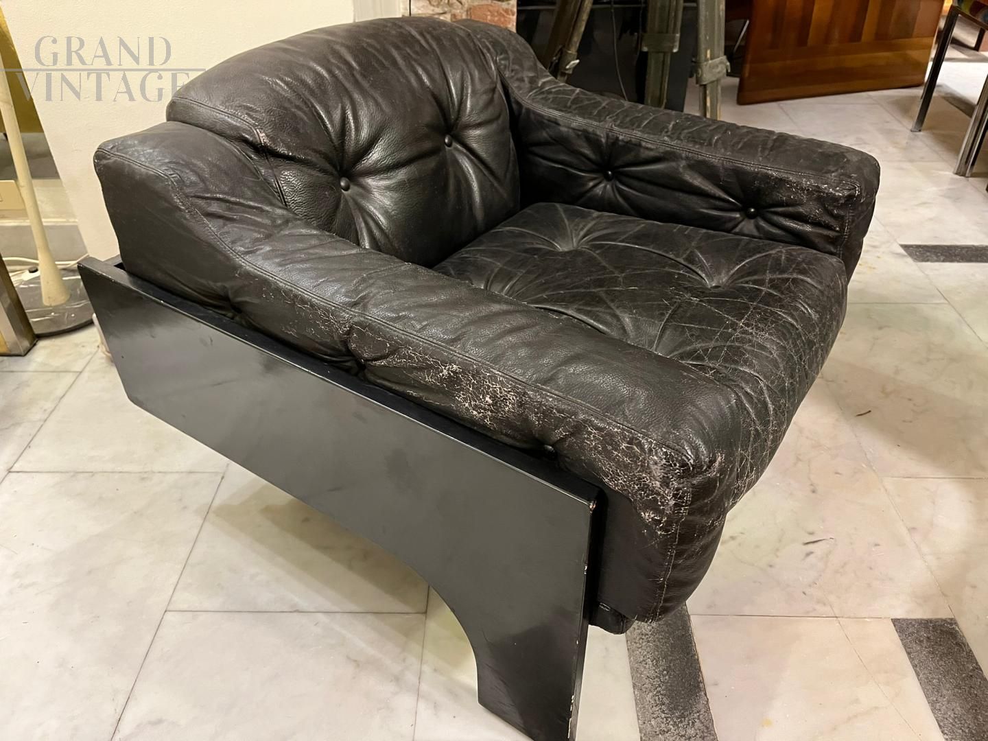 Coppia di poltrone design anni '70 modello Oriolo di Claudio Salocchi per Sormani, con rivestimento in pelle di colore nero e struttura in legno marrone scuro. Ottime condizioni, presenta i naturali segni del tempo sul rivestimento in pelle.
