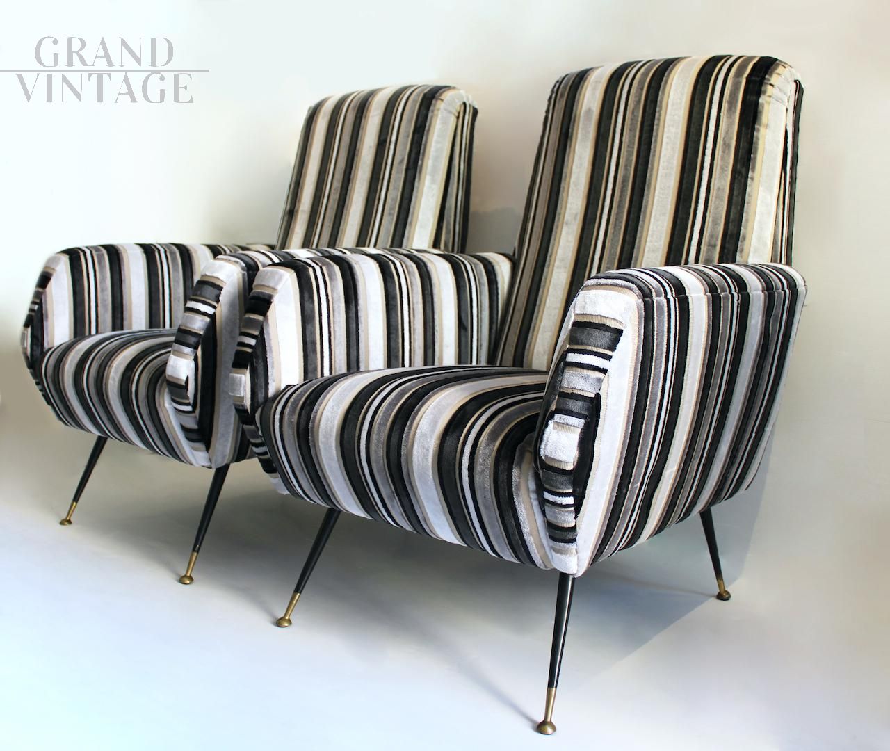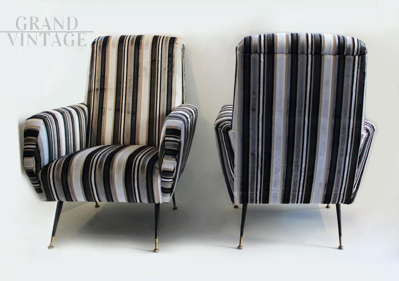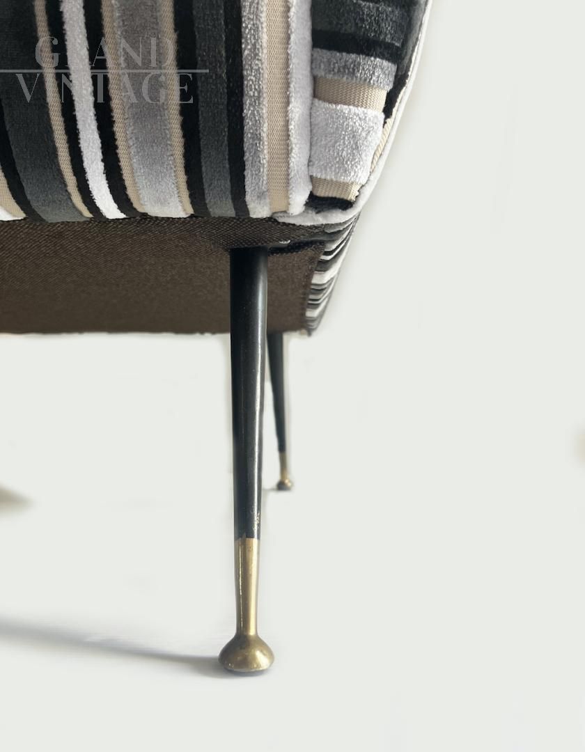 Particolare coppia di poltrone vintage in velluto a righe bianche e nere con fusto originale, gambe in ferro e piedini in ottone, modernariato italiano anni '70.