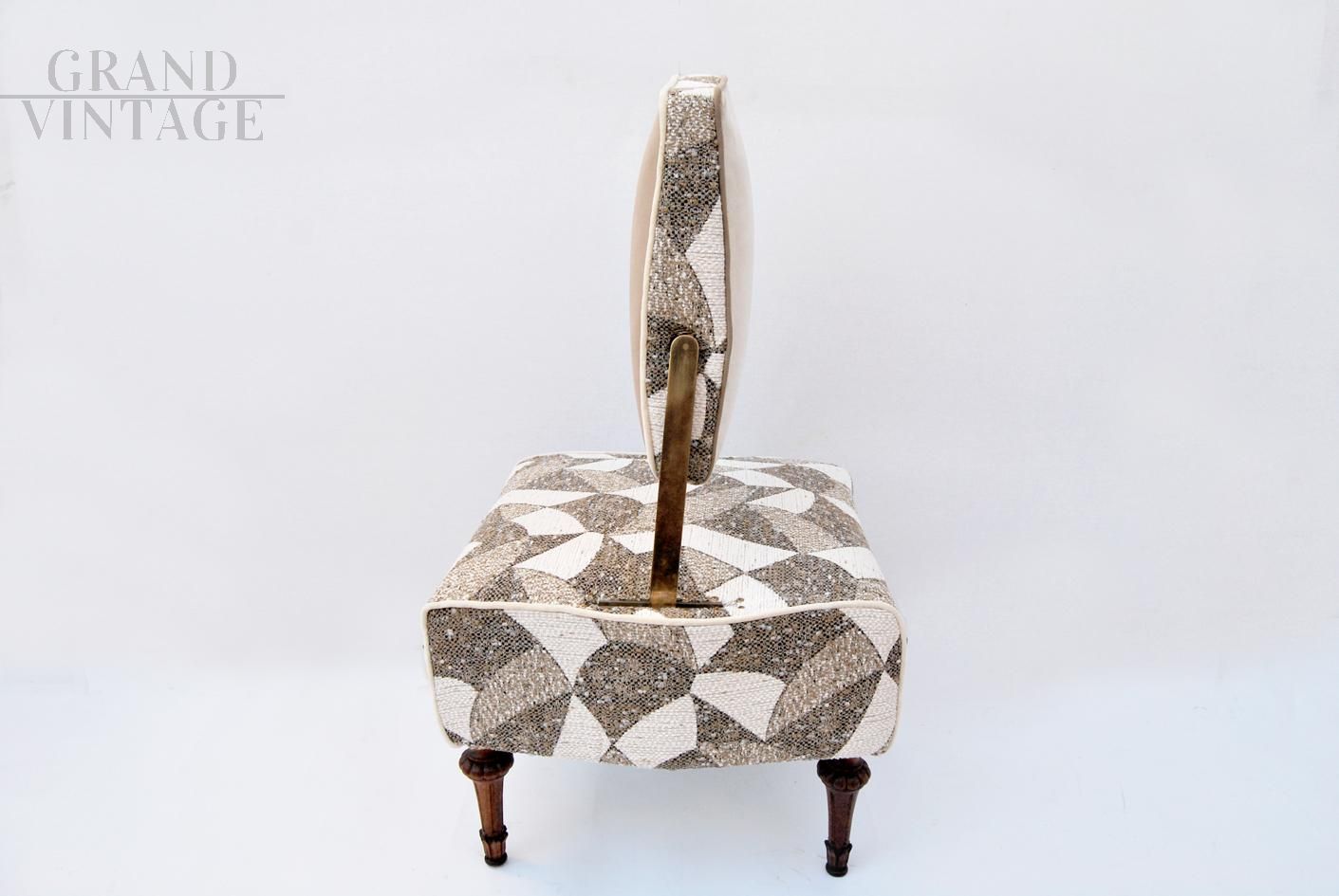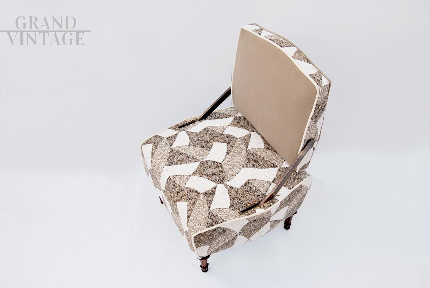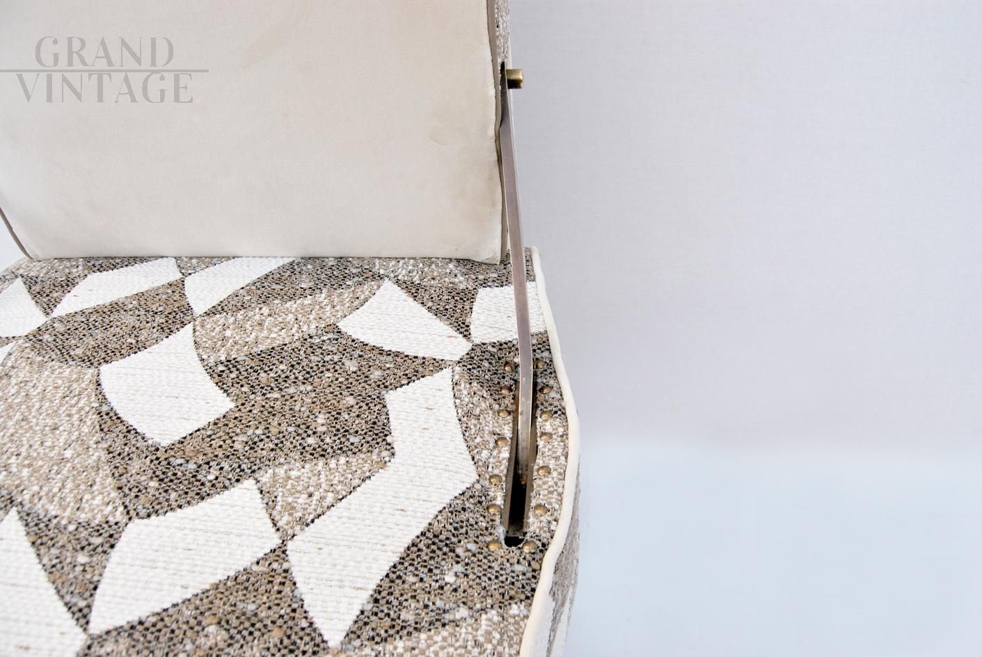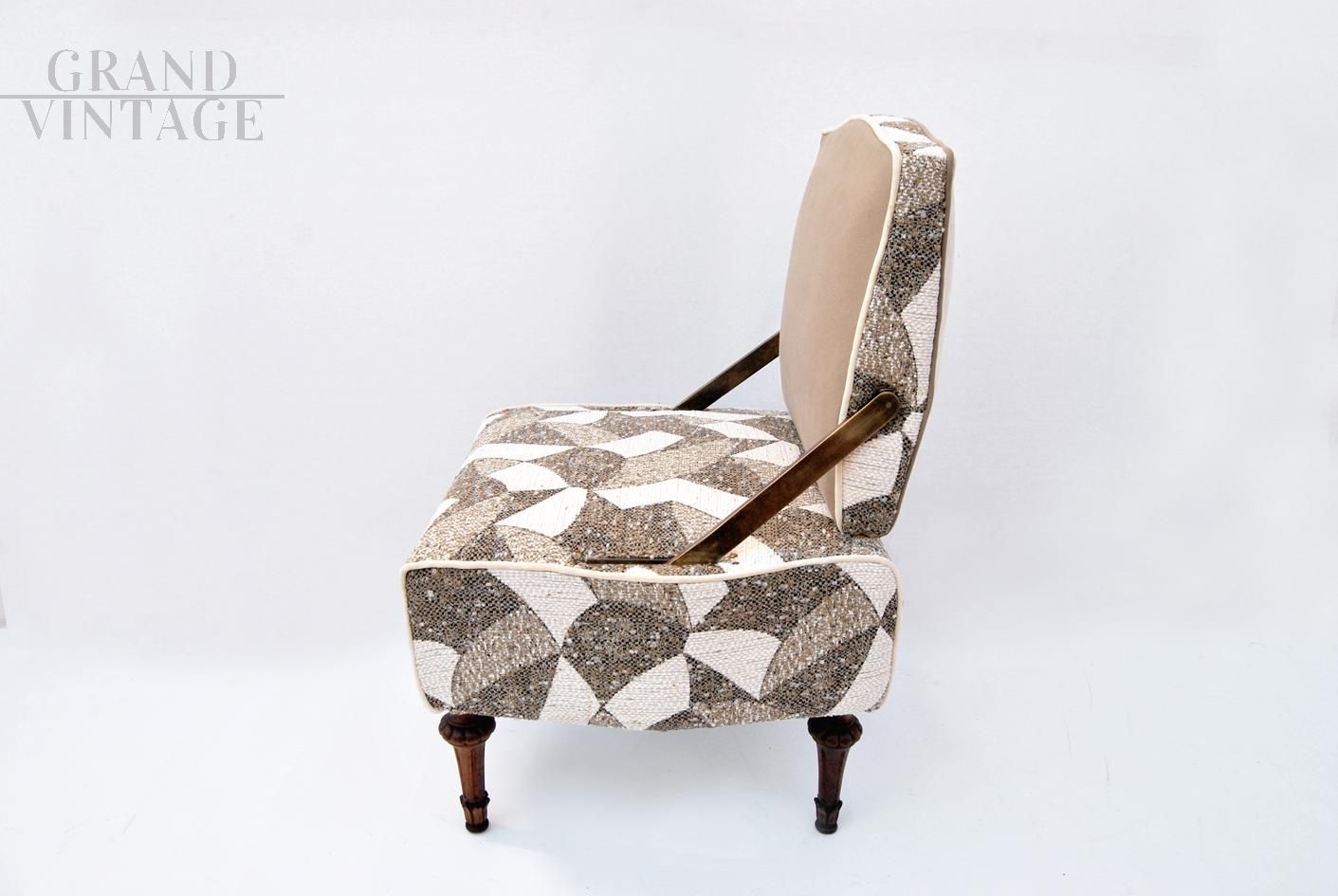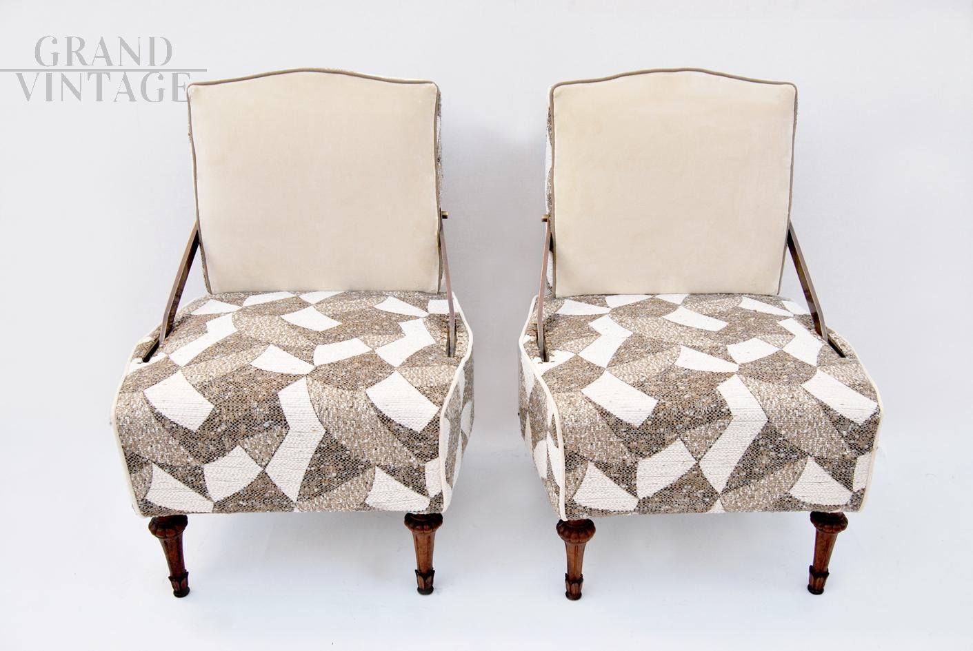 Rarissima coppia di poltrone vintage risalenti agli anni '40. La particolarità di queste poltrone, prodotte in Italia, è quella di poter sistemare lo schienale in due posizioni tramite un meccanismo interno composto da barre laterali e un pulsante di sblocco in ottone, a vista. La struttura in legno è completamente originale e restaurata; l'imbottitura è stata rifatta, così come il rivestimento in cotone pregiato, con schienale a due colori in tono. Le condizioni sono pari al nuovo.