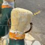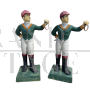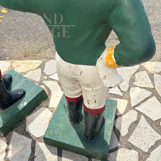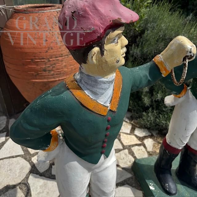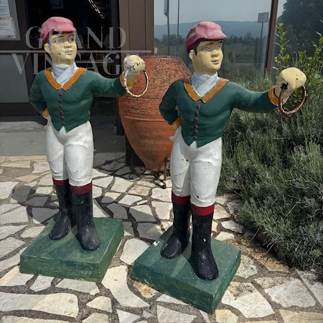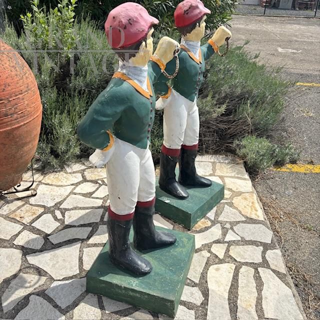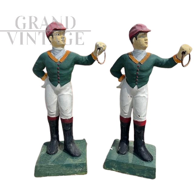 Coppia di rare sculture americane da giardino in ghisa raffiguranti due fantini con anelli per cavalli, dipinte a mano, hanno subito restauri nel tempo, sono in stato molto buono.