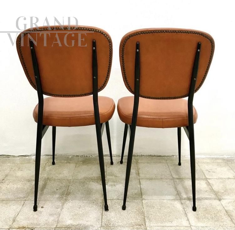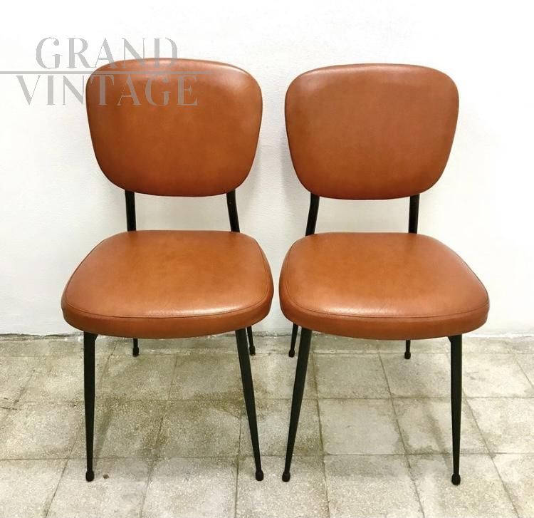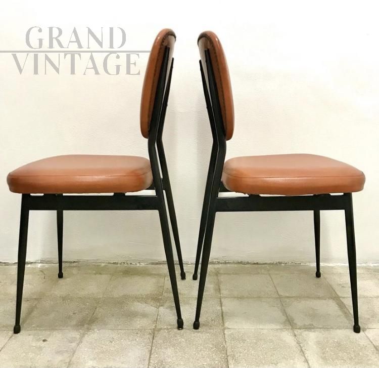 Coppia di sedie anni ‘60 con struttura in ferro gommato nero e imbottitura originale foderata in pelle del periodo color arancio / mattone, molto comode e conservate benissimo.