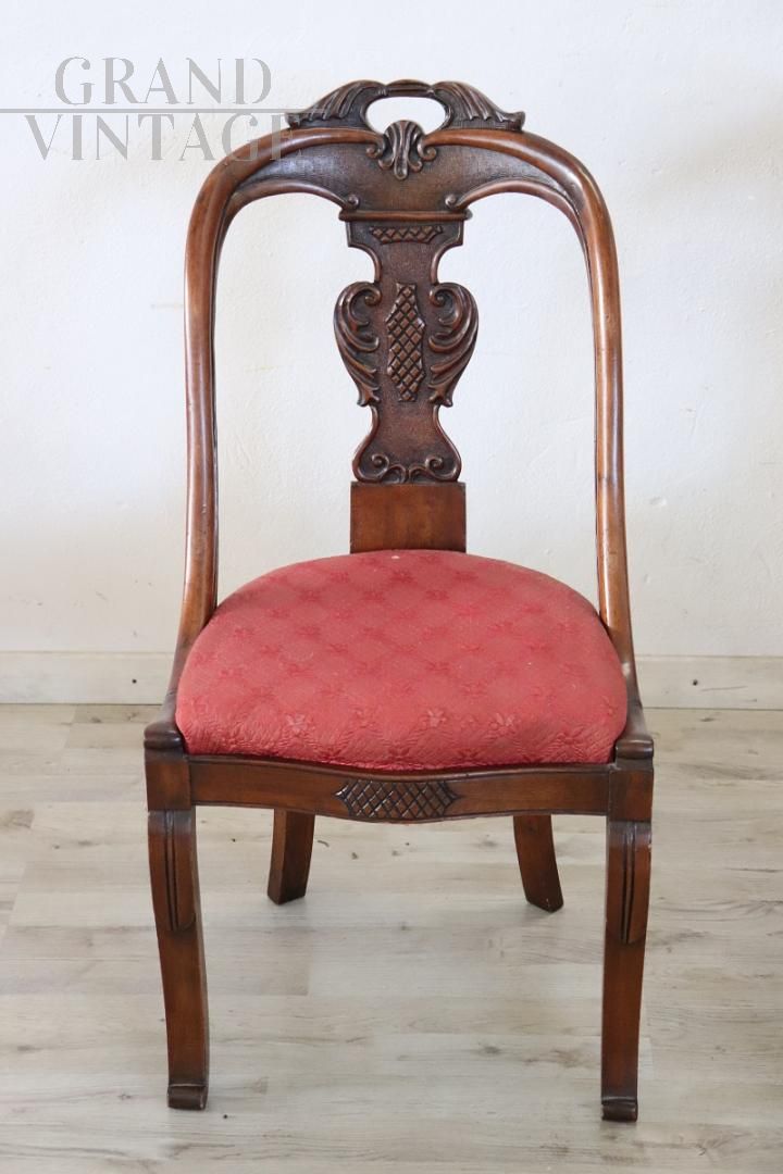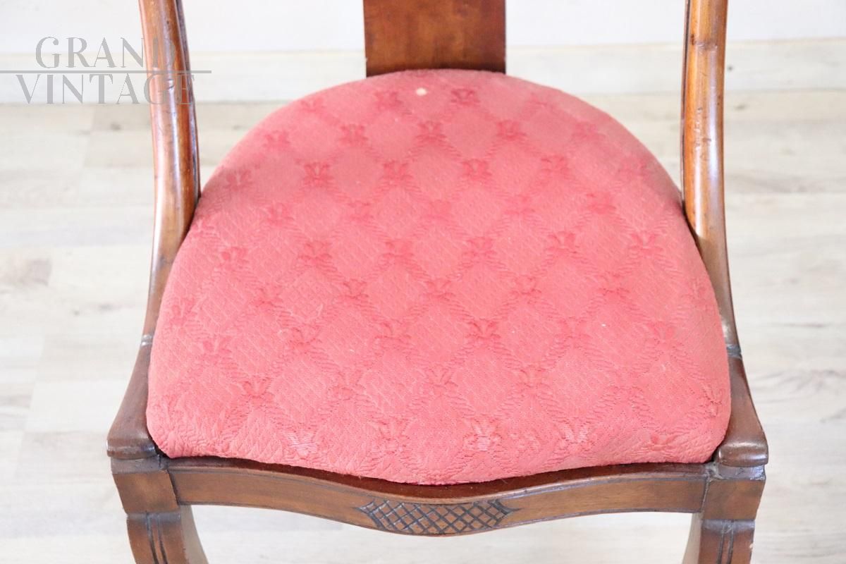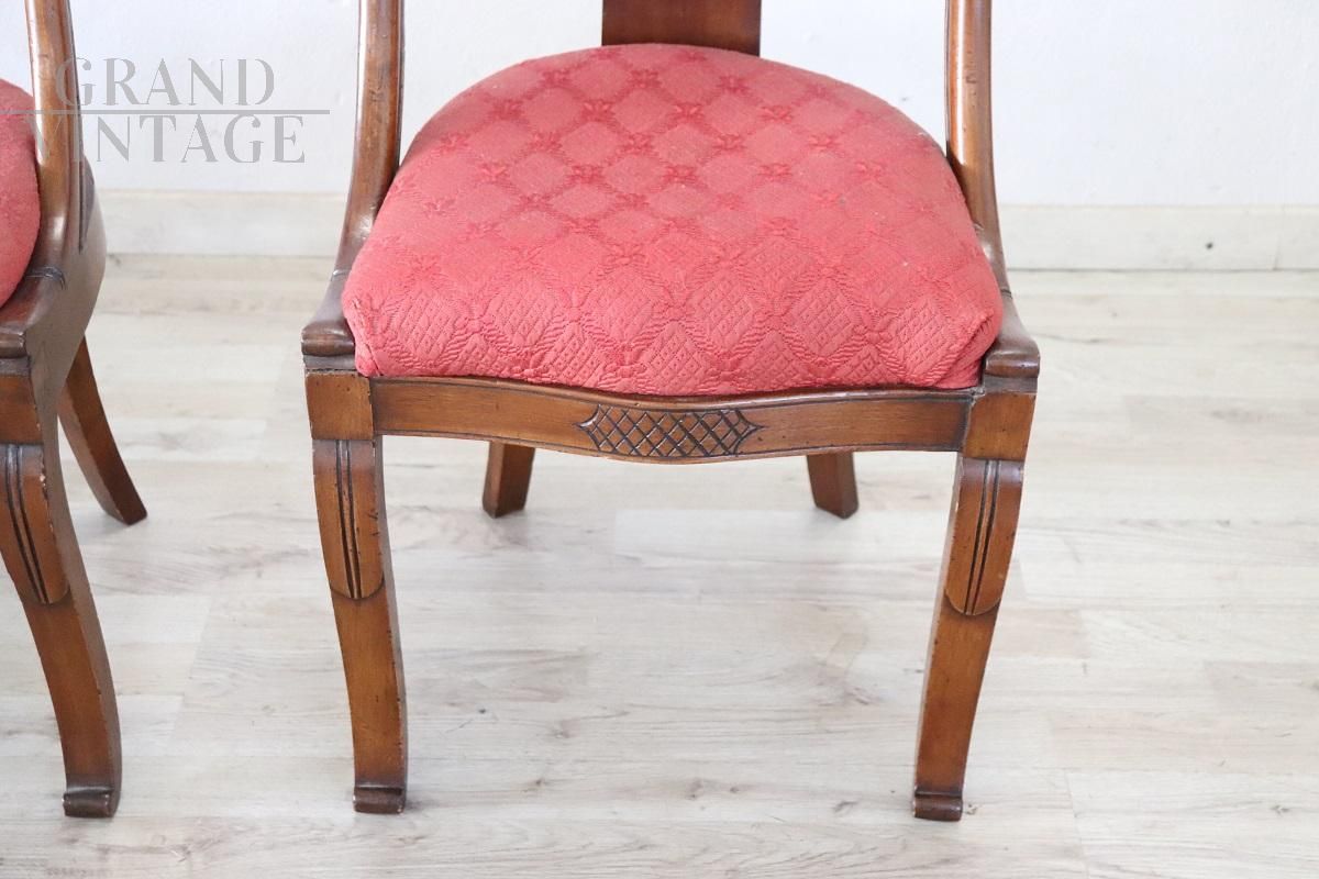 Bellissima coppia di sedie antiche a gondola in legno di noce massello della prima metà del XIX secolo, periodo Carlo X, di ebanisteria italiana. Le sedie sono caratterizzate da uno schienale avvolgente e raffinato, impreziosito da un'elaborata decorazione intagliata a mano nel legno di noce. La seduta è ampia e confortevole con imbottitura rivestita in elegante tessuto rosso. Ottime condizioni del legno con leggera usura del tessuto e dell'imbottitura, si consiglia la sostituzione. Prezzo trattabile.