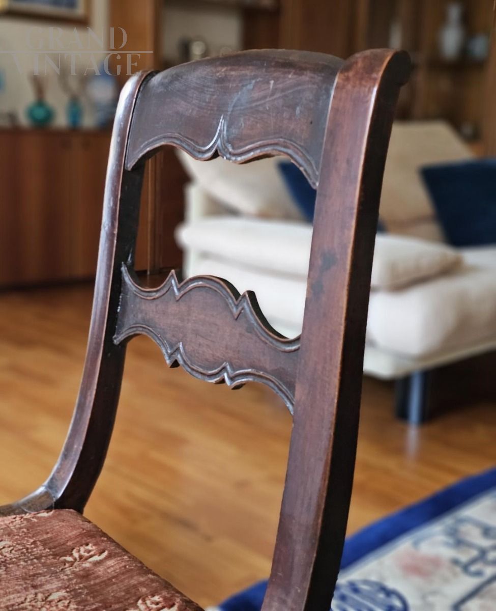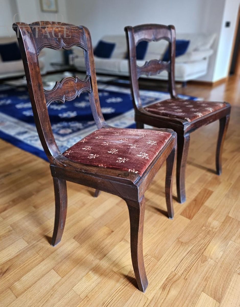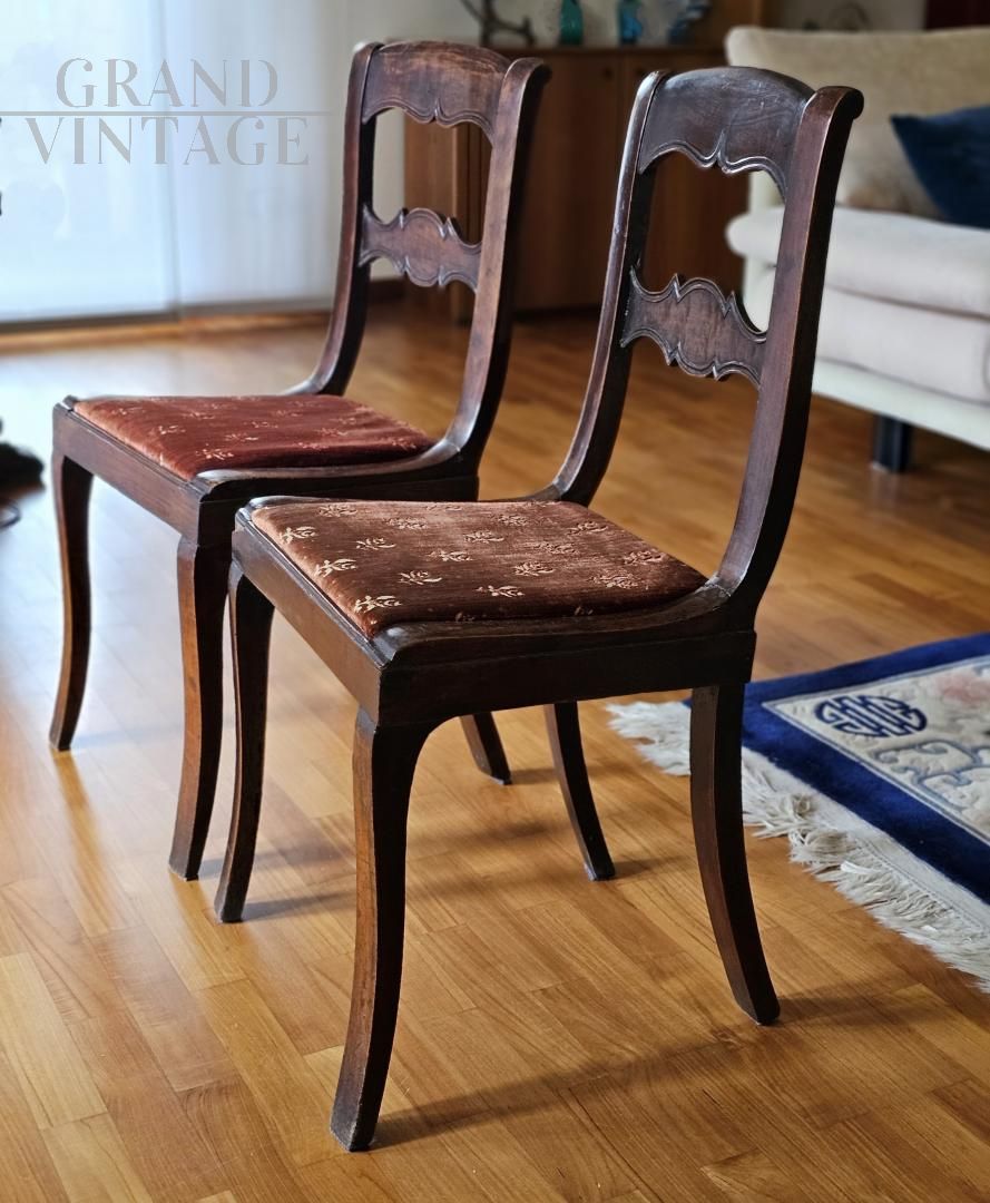 Coppia di sedie antiche di ottima fattura perfettamente tenute ed ancora utilizzabili, databili intorno alla fine dell'800. La linea estetica pregevole e le ottime proporzioni ne fanno un set di sedute dall'immagine leggera e aggraziata. Schienale con fine lavorazione di linea essenziale e armoniosa. La seduta è in velluto marrone con motivi floreali, in ottimo stato. Possibilità di acquistare una terza sedia identica ma da rifoderare.