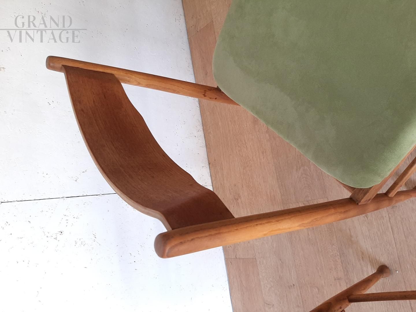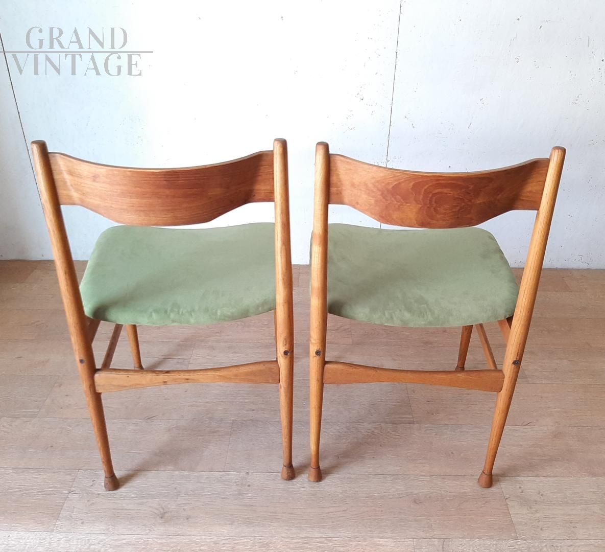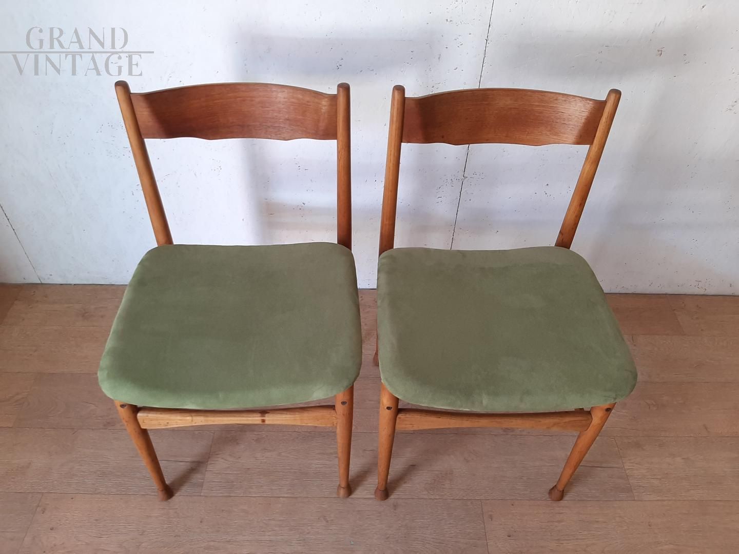 Coppia di sedie vintage in stile scandinavo degli anni '60 in faggio con seduta in tessuto verde rifatta a nuovo. Presentano i naturali segni del tempo come da foto,