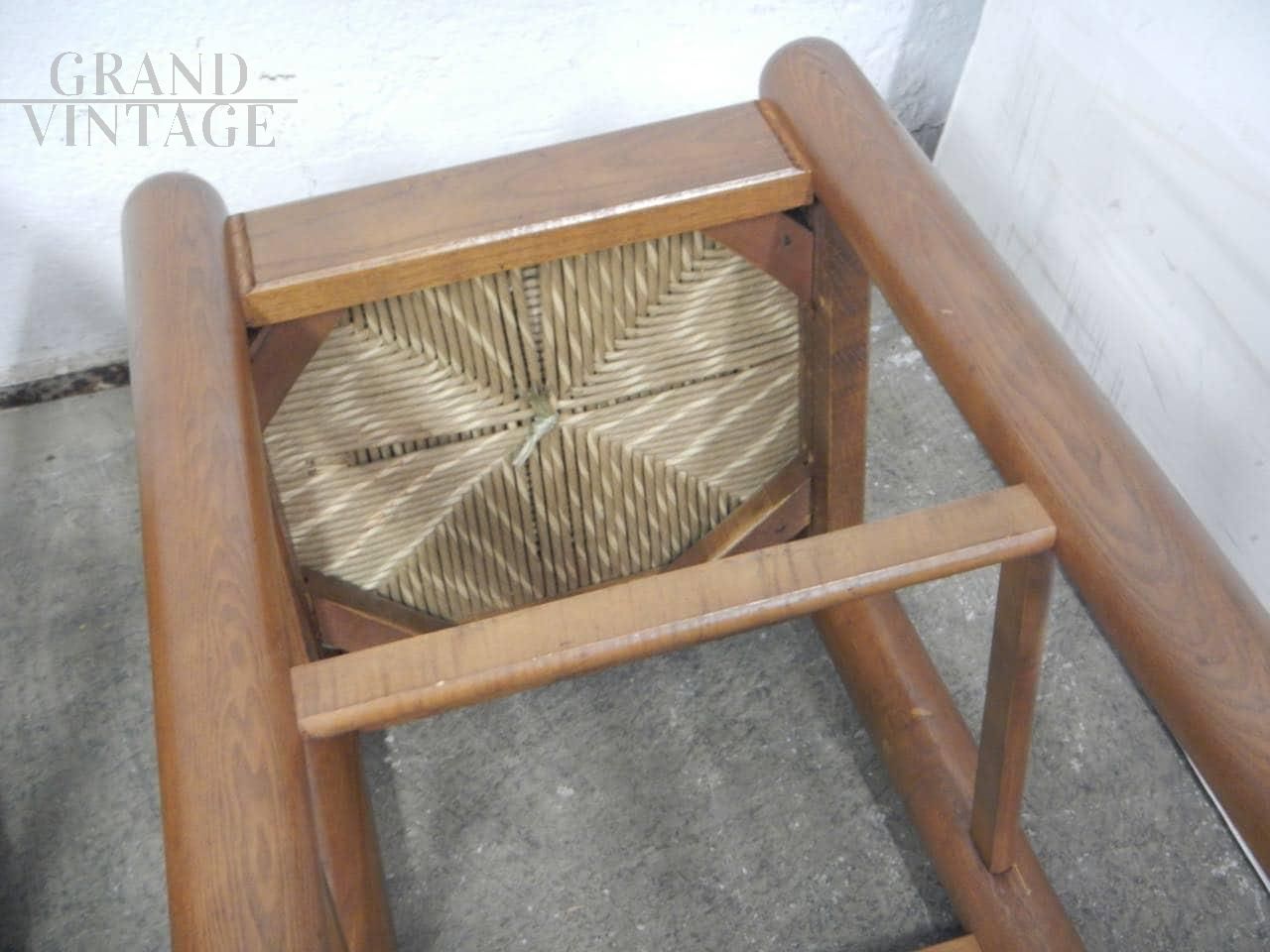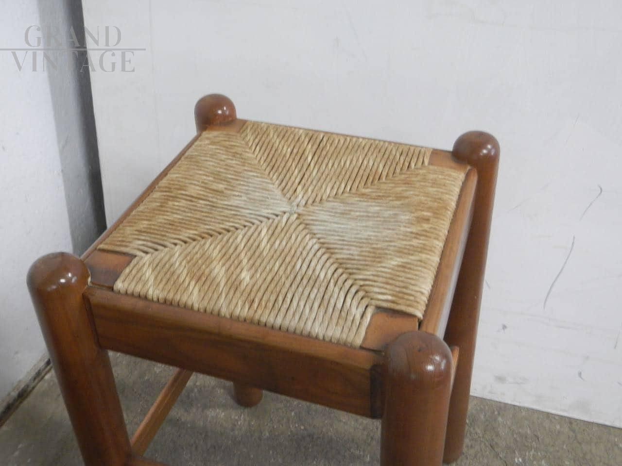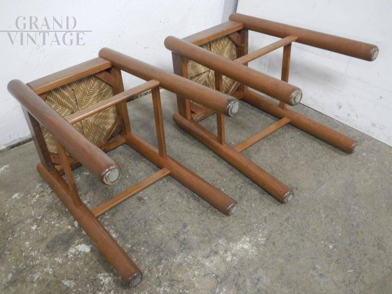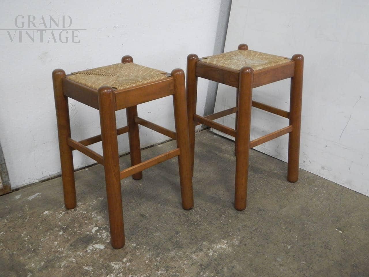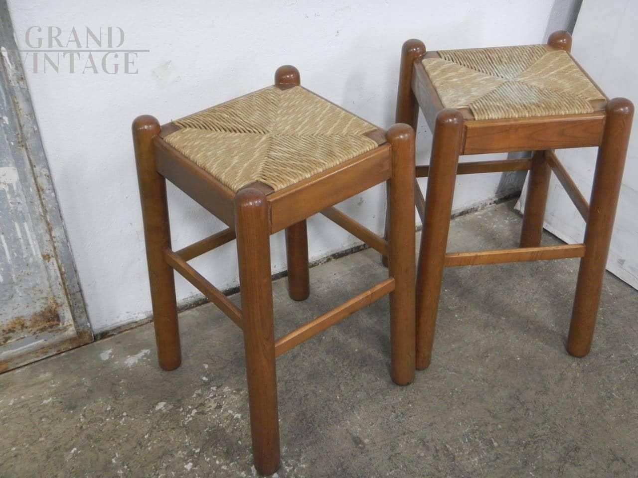 Coppia di sgabelli rustici vintage in legno di olmo colorato tinta noce con seduta in paglia intrecciata. La seduta misura 35 x 35 cm, altezza sgabelli 62 cm. In ottime condizioni, usati pochissimo.