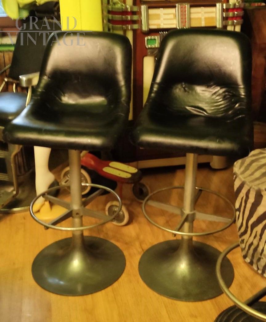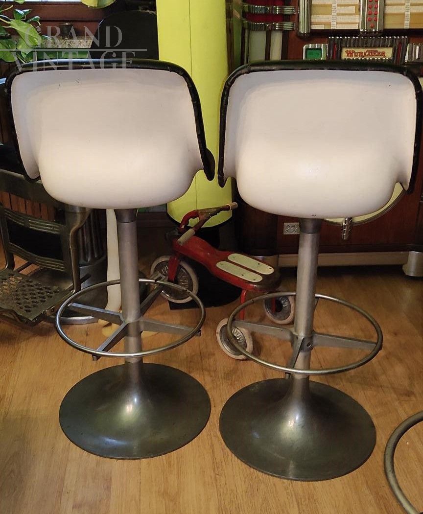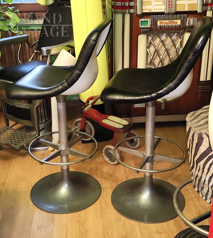 Coppia di sgabelli vintage alti modello Tulip imbottiti e rivestiti con similpelle nera, con struttura in materiale plastico su base in acciaio, completa di poggiapiedi. Buono stato di conservazione generale, presenta i naturali segni del tempo sia nell'acciaio che nel rivestimento, come da foto.