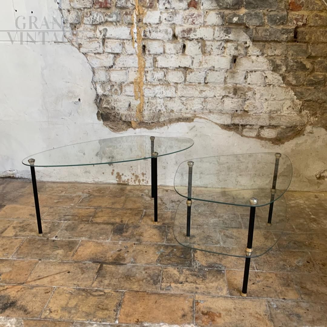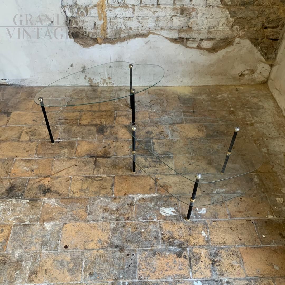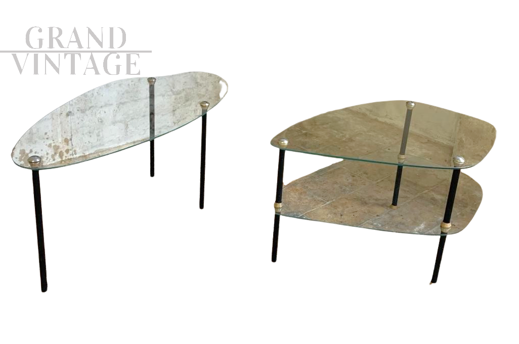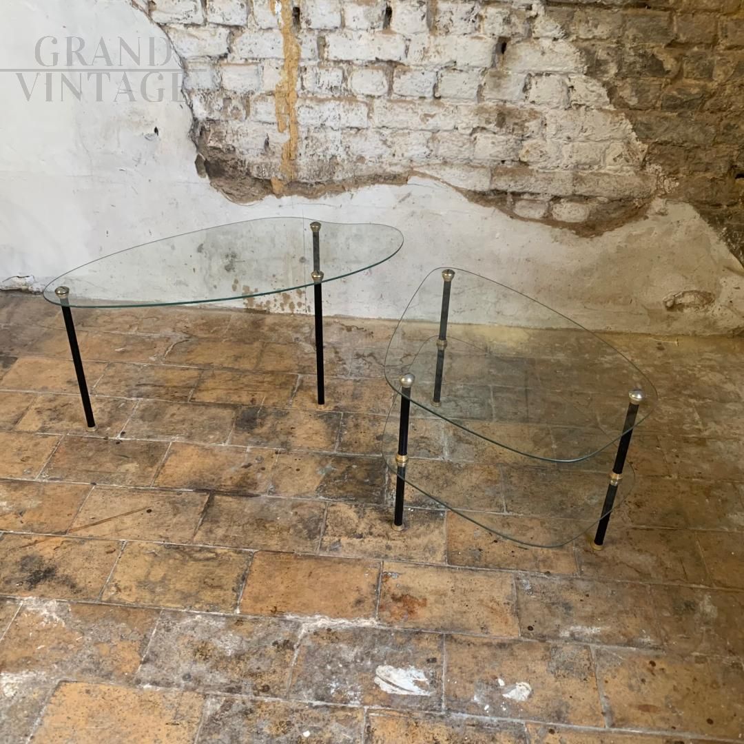 Coppia di tavolini in vetro e metallo degli anni '50, nello stile di Edoardo Paoli, originali dalla forma organica, sono anche pratici perché smontabili! In buone condizioni generali, con qualche graffio sui piani, una scheggiatura e alcune bolle d'aria nel vetro, come da foto.