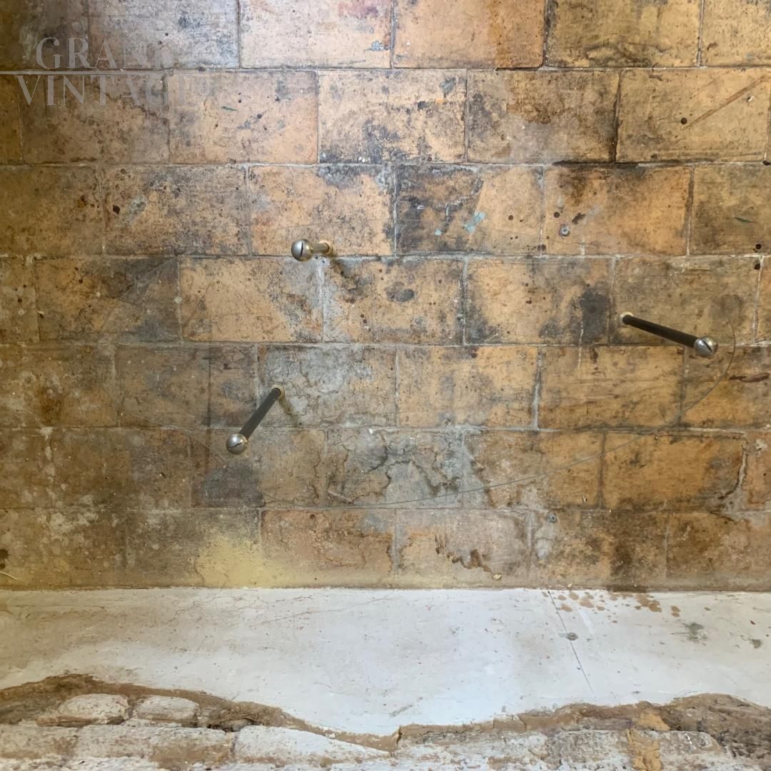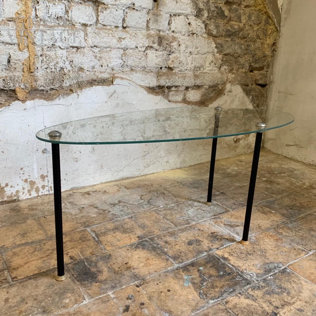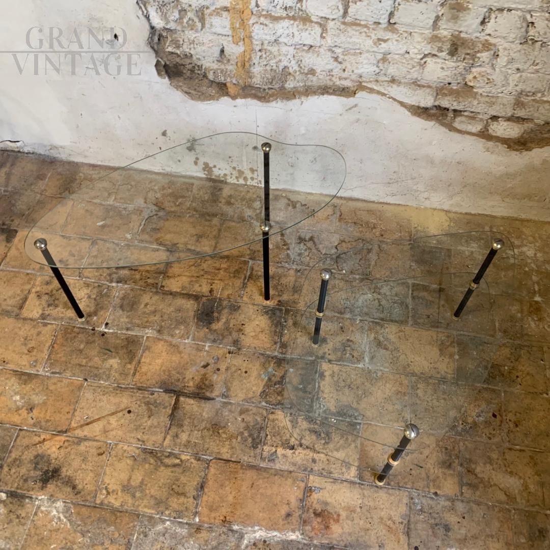 Coppia di tavolini in vetro e metallo degli anni '50, nello stile di Edoardo Paoli, originali dalla forma organica, sono anche pratici perché smontabili! In buone condizioni generali, con qualche graffio sui piani, una scheggiatura e alcune bolle d'aria nel vetro, come da foto.