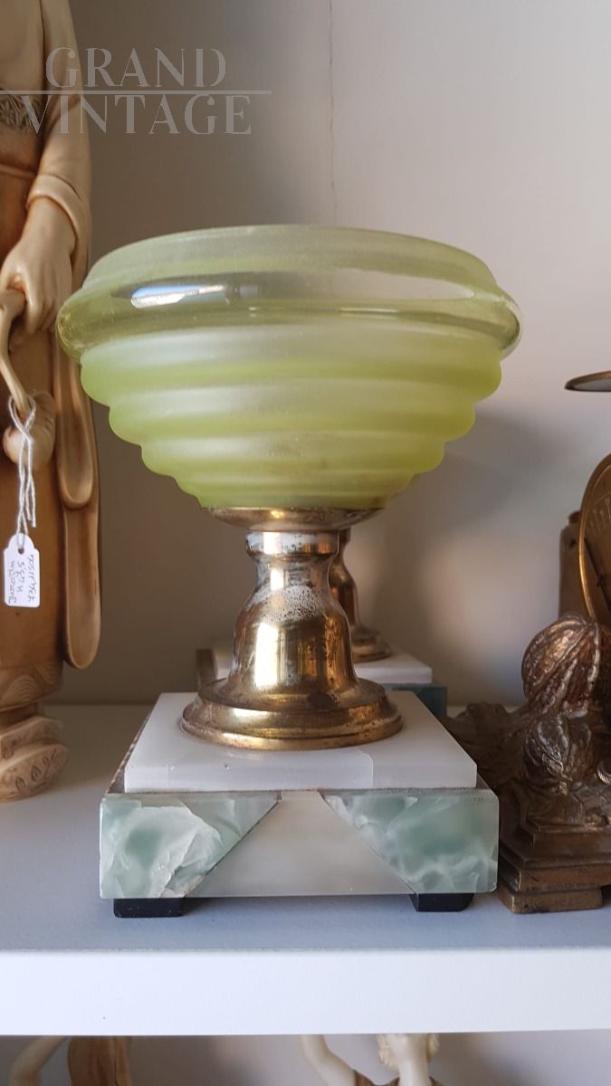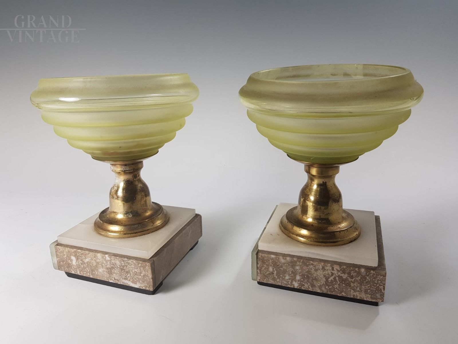 Coppia di vasi vintage anni '30 con coppa in vetro ambrato, fusto in ottone e base in marmo.