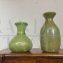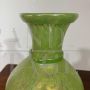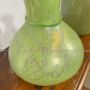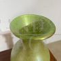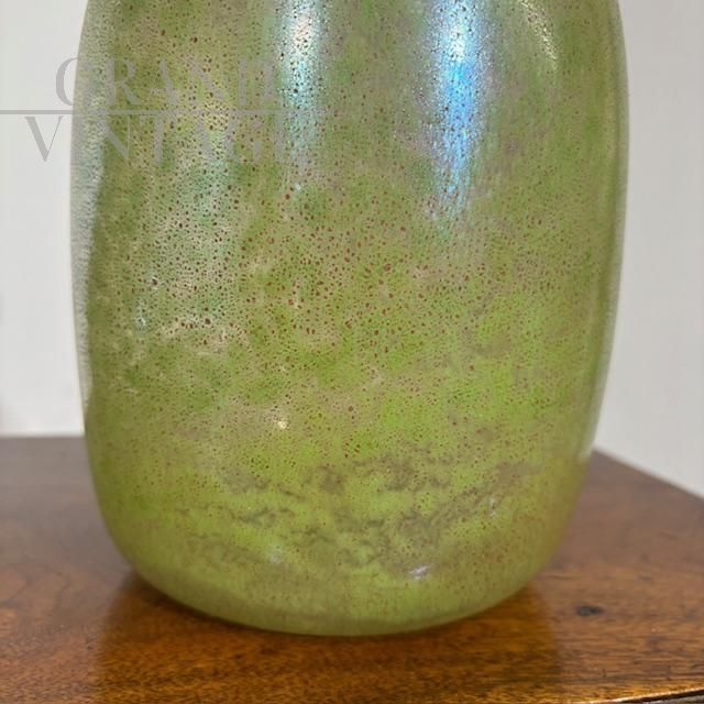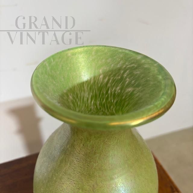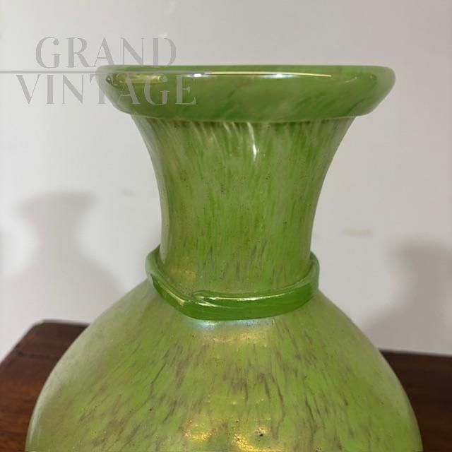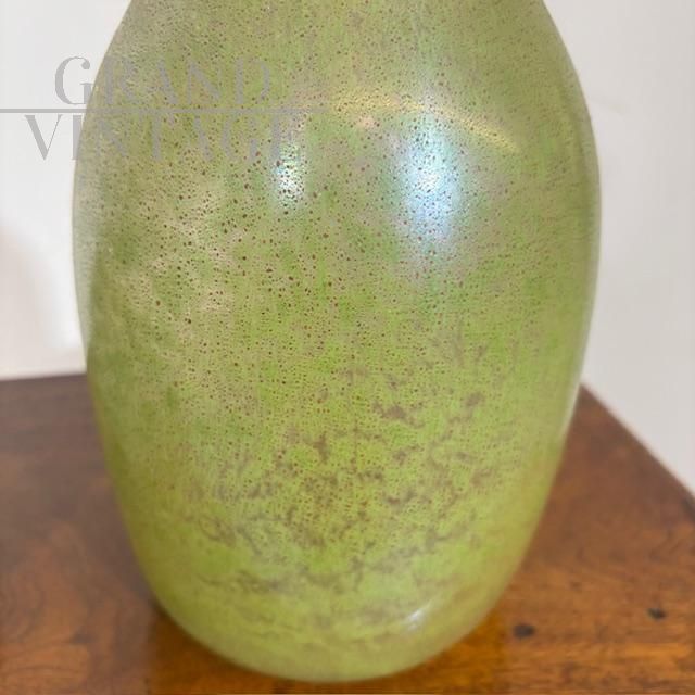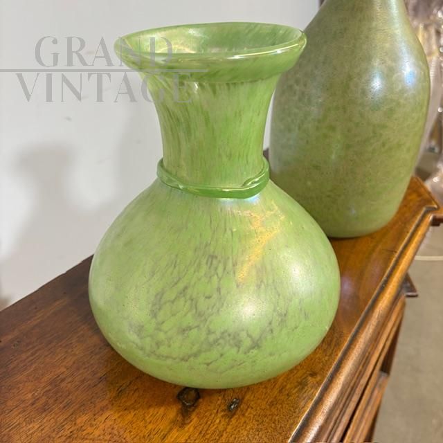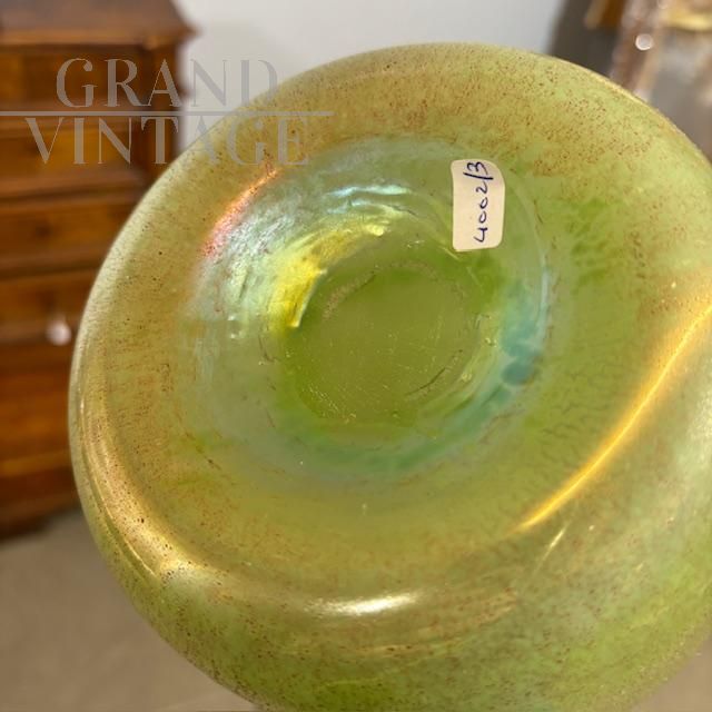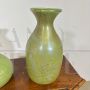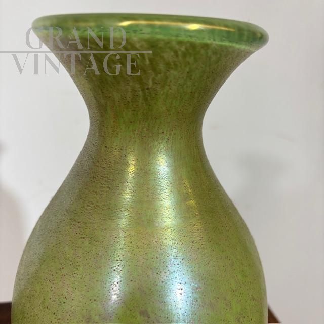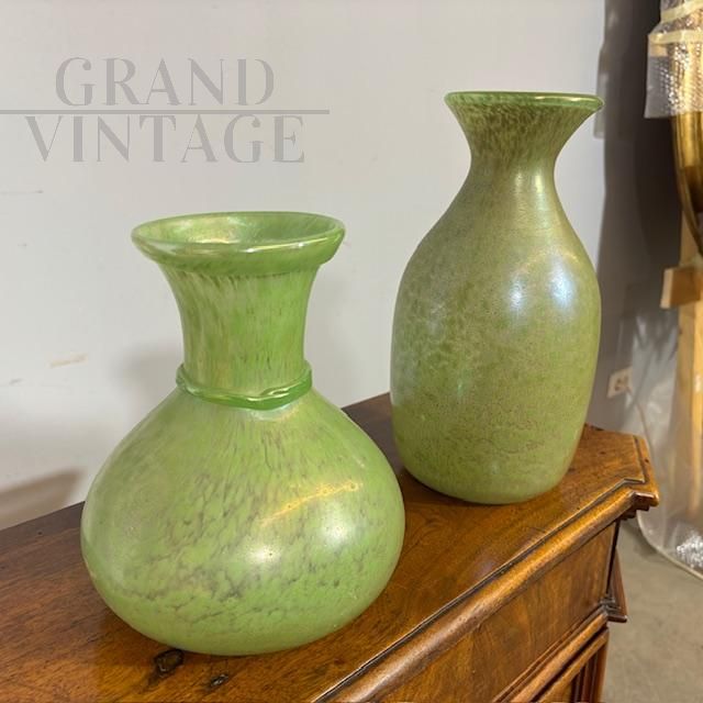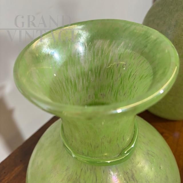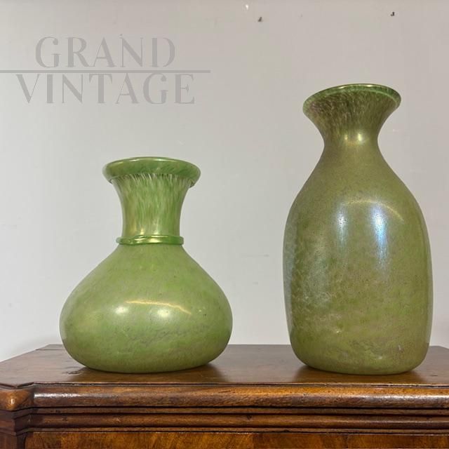 Coppia di splendidi vasi di manifattura dei Fratelli Toso in vetro artistico di Murano color verde chiaro a lustri metallici, dalle forme moderne e sinuose, mid-century italiano anni '60.