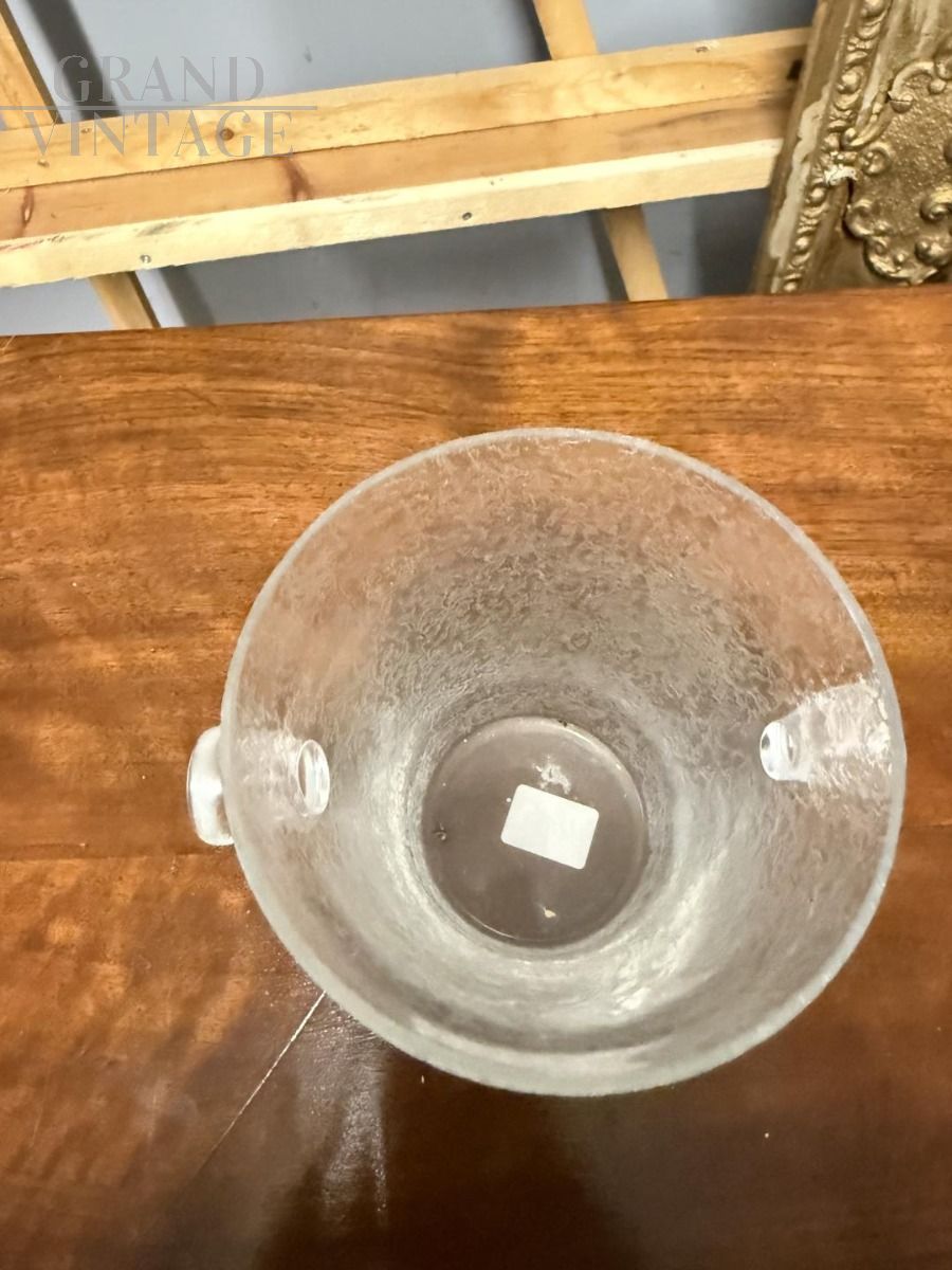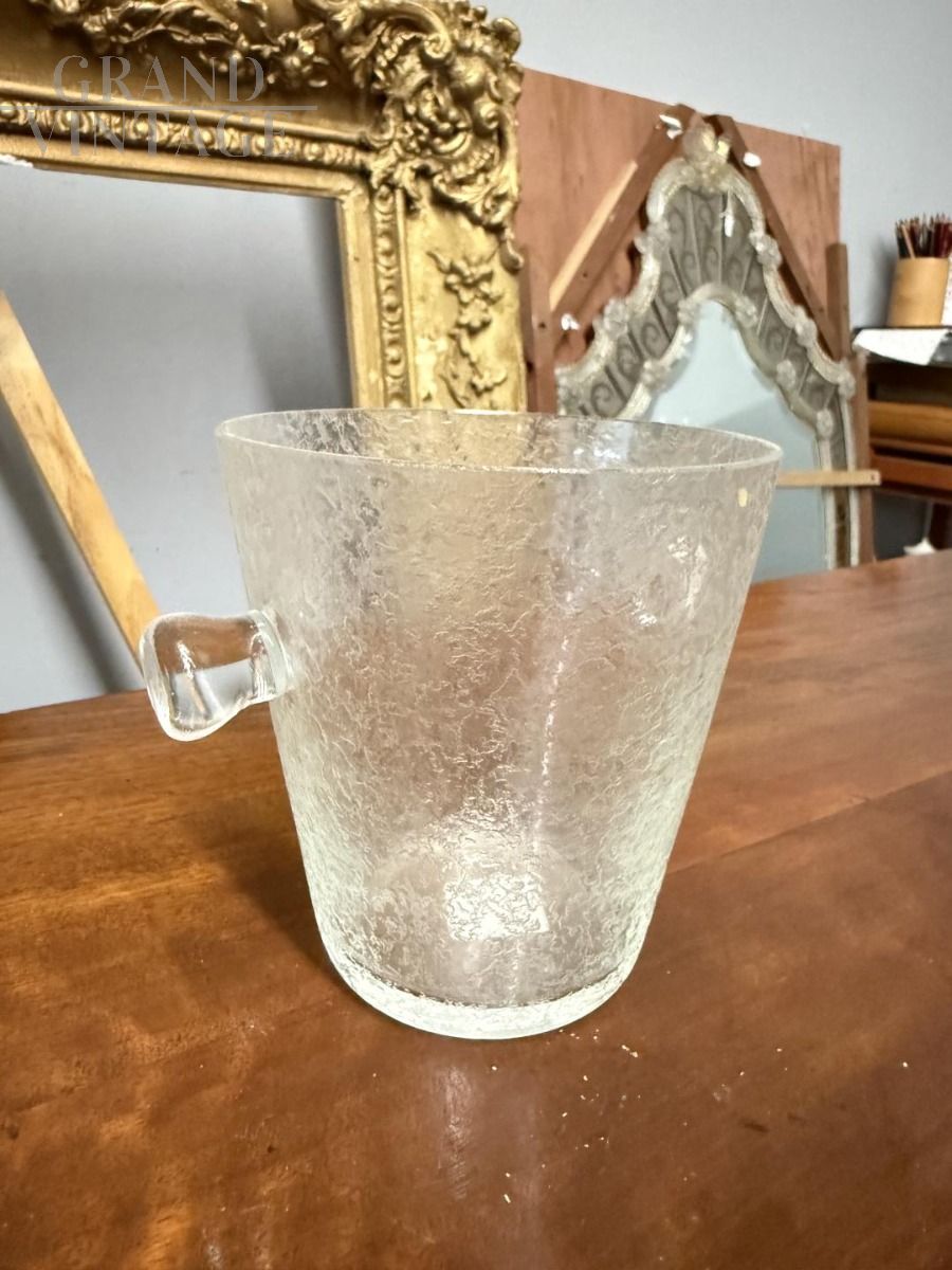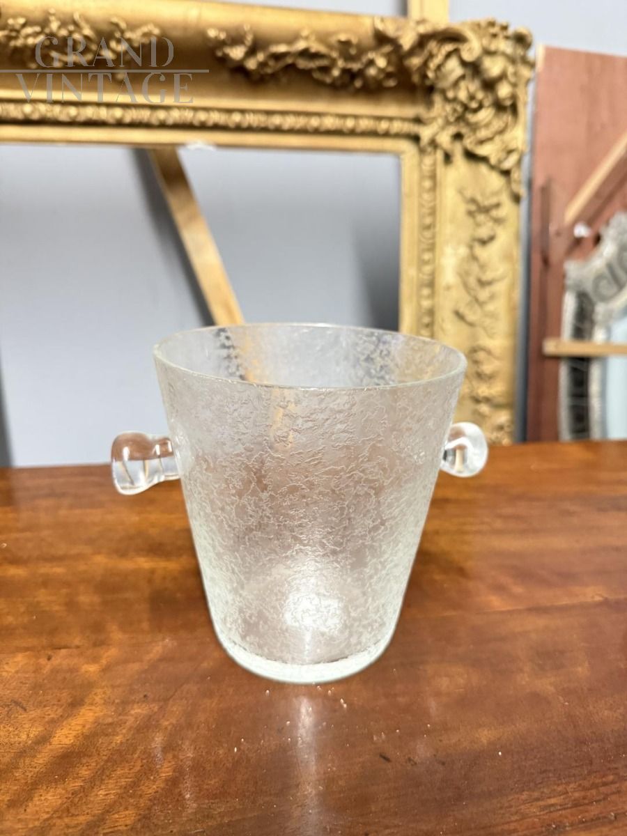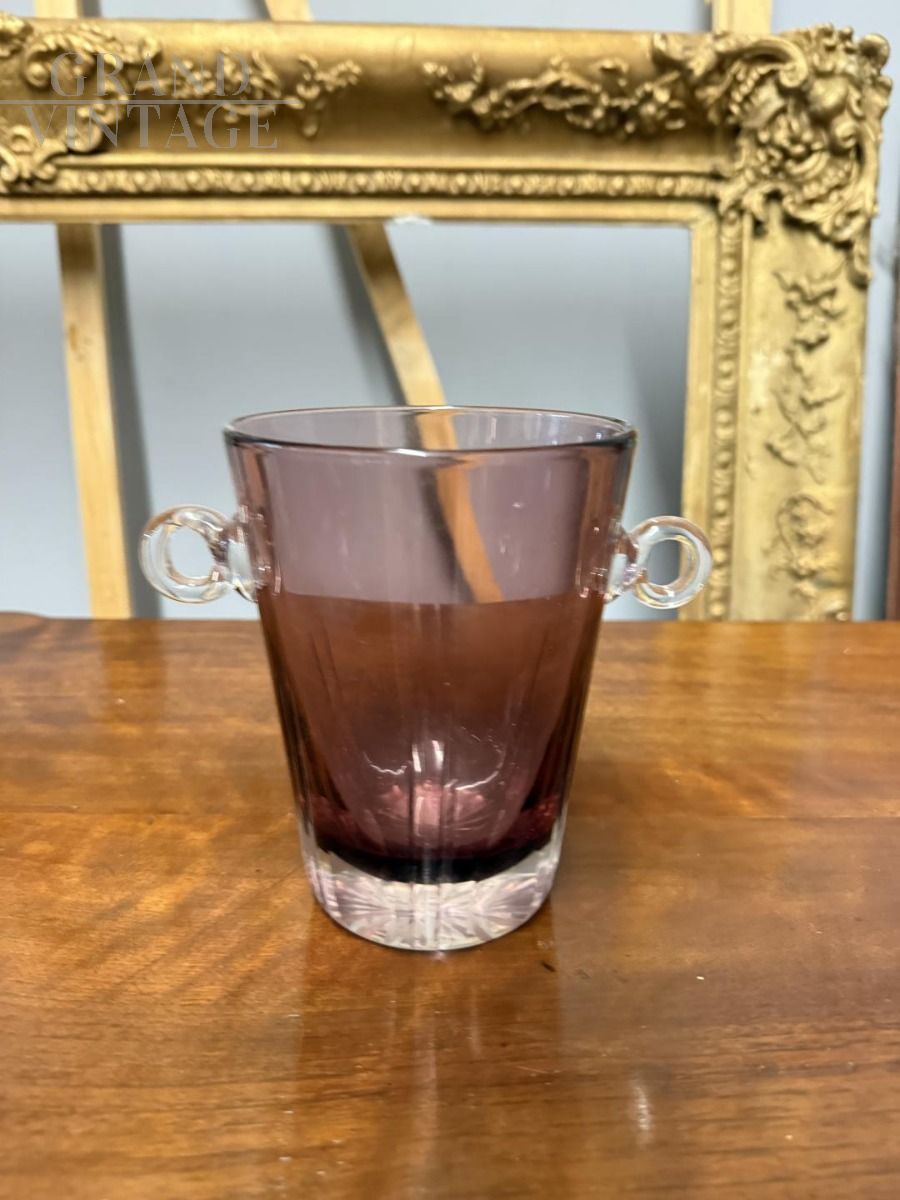 Coppia di vasi o secchielli portaghiaccio vintage in cristallo, l'uno color trasparente effetto ghiaccio craquelé e l'altro colo amaranto, Italia anni '70. Misure 14 x 18cm.