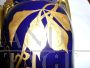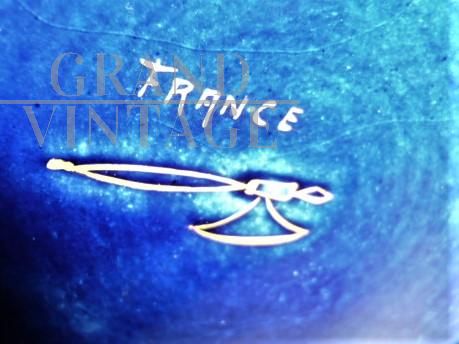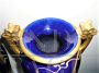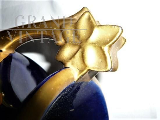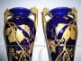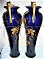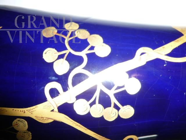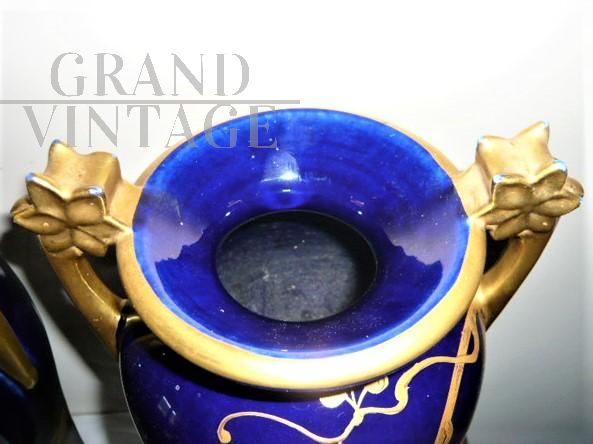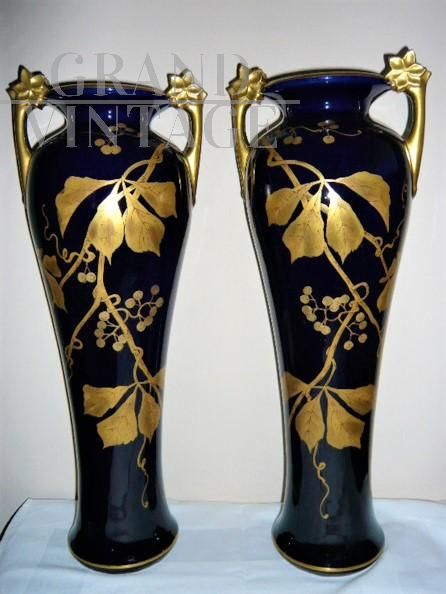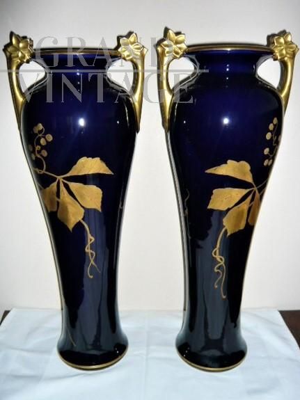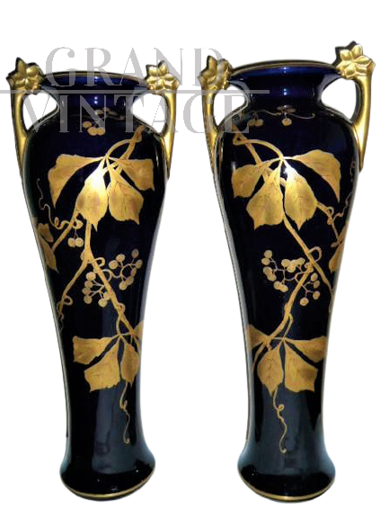 Rara e importante coppia di vasi Tours in porcellana blu con decorazioni e manici dorati, sul modello dei vasi blu di Sèvres in stile Art Nouveau, firmati con l'ascia, simbolo utilizzato dal decoratore e ceramista Gustave Asch (1856-1911) per firmare e sue opere. Manifattura di Sainte Radegonde. Decoro grafico in oro composto da foglie di castagno e castagne nel loro riccio, su fondo bleu-de-four. In perfetto stato.