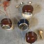 Coppia di lampade vintage da tavolo, anni '50, con struttura a faretto in metallo laccato marrone e base laccata bianca, dotate di una lastra di metallo che si può calare sul punto luce per schermare e diffondere nell'ambiente la luce diretta.