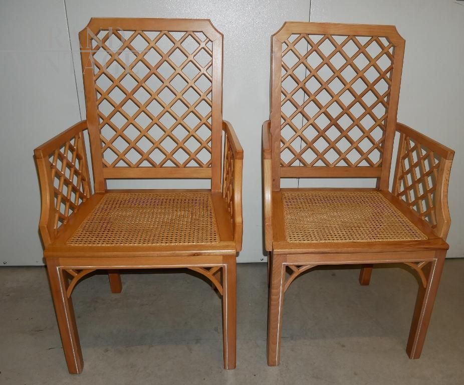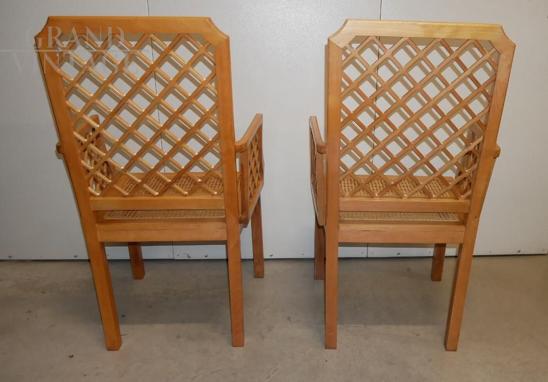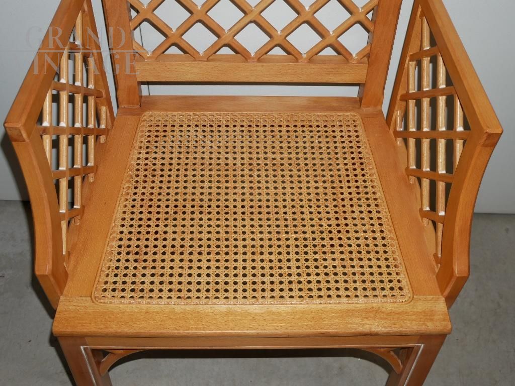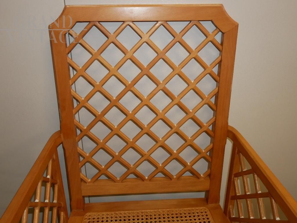 Coppia di poltrone vintage in stile coloniale in legno di faggio color miele con seduta in paglia di Vienna, mai utilizzate, in perfetto stato.