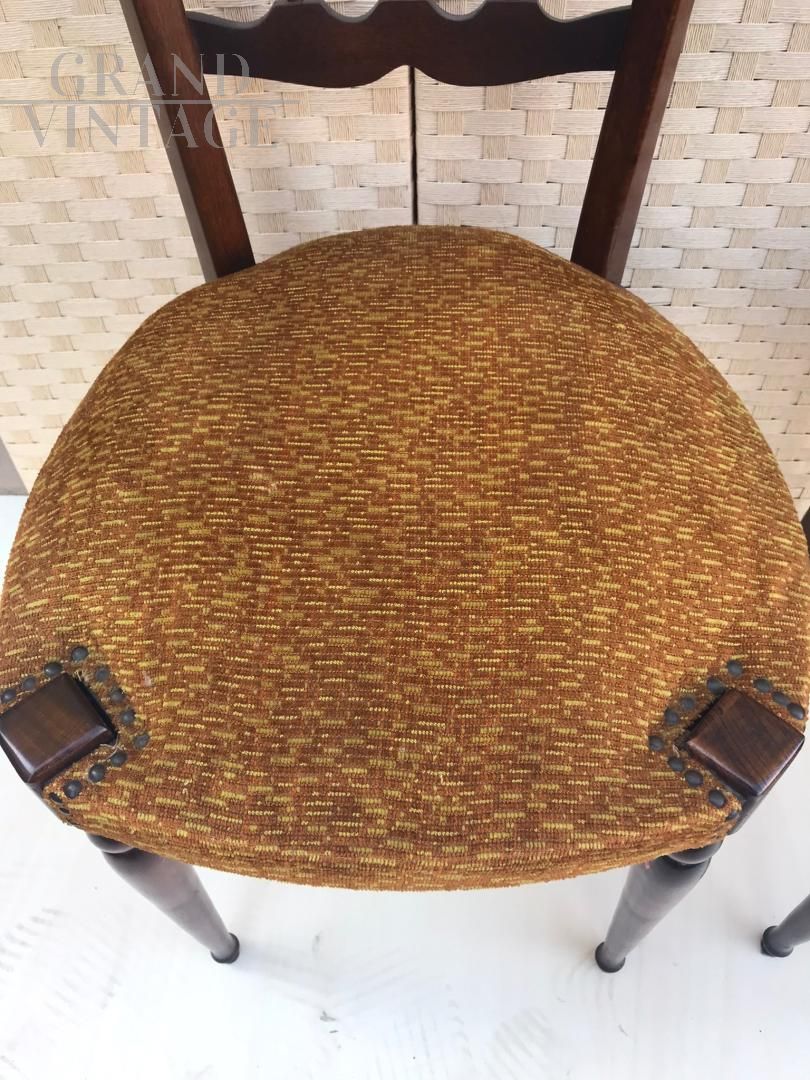 Coppia di sedie Chiavarine con schienale alto, anni '50, in legno di faggio tornito e sedute con tessuto originale. Queste sedie erano un tipico arredo da ingresso, spesso a corredo di una consolle e di un appendiabiti.