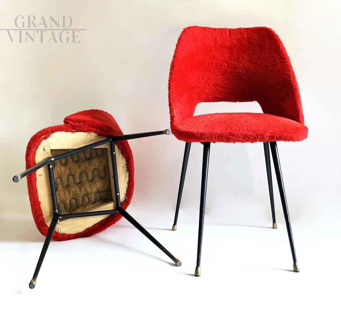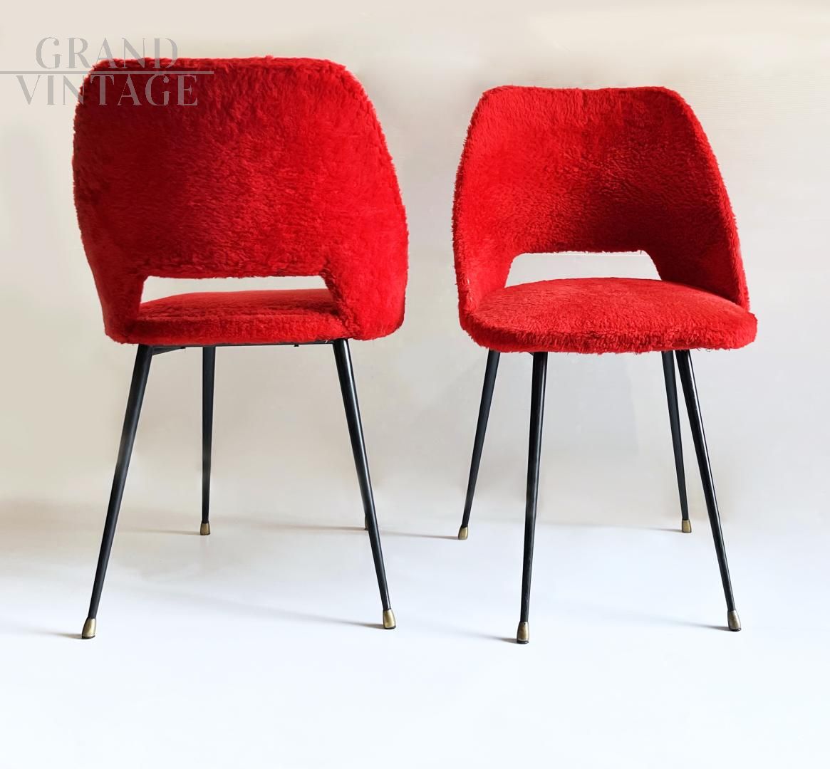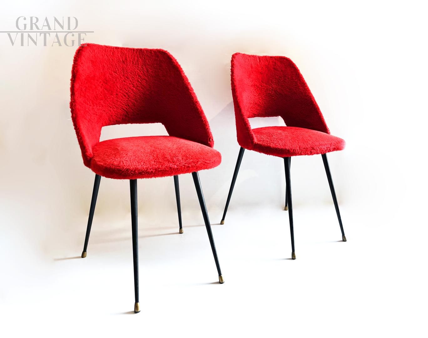 Coppia di sedie poltroncine modernariato anni '70 rivestite in tessuto teddy con pelliccia rossa, originale dell'epoca, e con dettaglio dei piedini in ottone. La linea di gusto scandinavo ricorda le sedie iconiche di Eero Saarinen.