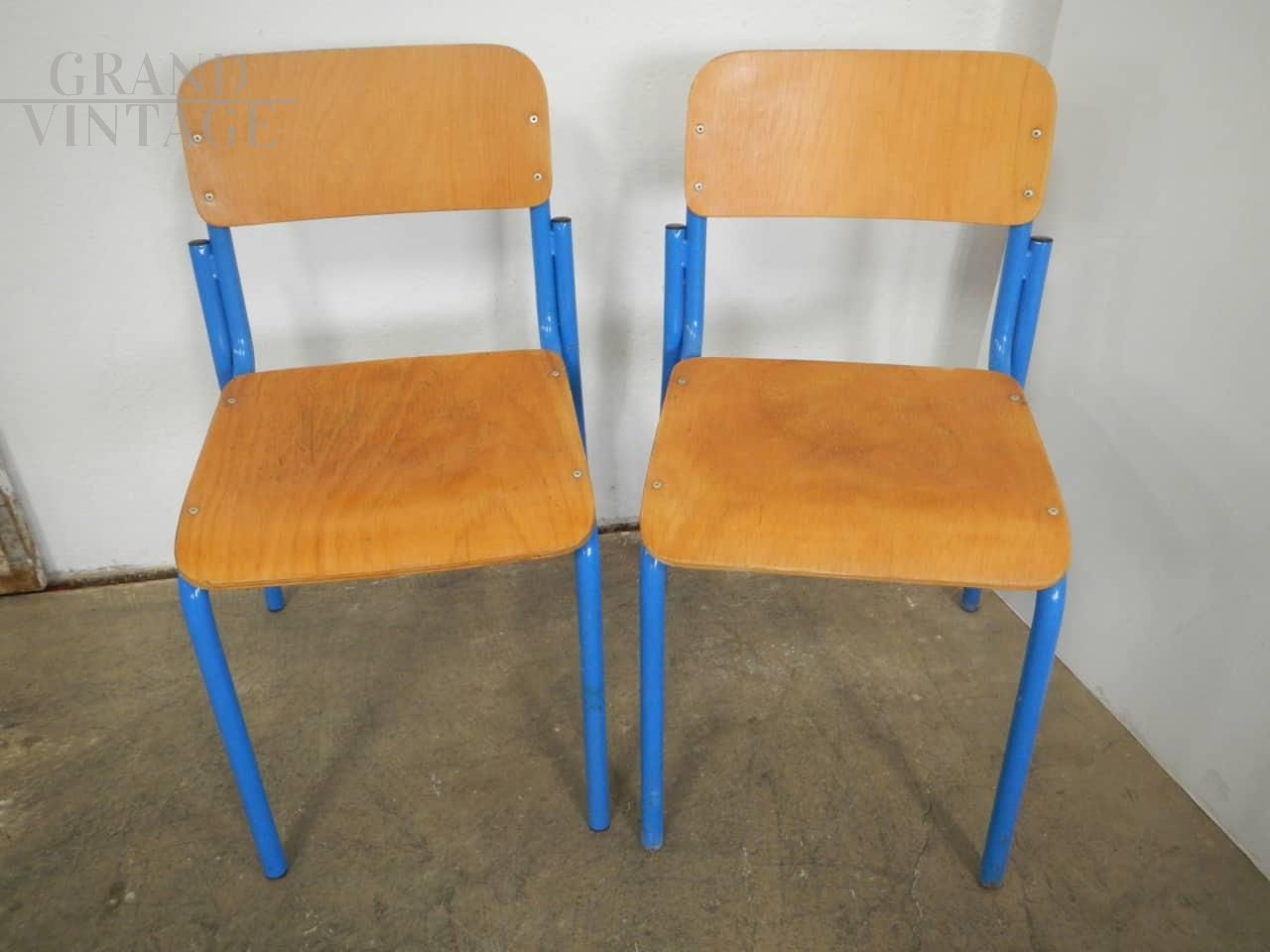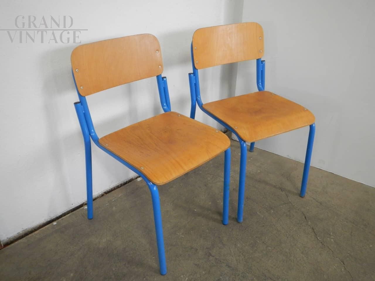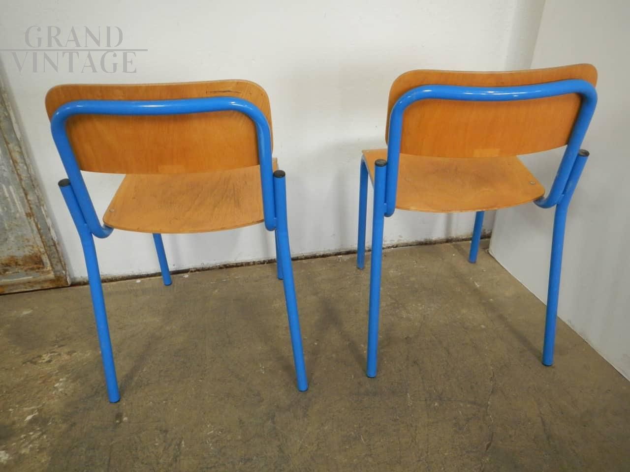 Coppia di sedie scolastiche vintage in tubo metallico laccato blu, con seduta e schienale in legno di faggio, anni '80.