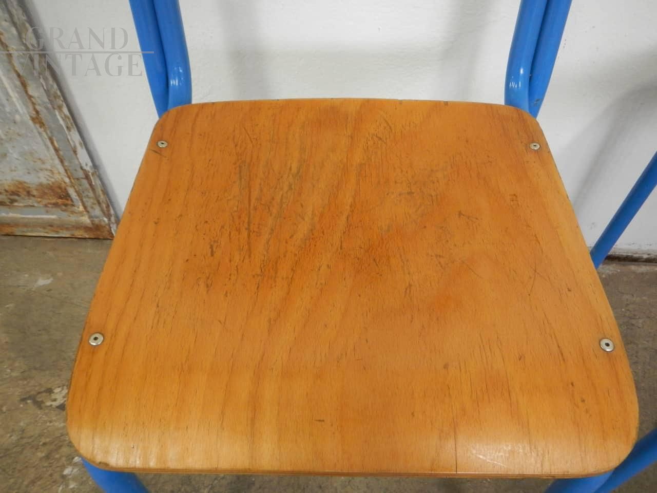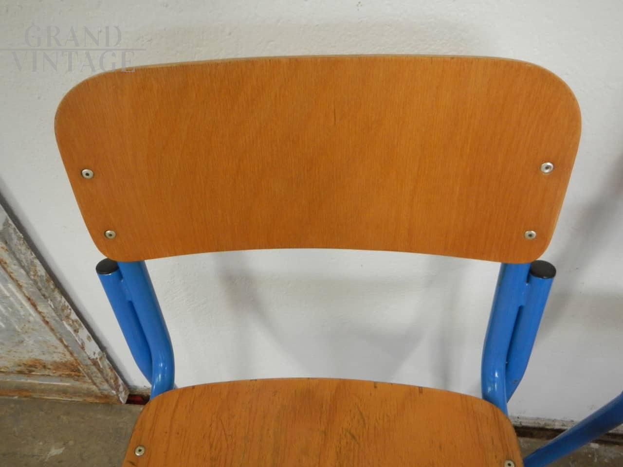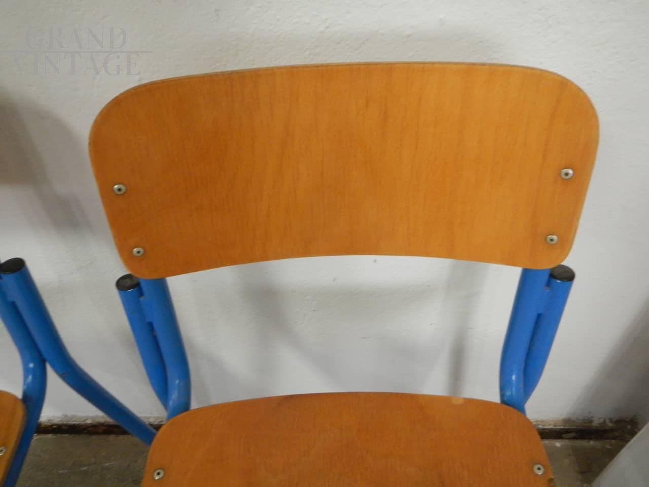 Coppia di sedie scolastiche vintage in tubo metallico laccato blu, con seduta e schienale in legno di faggio, anni '80.