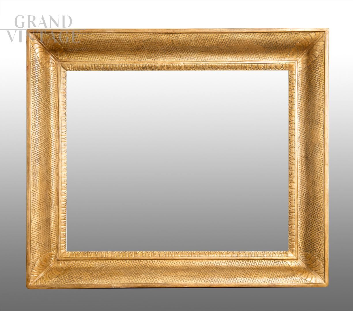 Cornice antica Impero Napoletana in legno dorato e intagliato appartenente alla prima decade del XIX secolo. I quattro angoli sono esaltati da quattro grandi foglie che denotano epoca e provenienza. Tutta la struttura è impreziosita da tre ordini di intaglio alternati tra palmette e rombi tipici del periodo Impero di appartenenza. La doratura è oro a foglie 24kt su strato di bolo Armeno.