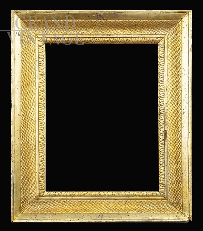 Cornice antica Impero Napoletana in legno dorato e intagliato appartenente alla prima decade del XIX secolo. Tutta la struttura è impreziosita da tre ordini di intaglio a palmette tipiche del periodo Impero di appartenenza. La doratura è oro a foglie 24kt su strato di bolo Armeno. Provenienza: Napoli inizi XIX secolo.