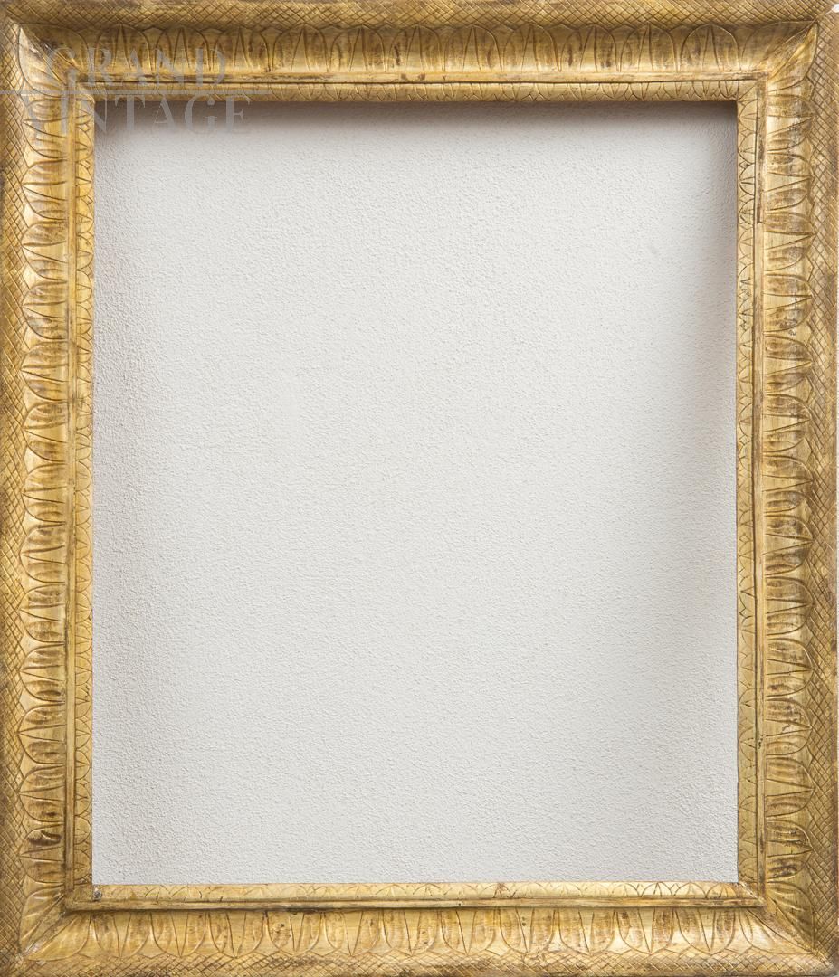 Cornice antica Impero Napoletana in legno dorato e intagliato appartenente agli inizi del XIX secolo. Tutta la struttura è impreziosita da tre ordini di intaglio a palmette tipiche del periodo Impero di appartenenza. La doratura è oro a foglie 24kt su strato di bolo Armeno. Provenienza: Napoli inizi XIX secolo.