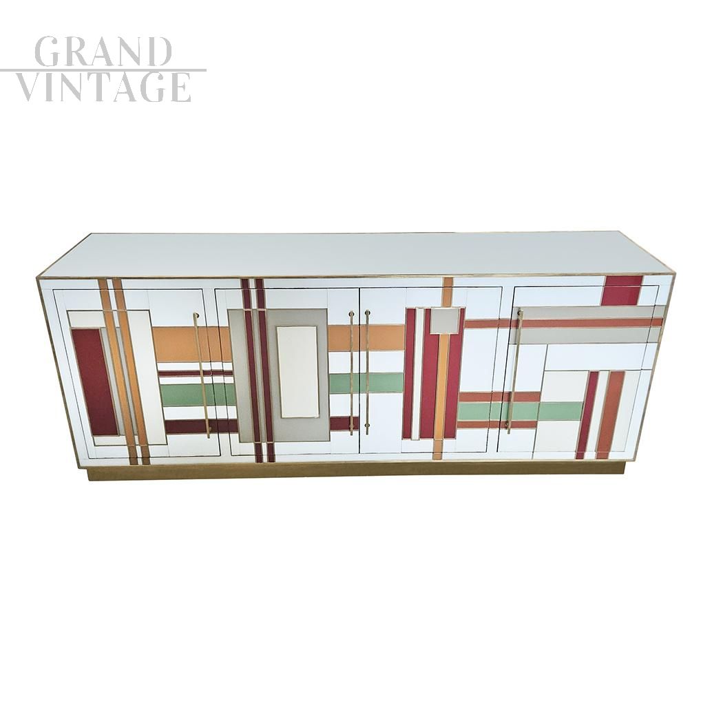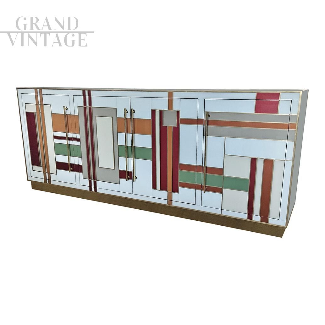 Credenza a 4 ante in vetro bianco con sezioni colorate e ottone