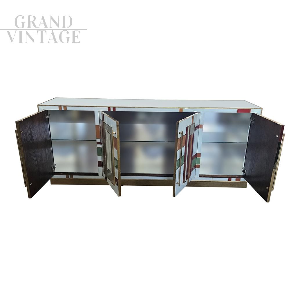 Bellissima credenza a quattro ante, interamente realizzata a mano, con struttura in legno e rivestita in tasselli di vetro colorato. l'interno è interamente specchiato con un ripiano in vetro. La base è di ottone.